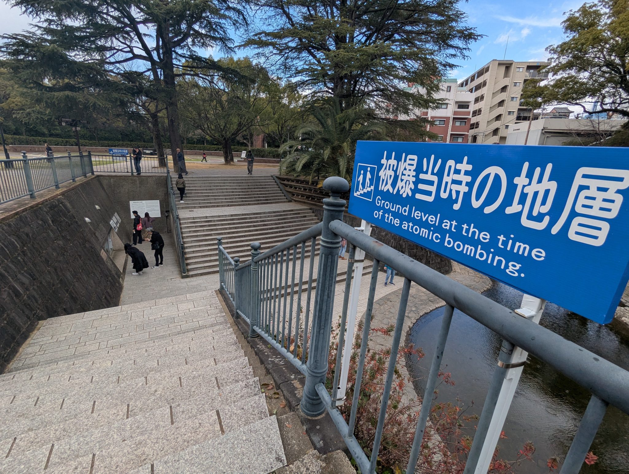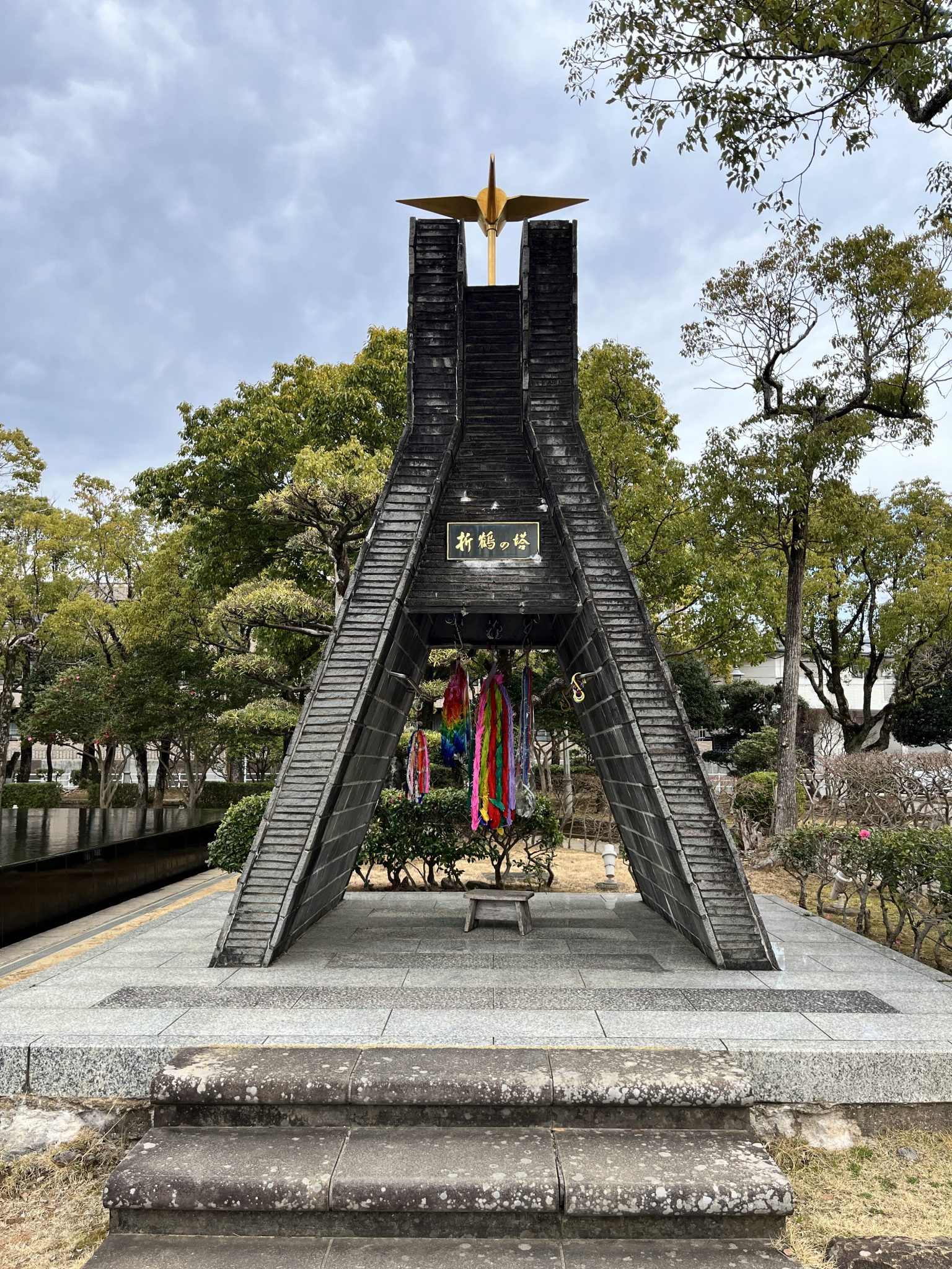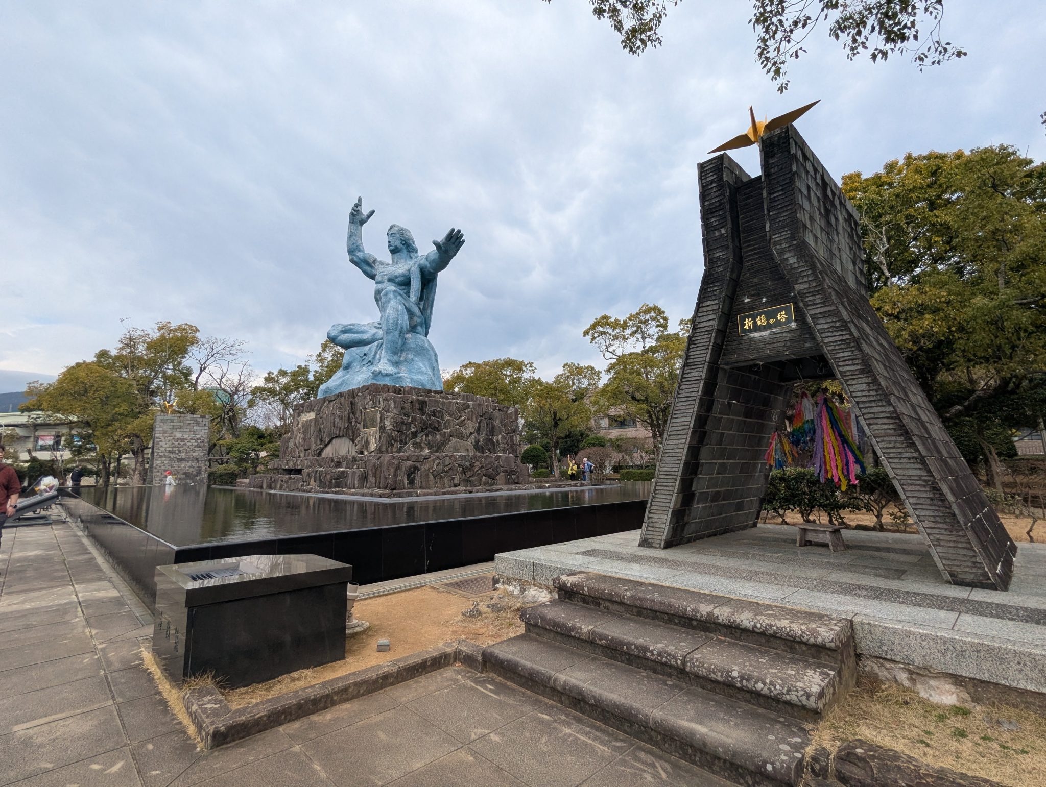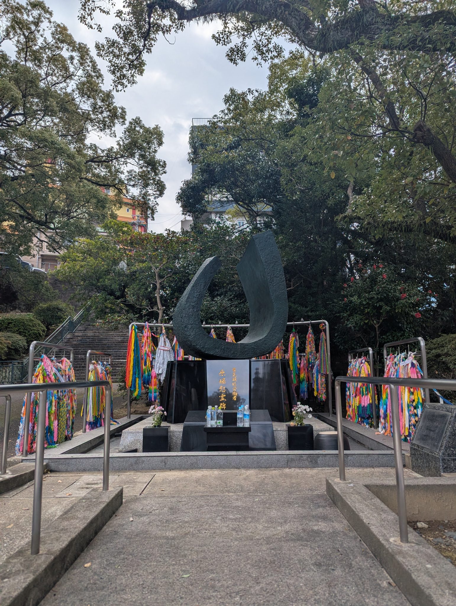 One of the most striking monuments is the Peace Memorial Statue and the Tower of Paper Cranes. The statue is very unique and sits prominently at the centre of the park. The statue has the right hand pointing to the bomb and the left hand towards peace. Right beside the statue is the Tower of paper cranes. It’s a sheltered tower with colourful hanging paper cranes inside it. The entire monument and park is very different from the Hiroshima Peace Park and offers a bit of a different perspective to that one. We spend an hour or two walking around the park to take it all in before heading back down the escalators.