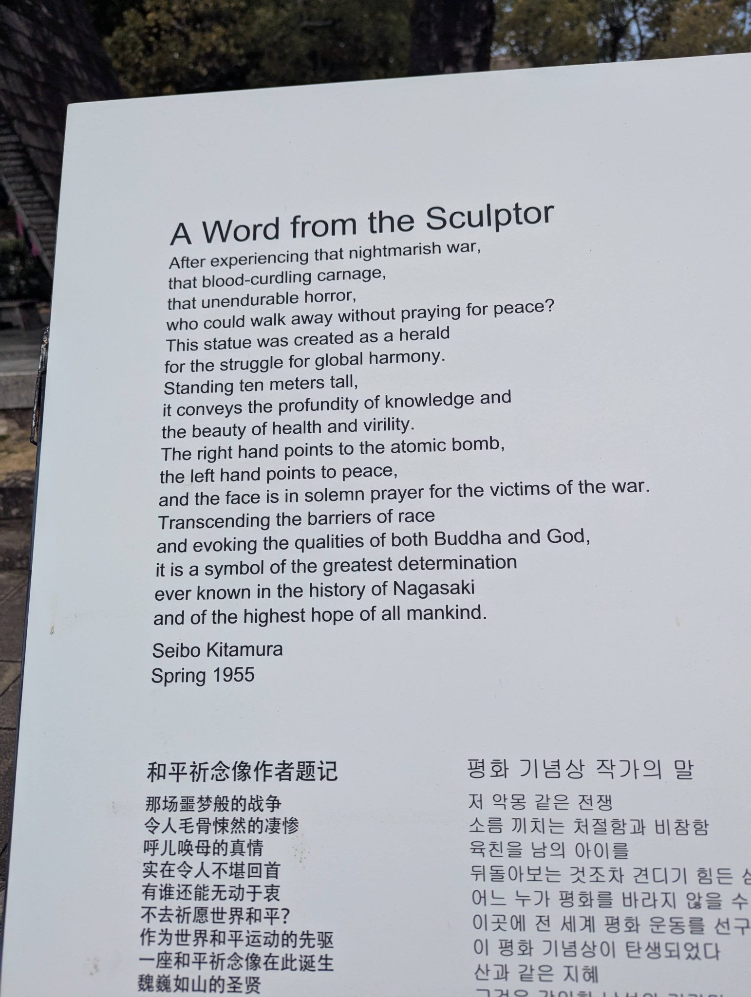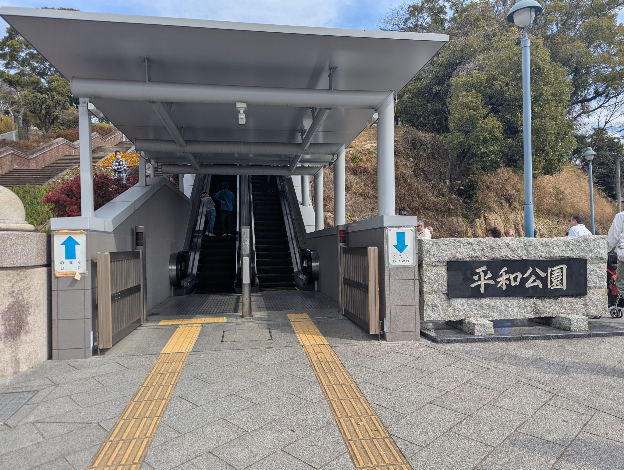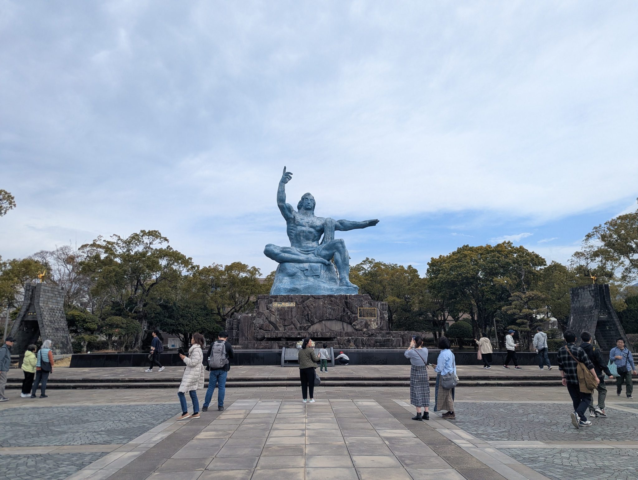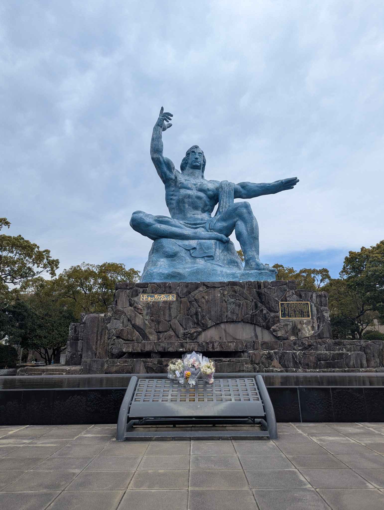 One of the most striking monuments is the Peace Memorial Statue and the Tower of Paper Cranes. The statue is very unique and sits prominently at the centre of the park. The statue has the right hand pointing to the bomb and the left hand towards peace. Right beside the statue is the Tower of paper cranes. It’s a sheltered tower with colourful hanging paper cranes inside it. The entire monument and park is very different from the Hiroshima Peace Park and offers a bit of a different perspective to that one. We spend an hour or two walking around the park to take it all in before heading back down the escalators.