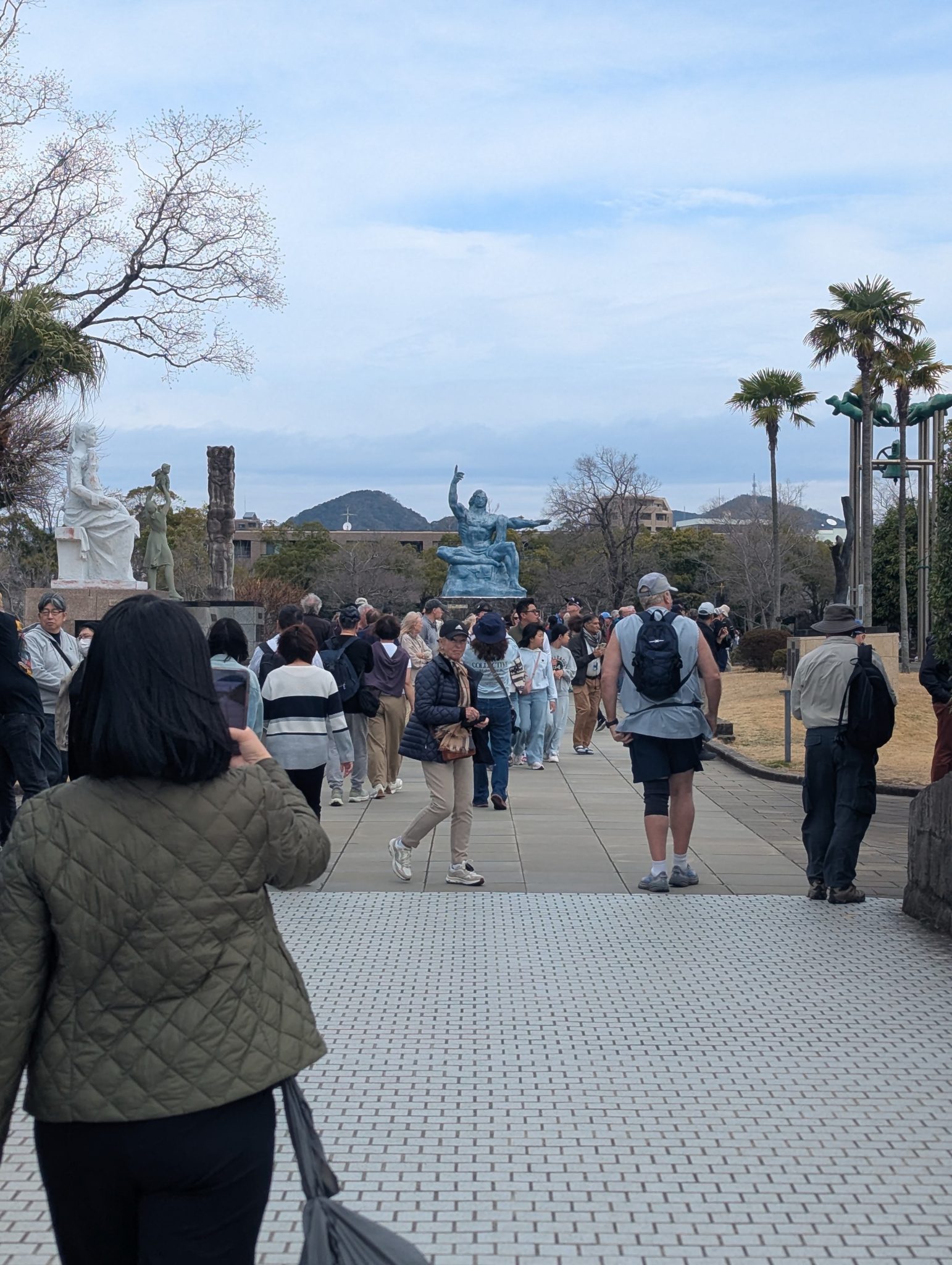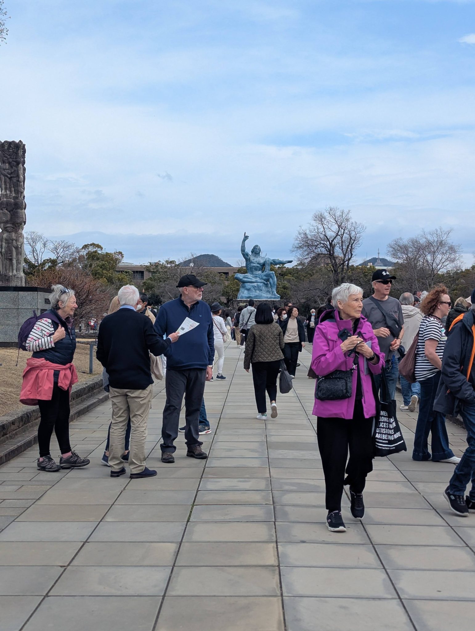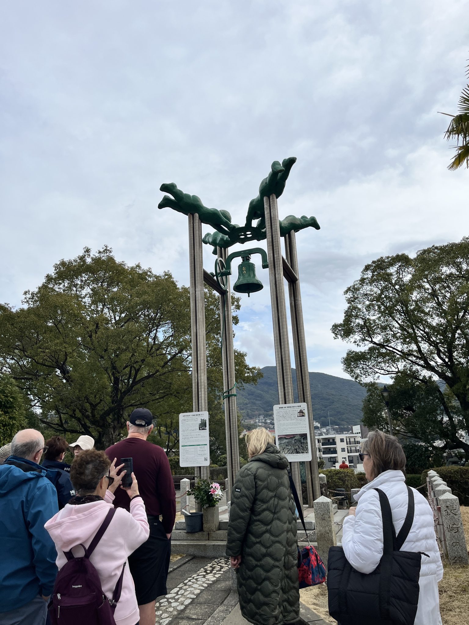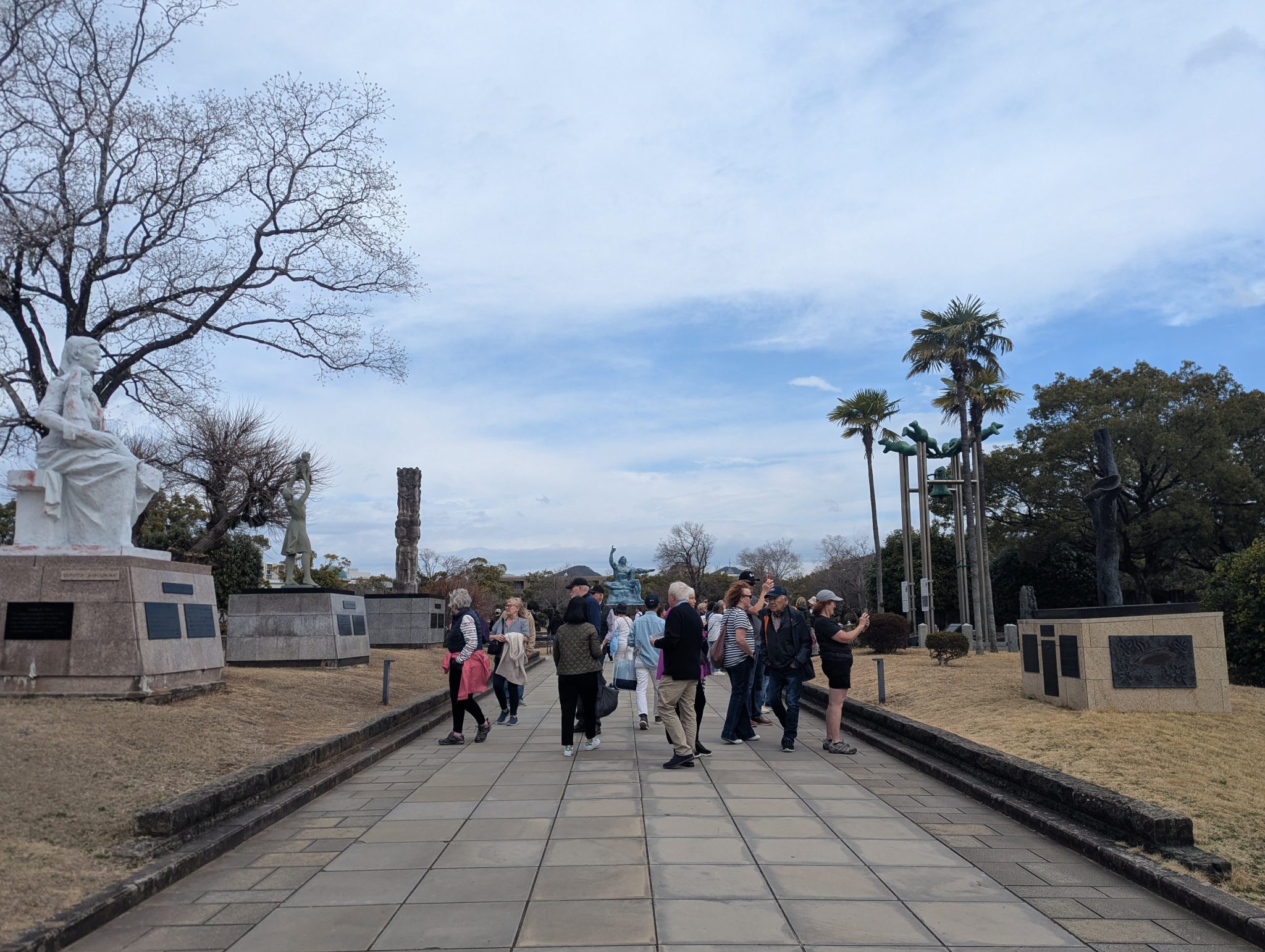 Today our cruise takes us to Nagasaki. It’s a place none of us have to before, so we are all looking forward to the visit. After our now-routine breakfast on board we disembark the boat and make our way through the pretty port of Nagasaki. As Nagasaki is the other nuclear bombing site, our family is curious to see how the event is memorialized here. We hop onboard one of the city trams and make our way to the Peace Park.
