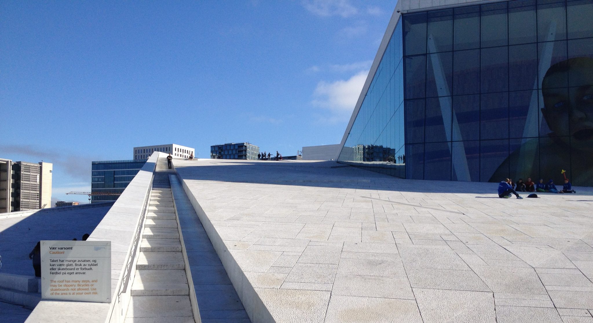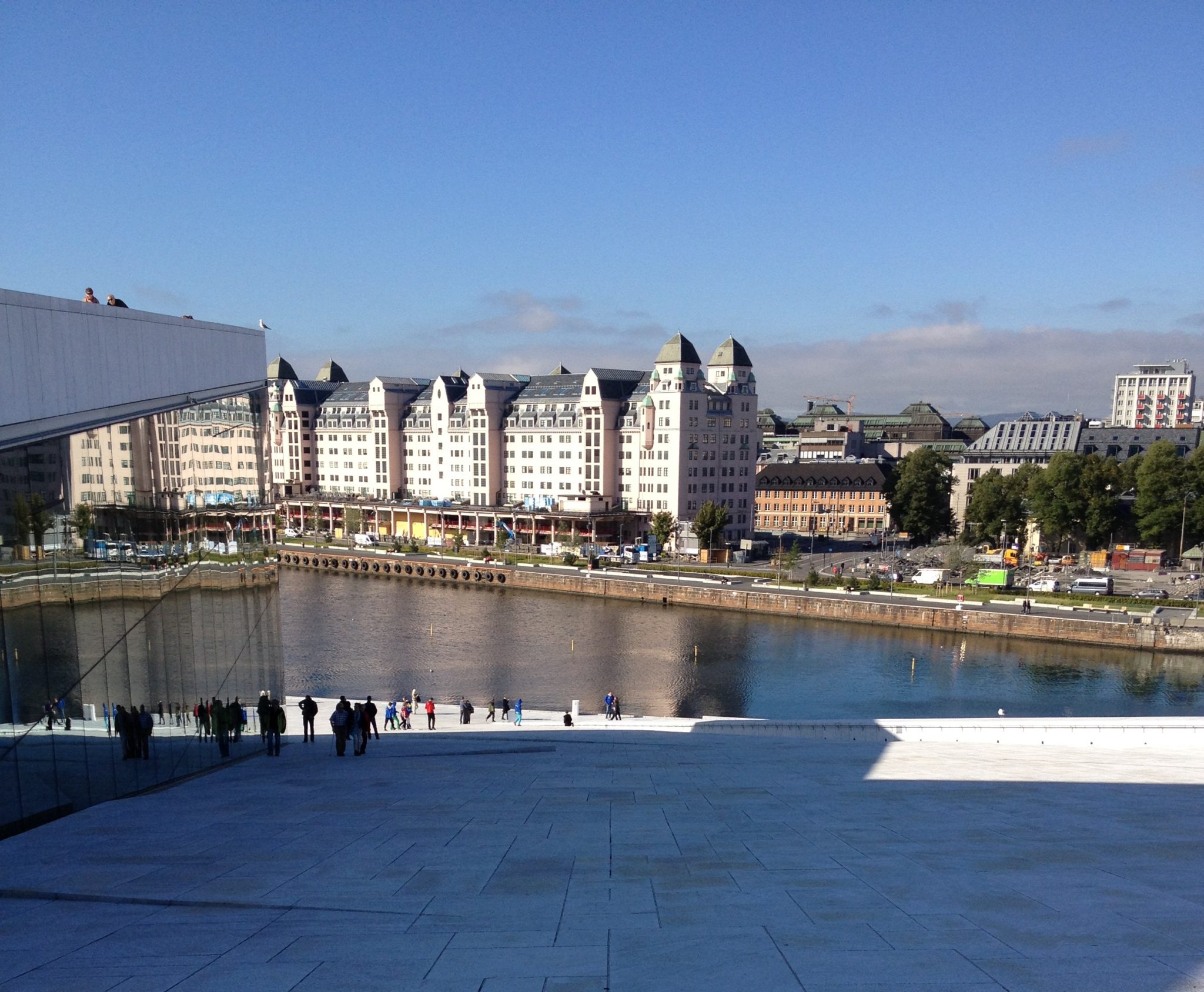 Early the next day we set out to explore Oslo after a quick breakfast. We walked towards the water and ended up at the Oslo Opera House. This is a beautifully designed structure with lots of very cool angles that you could walk and climb. We spent an hour or two here walking up, down and inside the building admiring the surrounding views from the top.