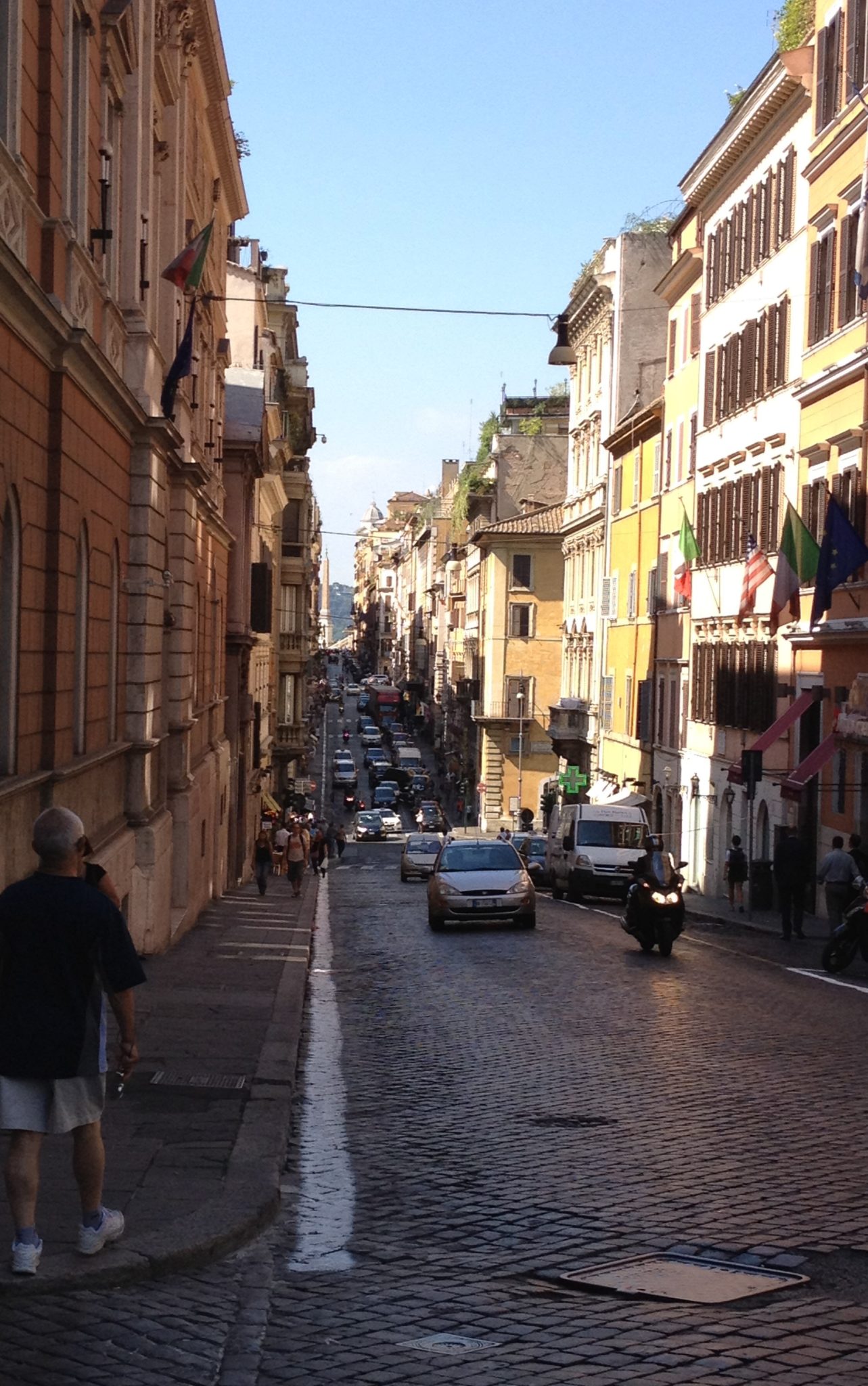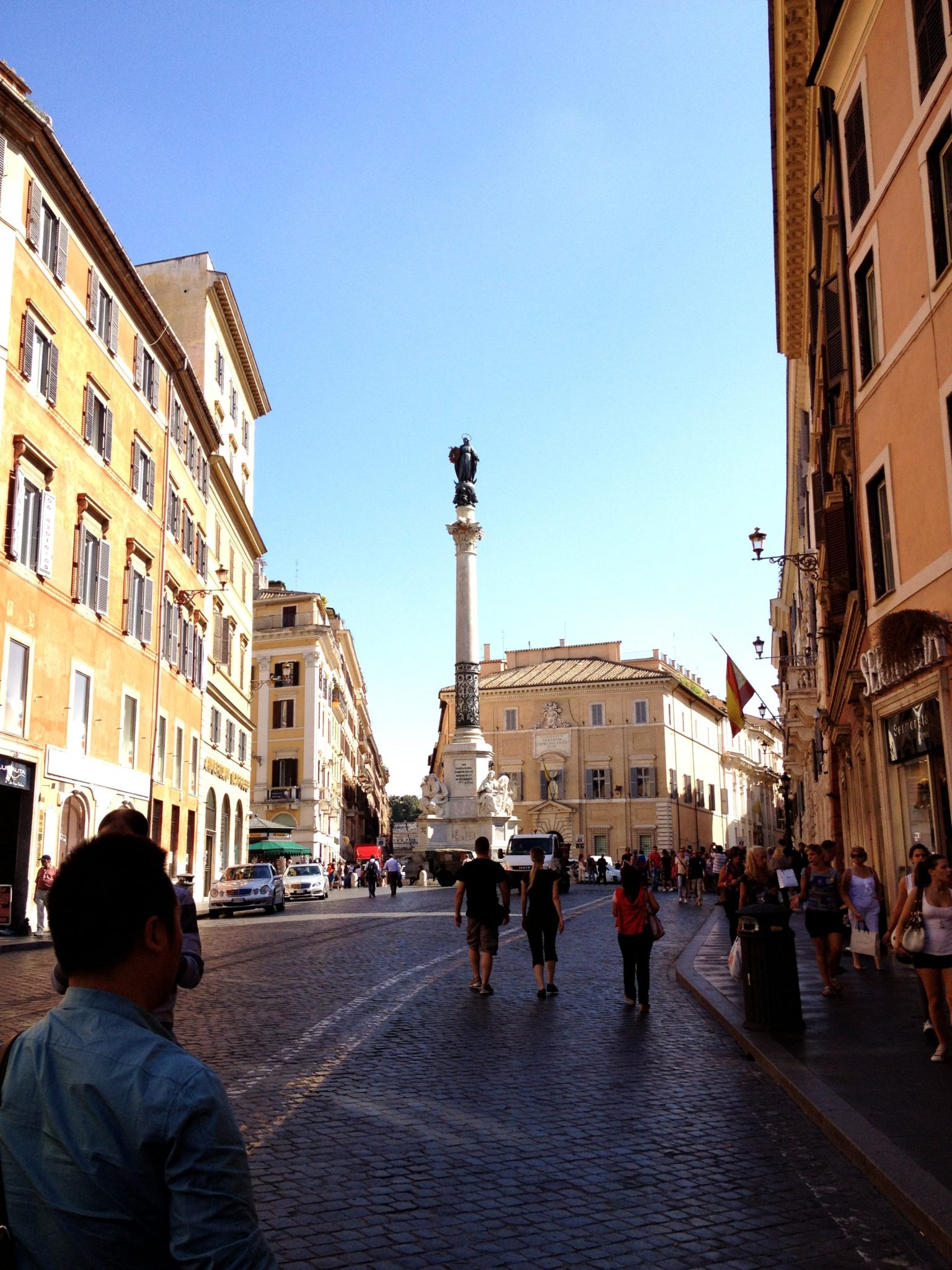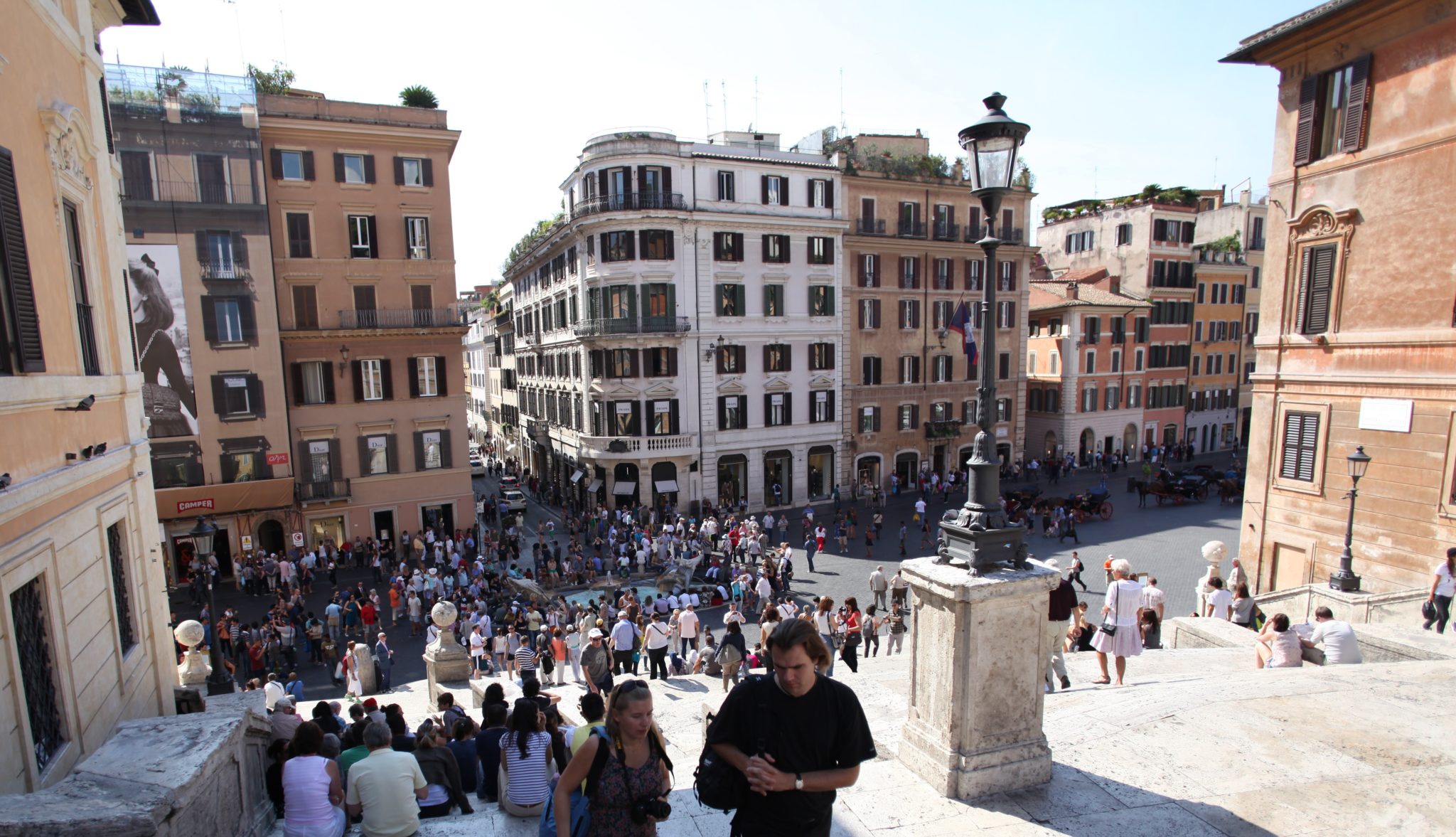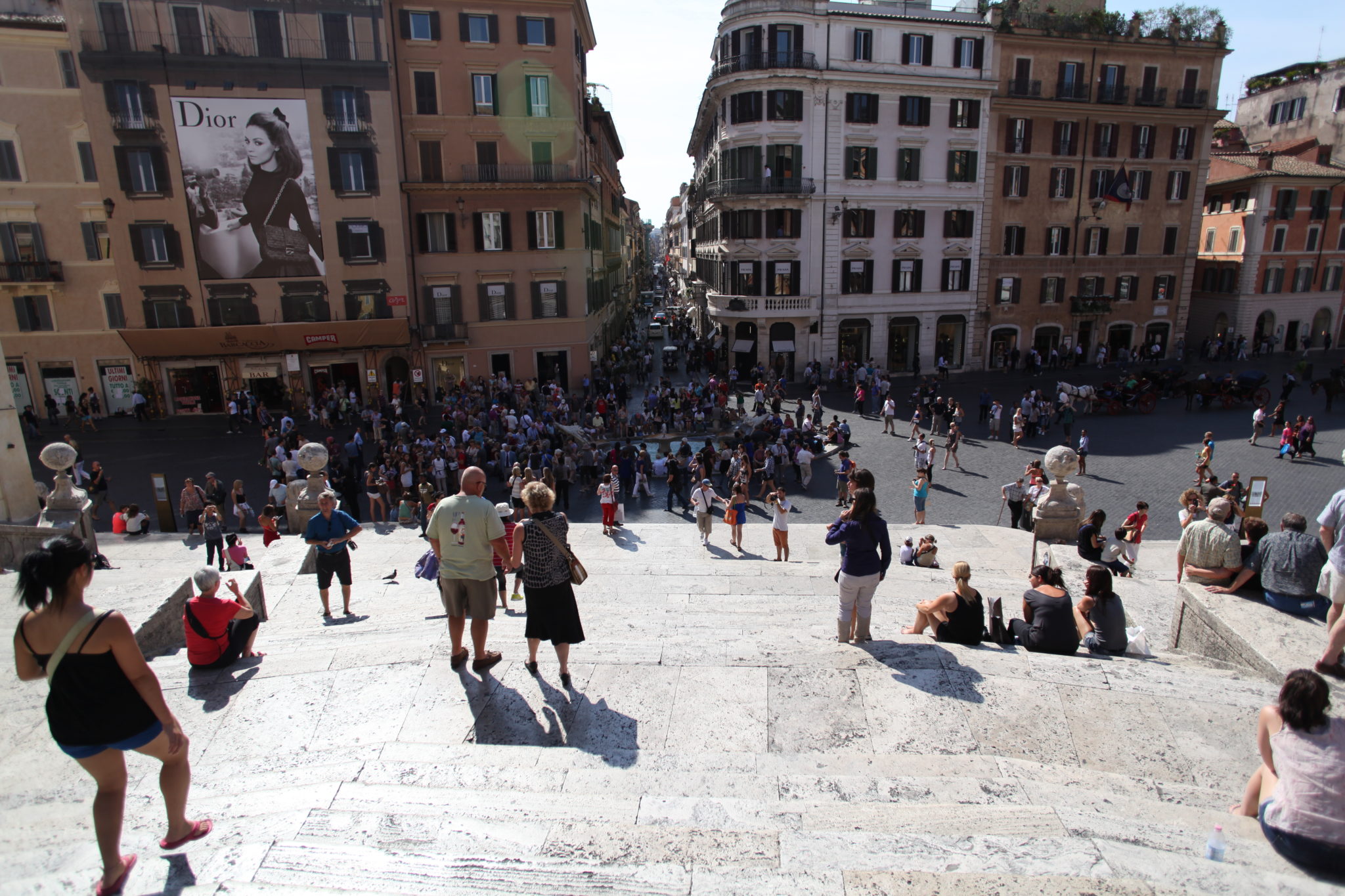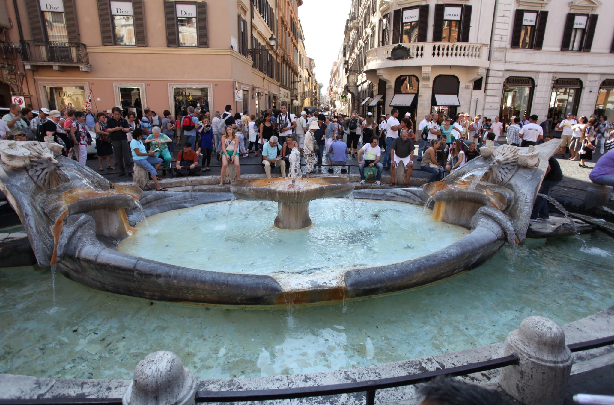 Our first stop took us to the Spanish Steps. This is a beautiful plaza with a warm brown color on all the buildings. In the centre is a beautiful fountain called the Fontana della Barcaccia. And on one side is a beautiful set of 18th century steps that take you up to a beautiful church and a view overlooking the neighbourhood. The area is quite beautiful, especially on a bright sunny day. However (as we soon learned) popular attractions like this turn into huge crowds of tourists!