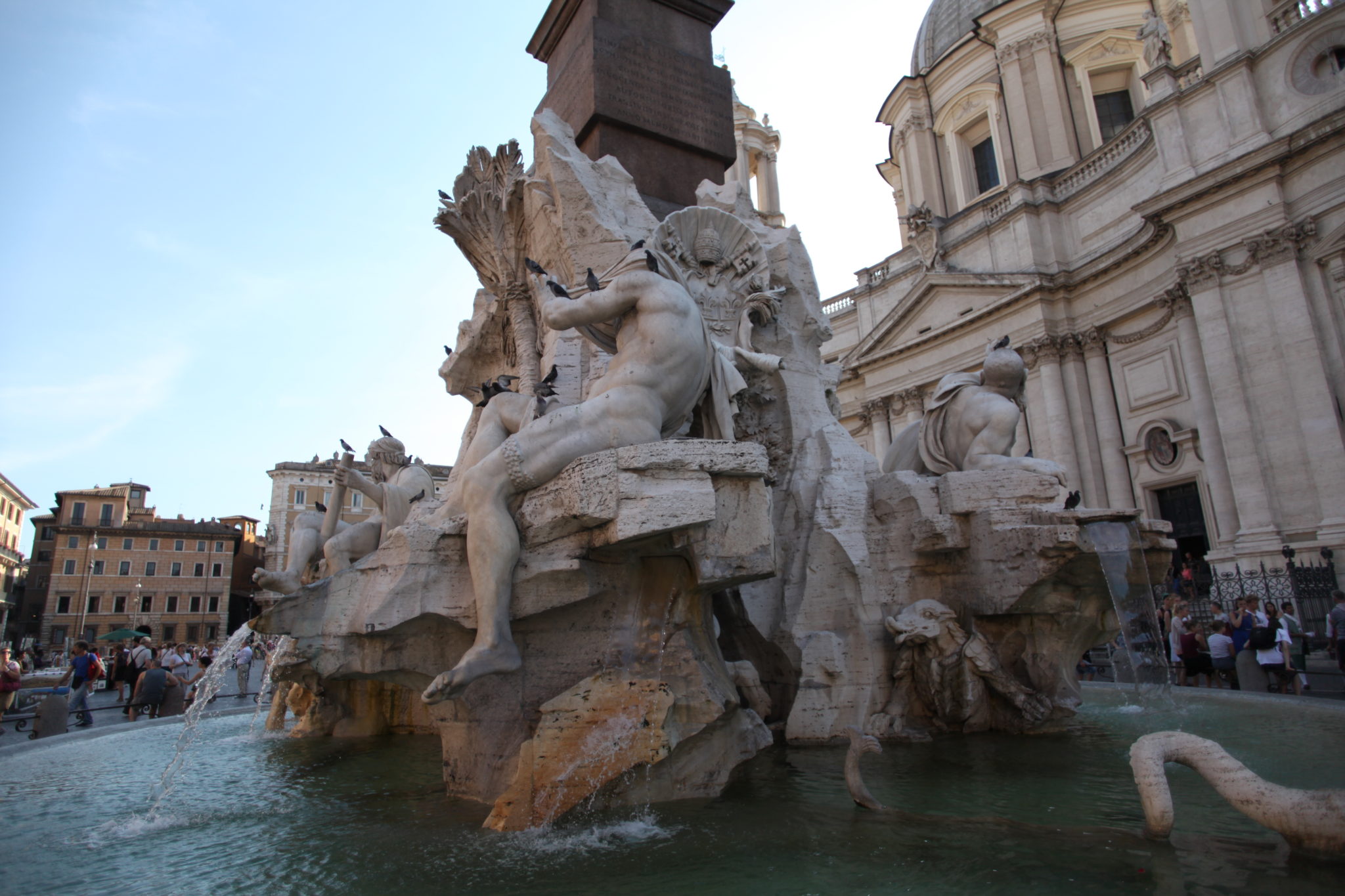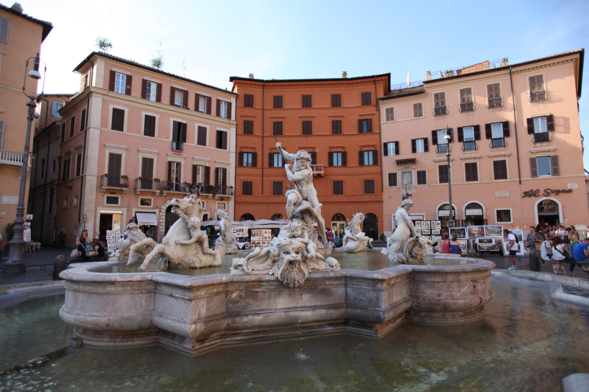 From the Pantheon we moved on. We arrived at Piazza Navona near the end of the afternoon. The sun was low on the western sky and the way the light lit up the plaza setup a great atmosphere. Inside the square are three beautiful sculpture fountains. Interspersed between and around the fountains are many art dealers selling paintings. Surrounding the plaza are small restaurants and cafes. It was an amazing place to stop and relax. Next to the Pantheon I really enjoyed simply walking around this area. Looking at the different art and just taking it all in.
