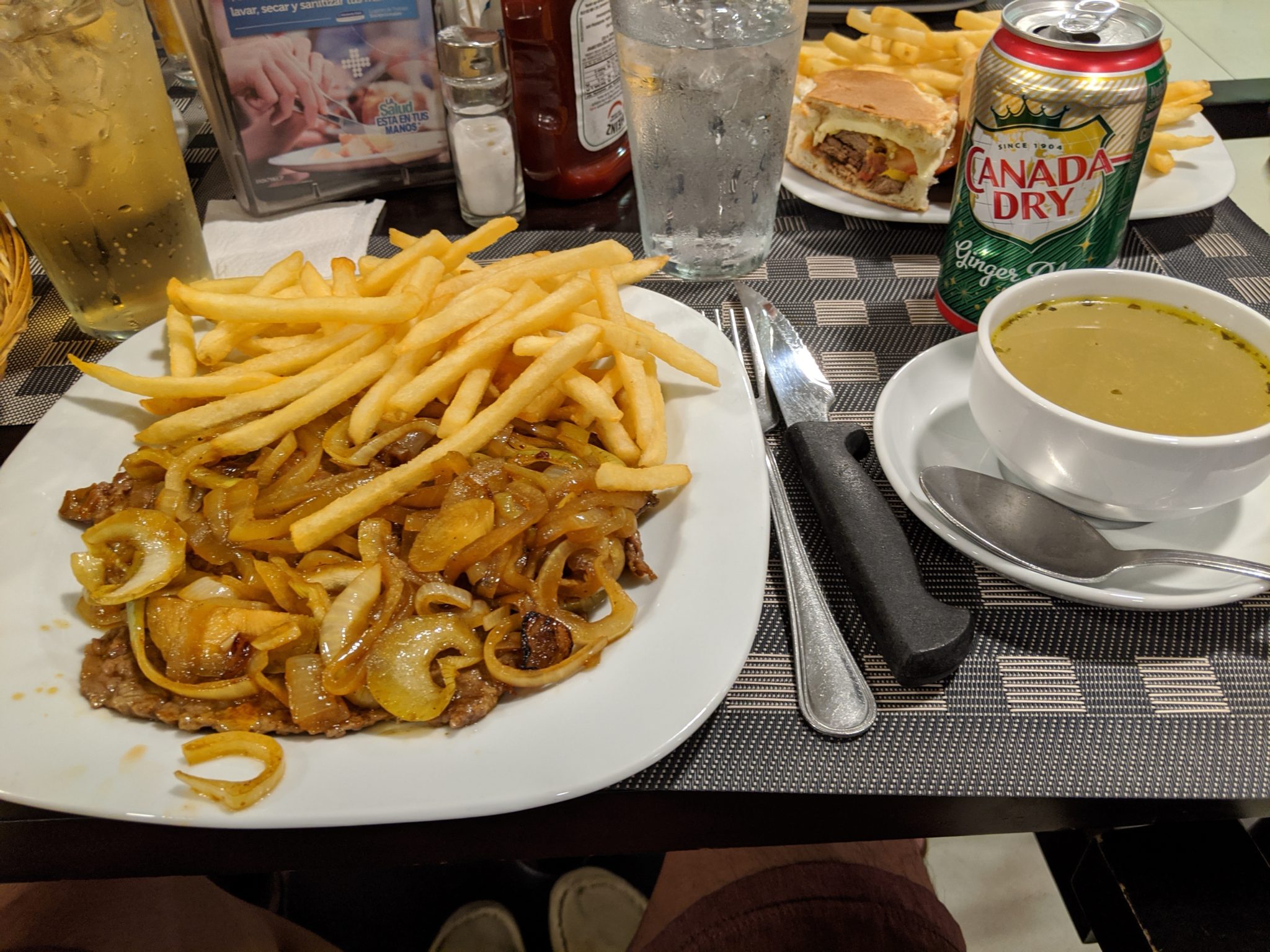 After a quick clean up, all of us were pooped and we decided on dinner at this diner type restaurant near our hotel called Restaurante Costa Azul. It’s kind of neat because it really feels like a “Panamanian Denny’s” with a very large and diverse menu. I don’t know how authentic everything is, but it really hit the spot. There are some cool “comfort food” type offerings. And I ended up ordering a steak and onions dish with chicken soup. (I’m not sure what it is, but I’m really digging chicken soup here!)