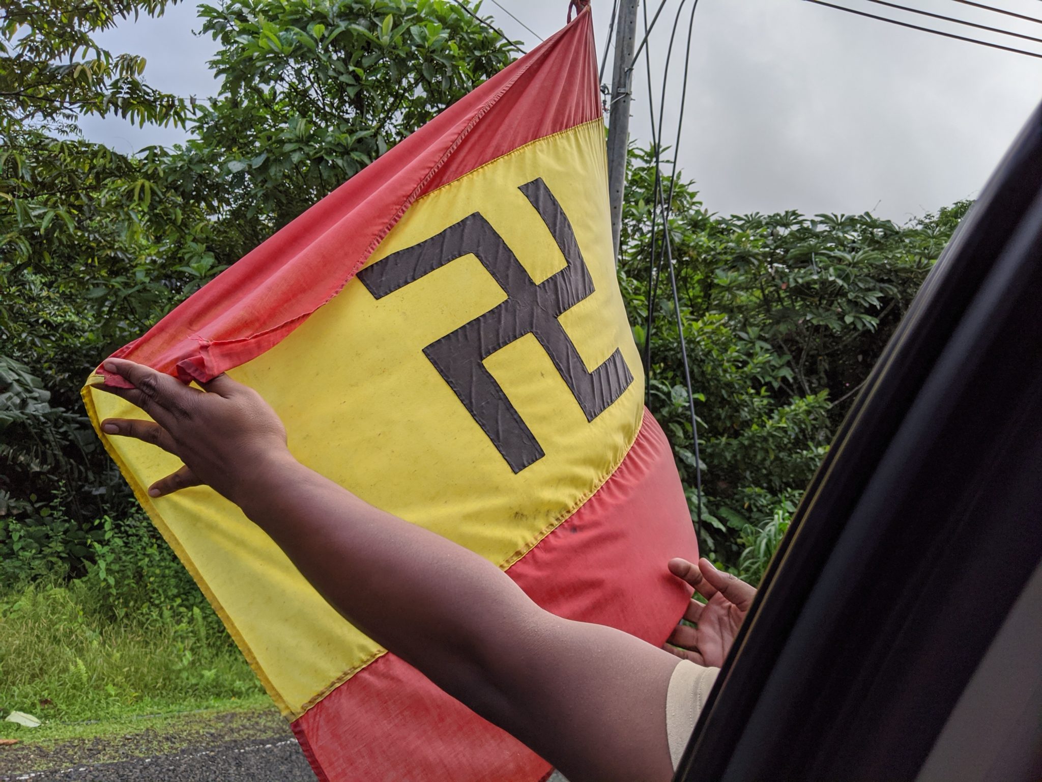As mentioned before San Blas is a autonomous region and after some twists and turns on the “pot holey” road we arrived at a border check point where they checked out our passports. While waiting for the checks, our driver showed us the Guna flag which actually has a Swastika on it. While in other places this may have a negative connotation, this is actually an ancestral symbol so it’s quite cool to see it in a different context.