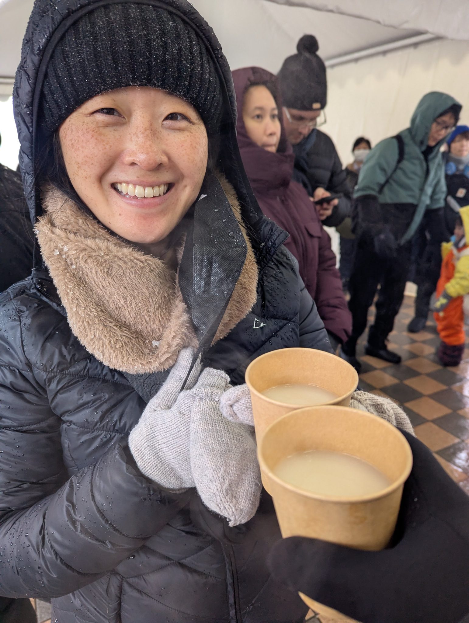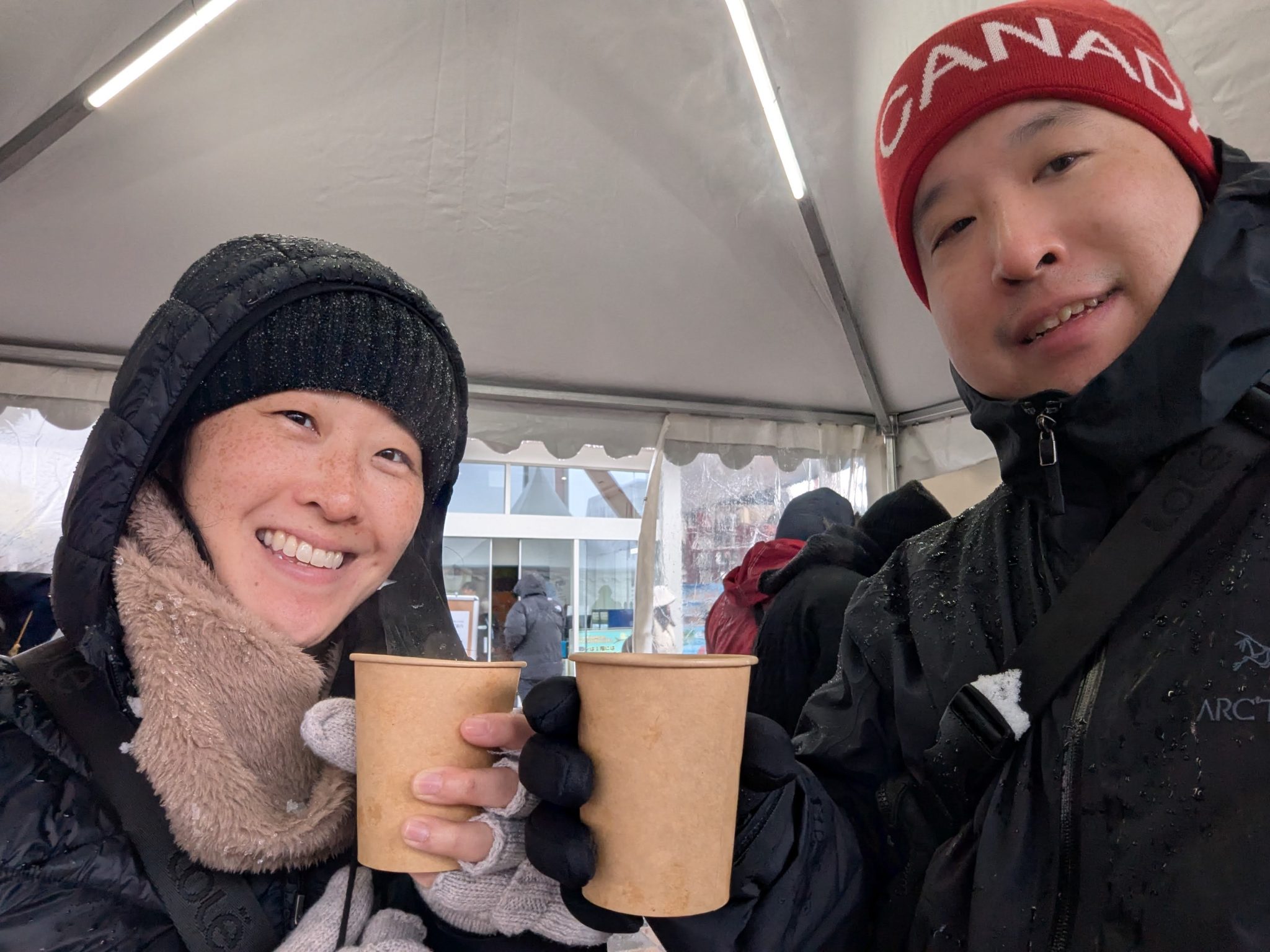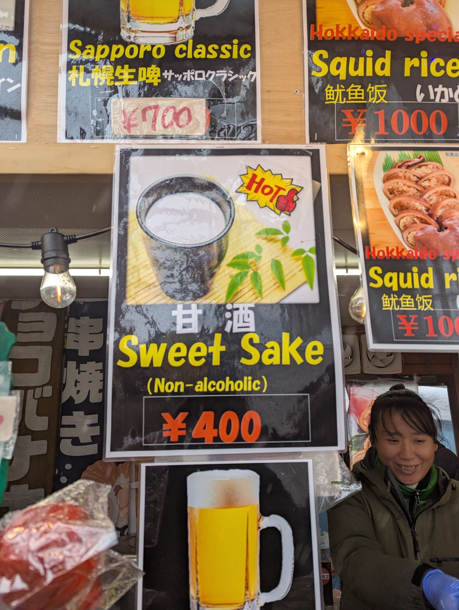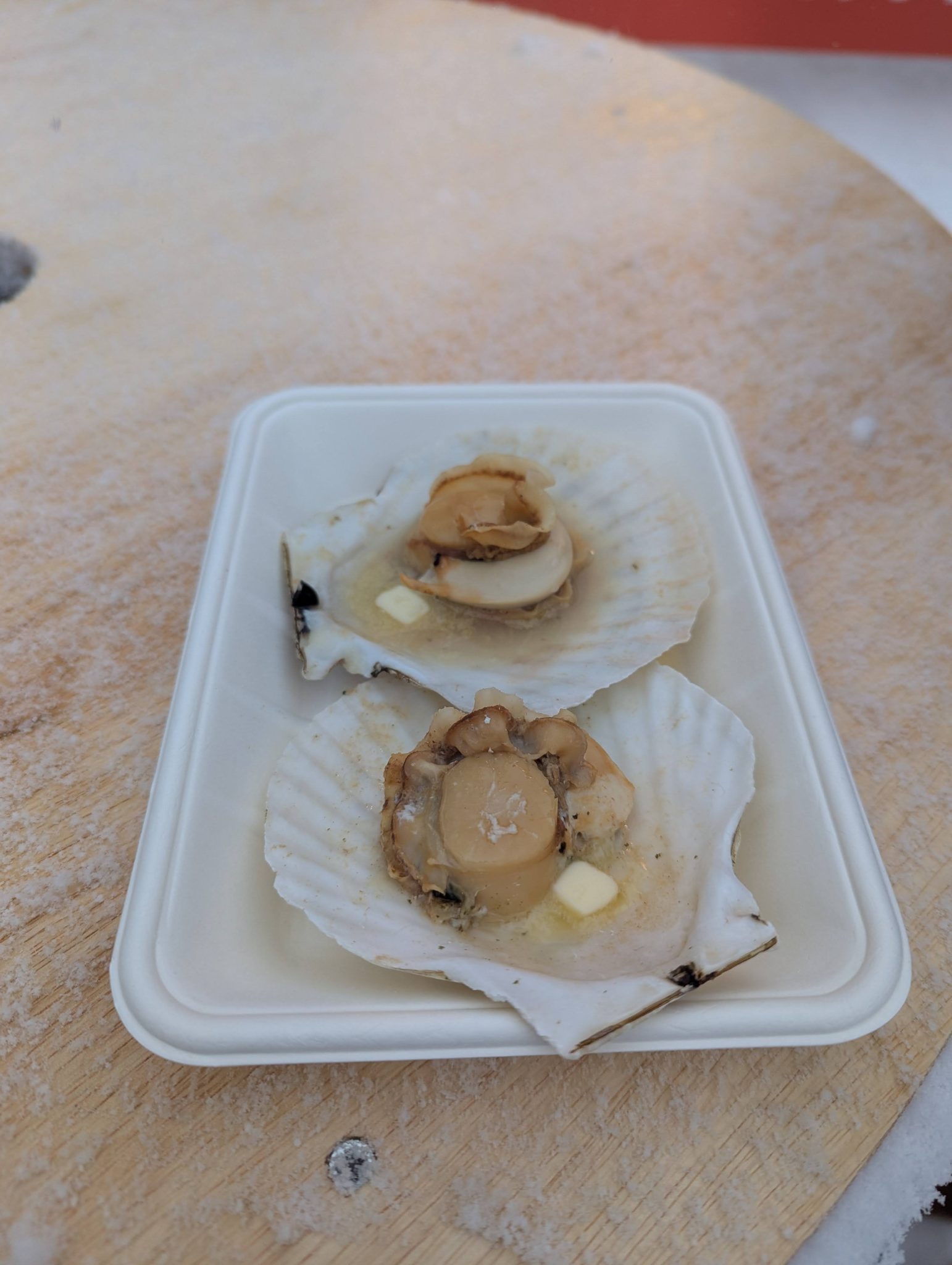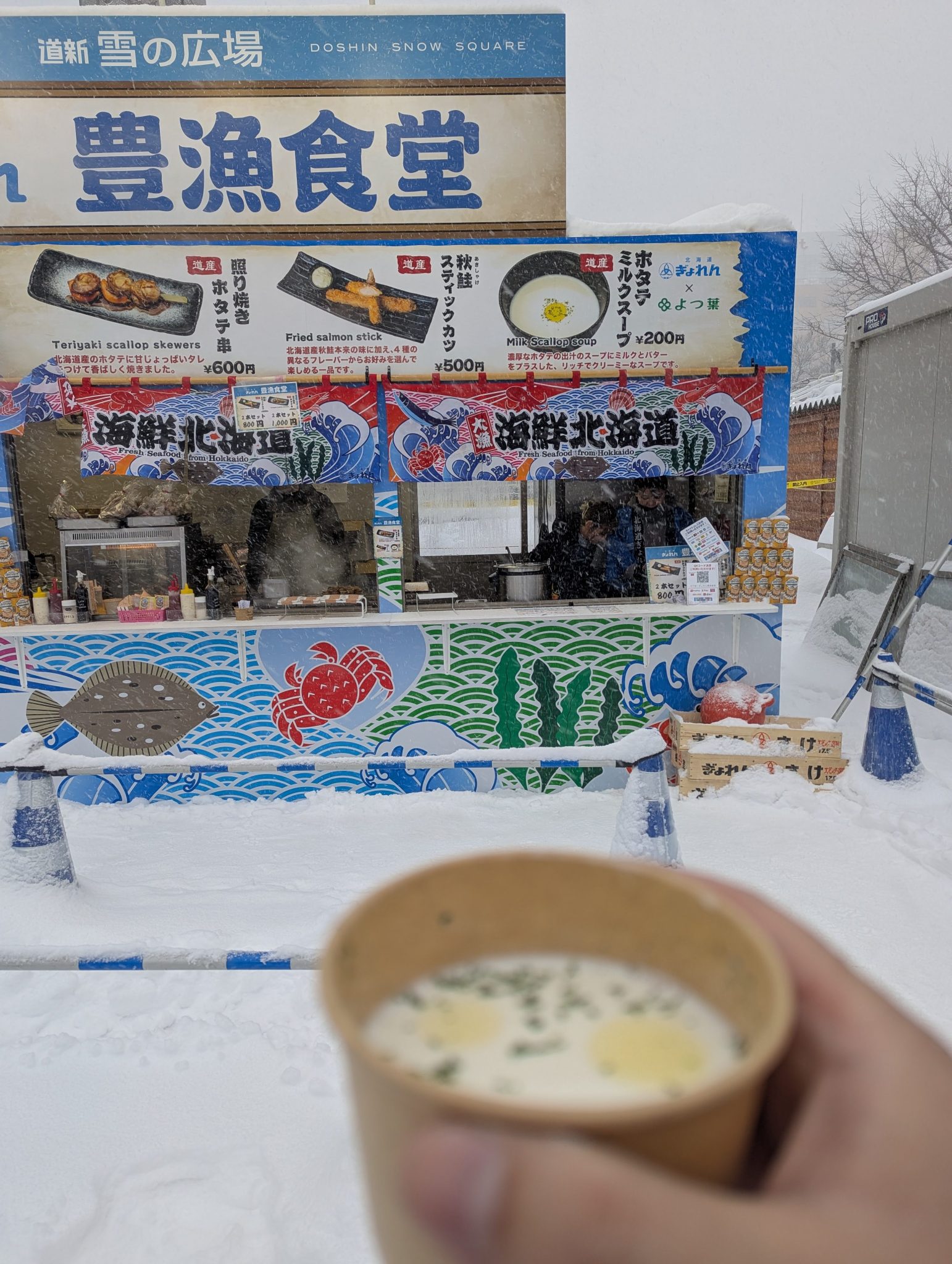 Another great standout feature of the Sapporo Snow Festival is the food! Similar to other festivals there is no shortage of stands and stalls offering international and local foods. As we stop by different stands we start to avail ourselves of different local items like Sweet Sake, Local scallops and milk scallop soup.