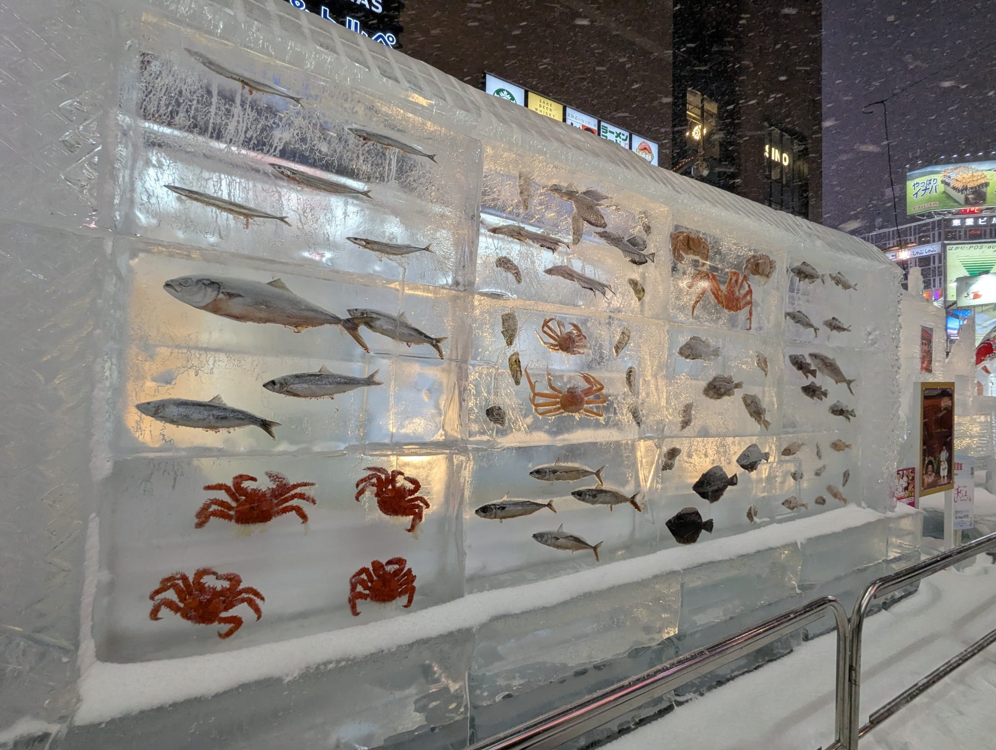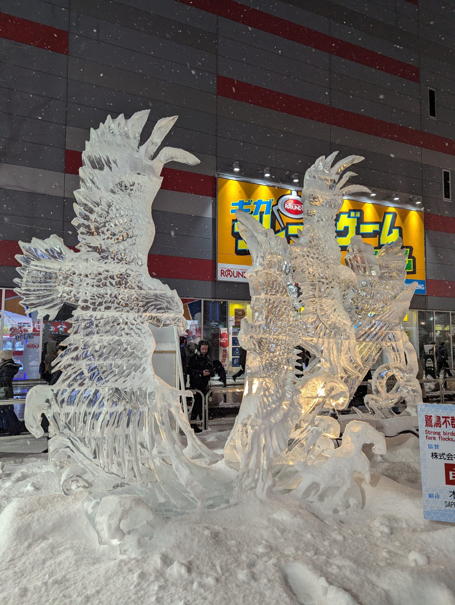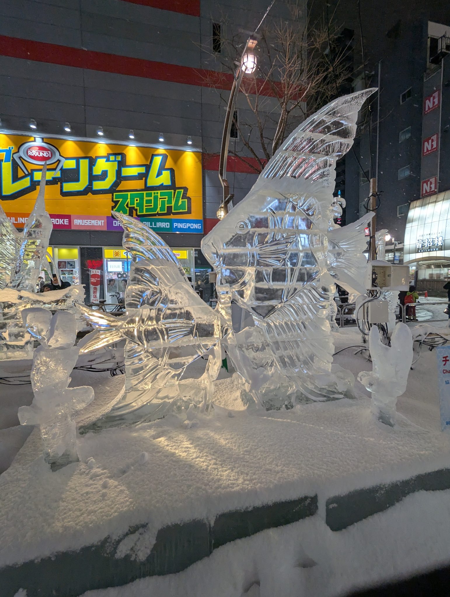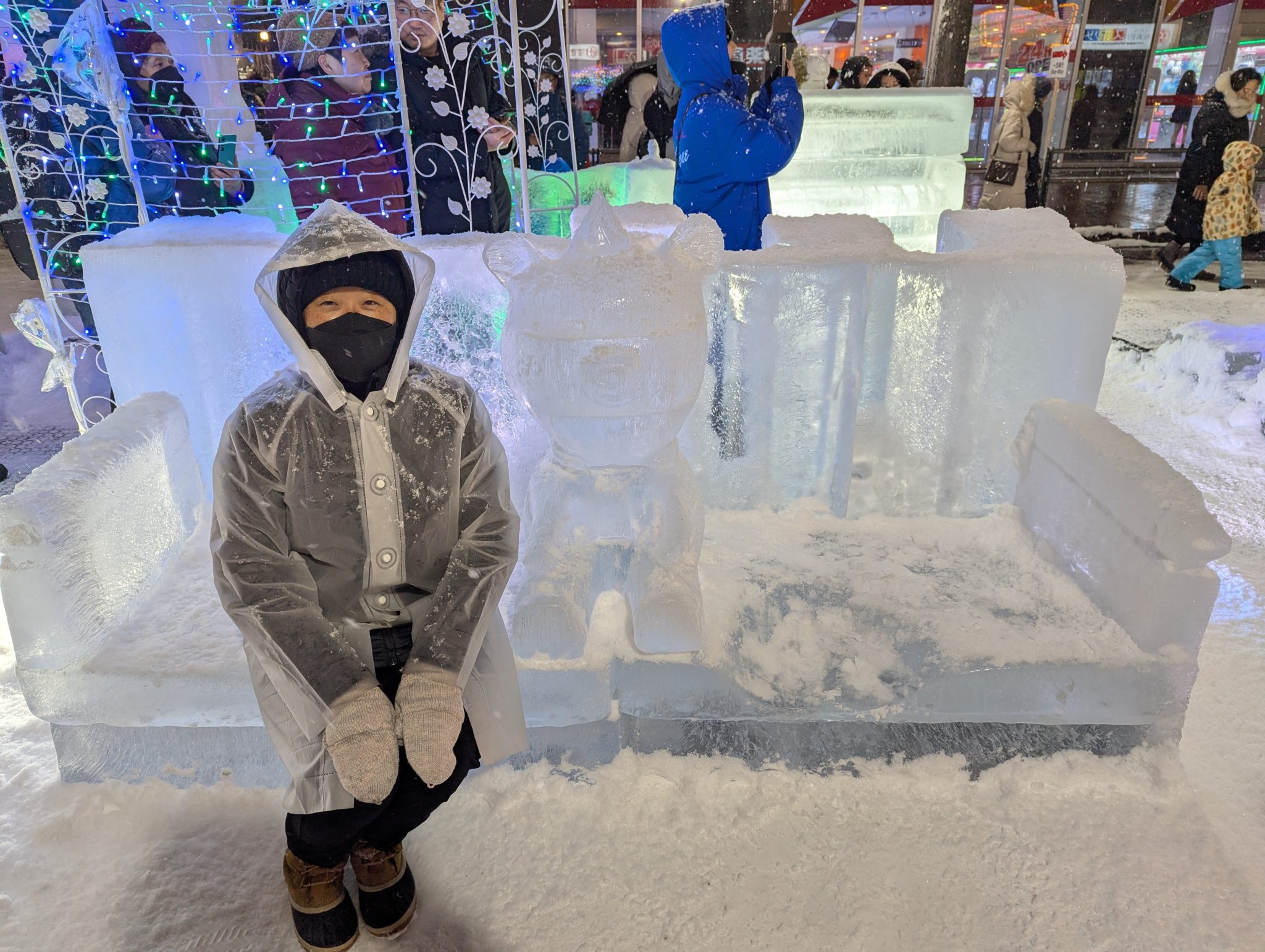 Right by ramen alley is the Susukino site of the Sapporo Snow festival. This is mainly a street site that displays all the ice sculptures of the different artists. The Sister and I spend some time exploring the different sculptures and even watching some of the artists still making sculptures even though the festival is almost over! The Susukino site isn’t very expansive so after about an hour we get through most of it. We then head back to the Odori site because we want to see some of the snow sculptures at night lit up.
