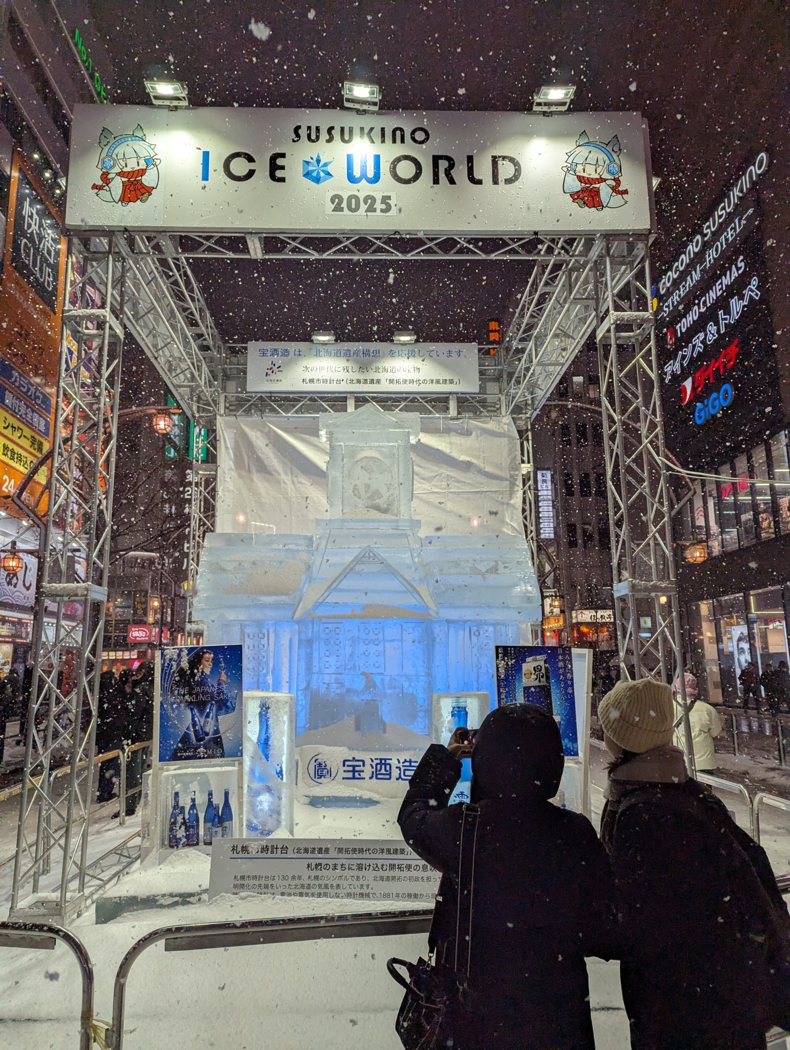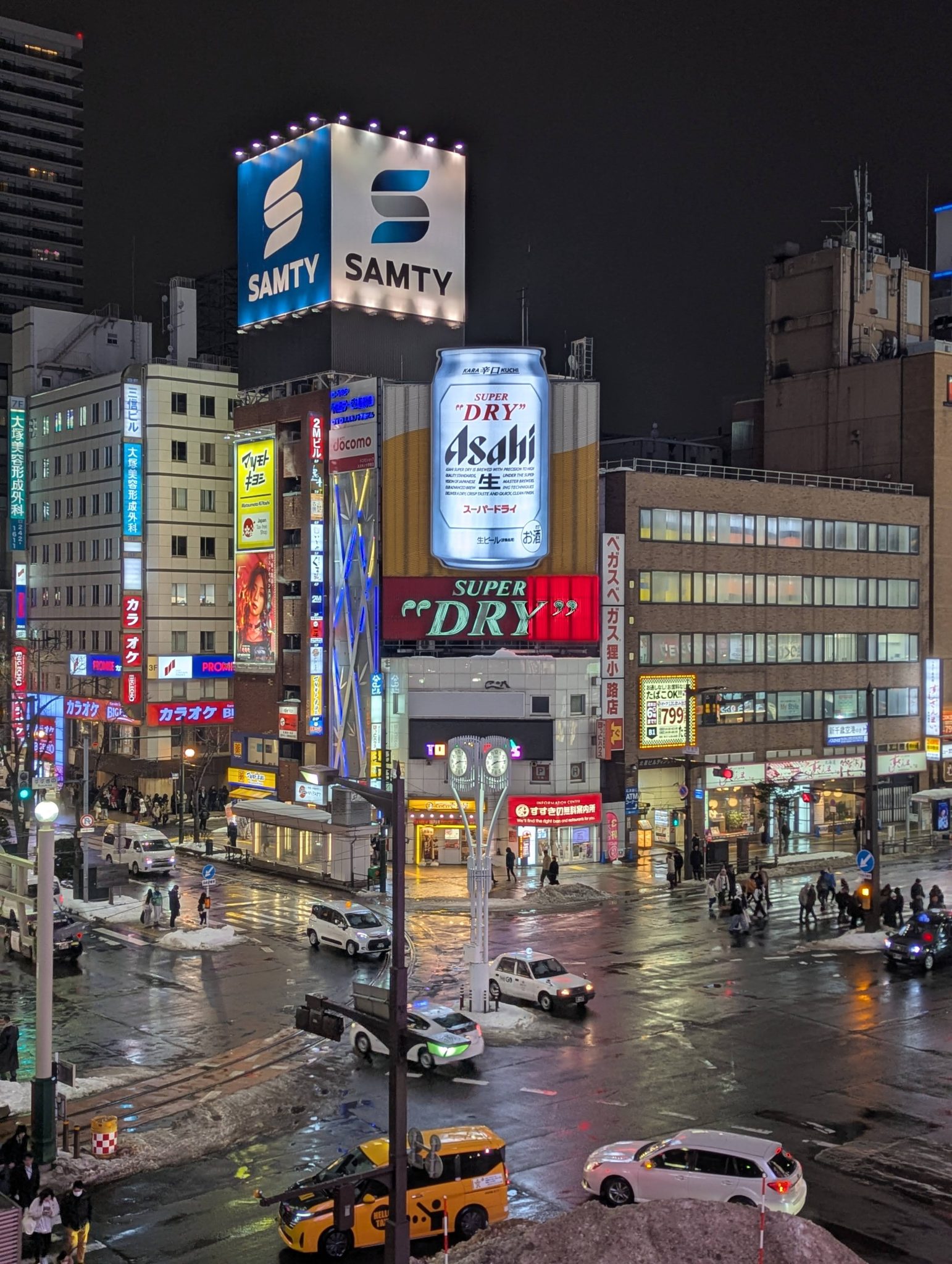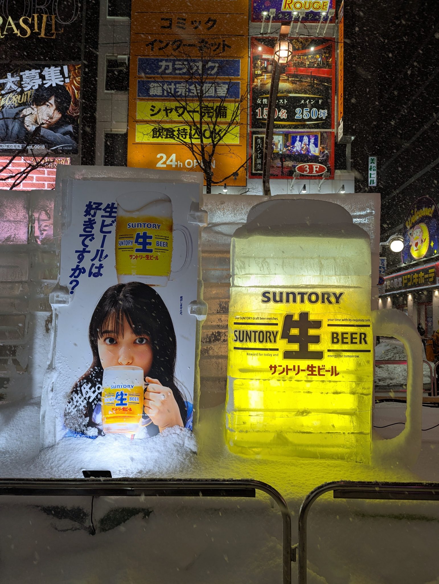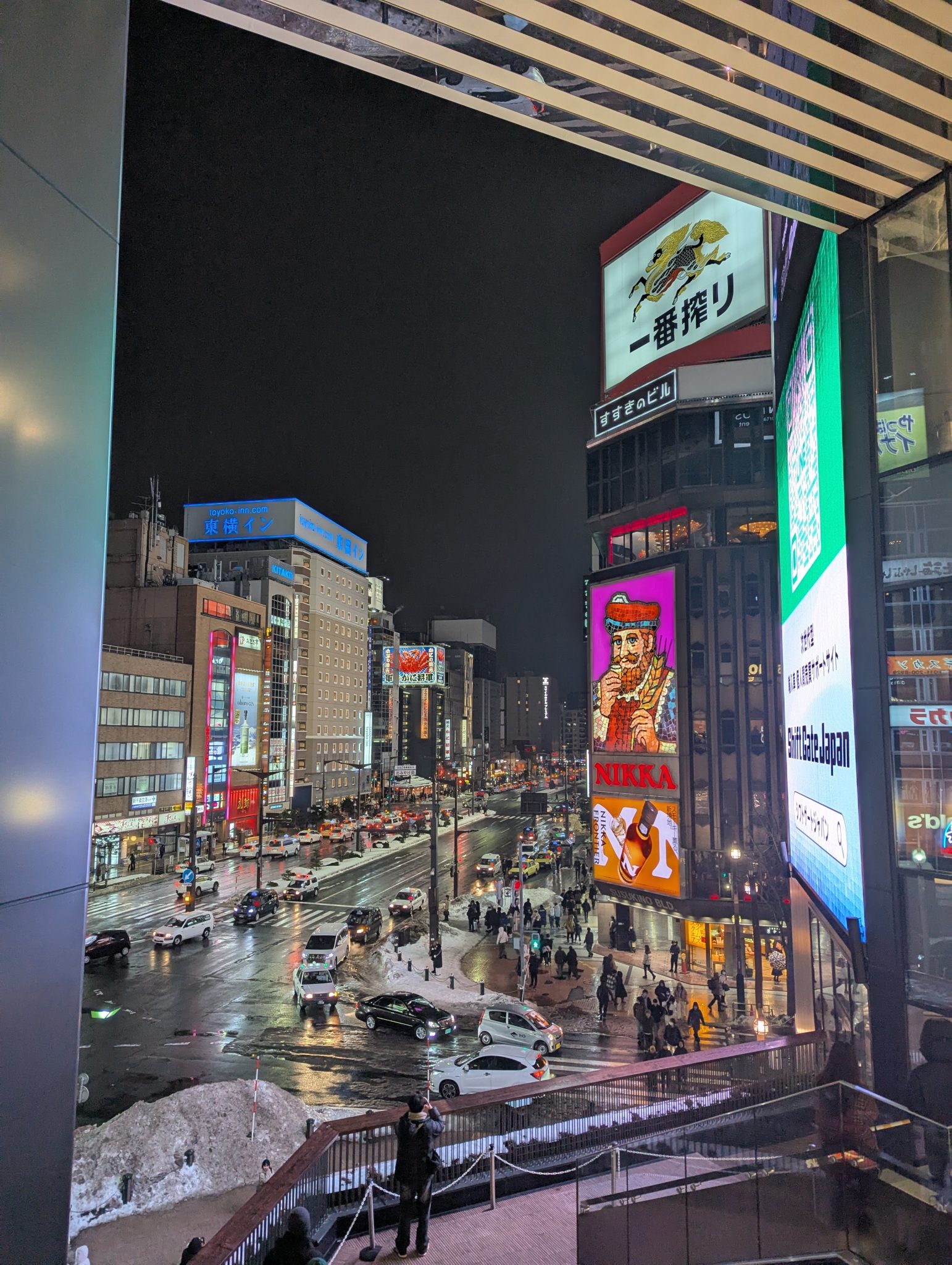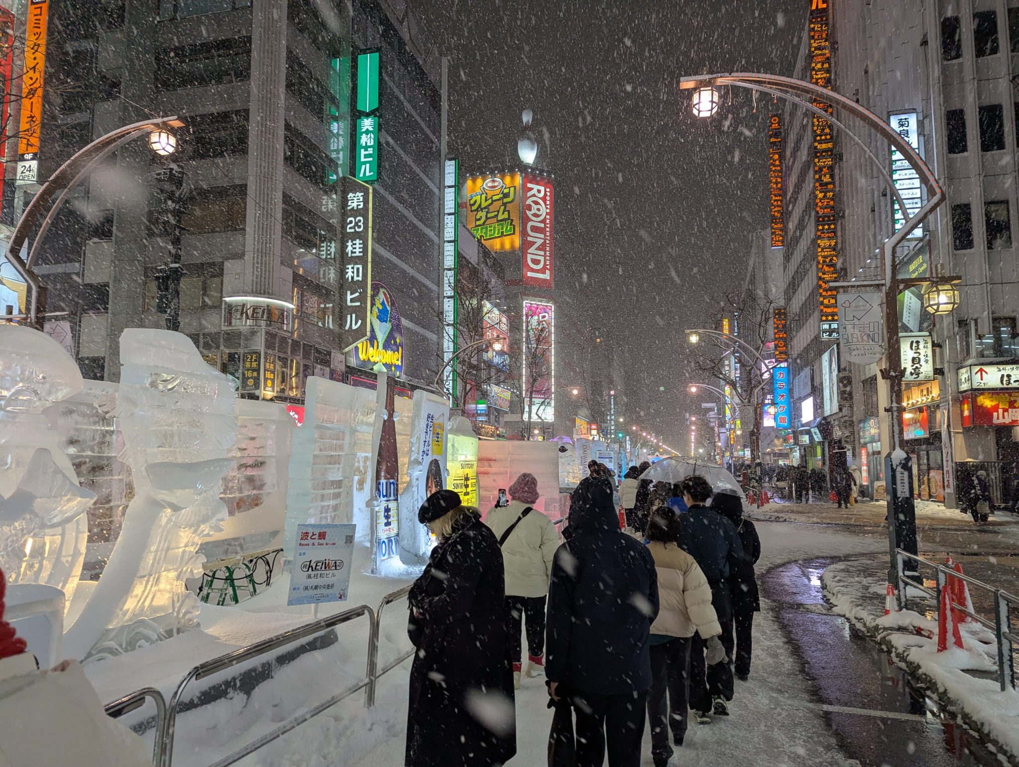 In the evening our thoughts turn to food once again. We set out towards the Susukino area which is the large entertainment district in Sapporo. Again, if you weren’t here the night before you wouldn’t know there were ice sculptures here! Now its very much a bustling “Time Square-esque” area!