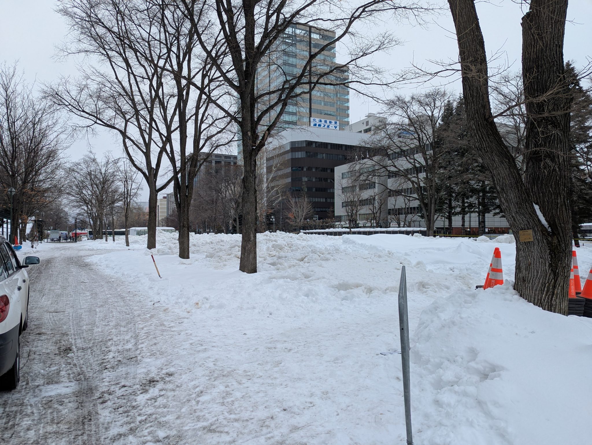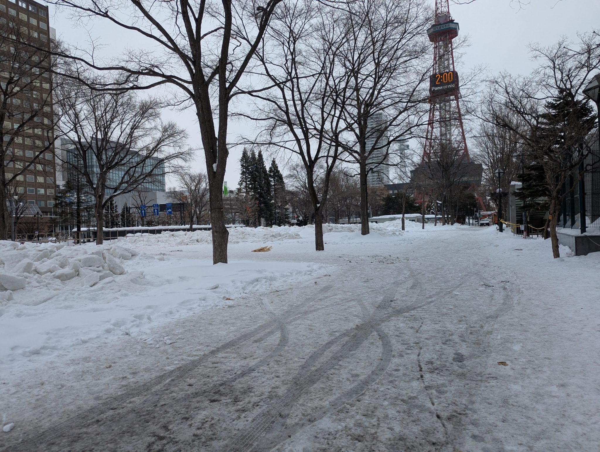 On our way out we spot another Hokkaido Ice Cream shop, so almost as a rule we need to partake. With our ice creams we walk along the Sosei river and head towards the Odori site of the Sapporo Snow Festival. We want to see what the aftermath of the festival really looks like.