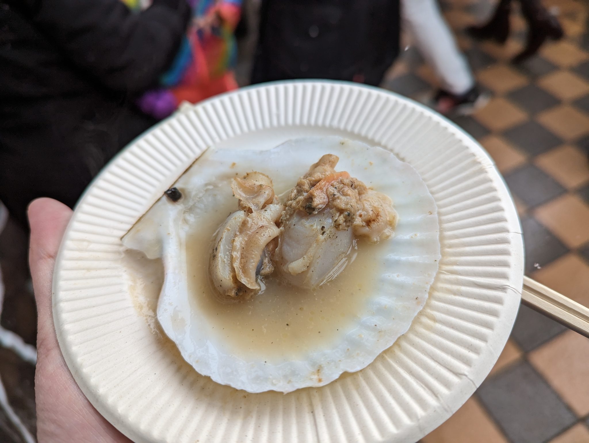 Underneath the TV Tower is where there are several stands setup to sell all manner of food. This is also probably the most crowded part as everyone is scrambling to get their hands on some very delicious treats! While there are tons of items on offer, I end up picking up a skewer of Hokkaido Beef, some Hokkaido Asahikawa Hot Sake, and a freshly grilled Scallop.