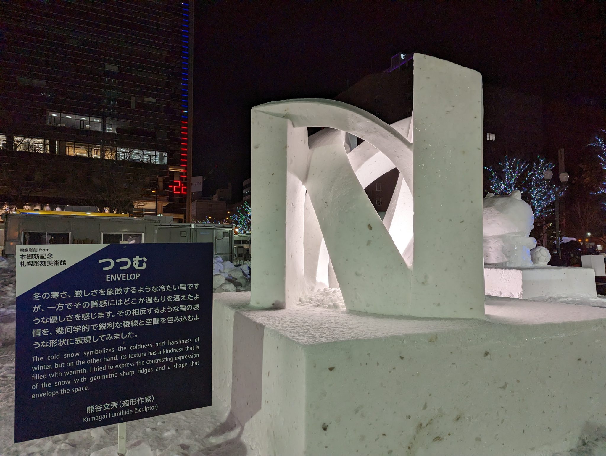By the time I wake up and make my way out into the cold again its fully evening. I know that the festival also runs into the evening so I’m eager to not only see what everything looks like at night, I’m also curious to see what entertainment is available too! As I approach the Odori site, I can see that many of the sculptures have their own lighting and its almost like its a completely different park!