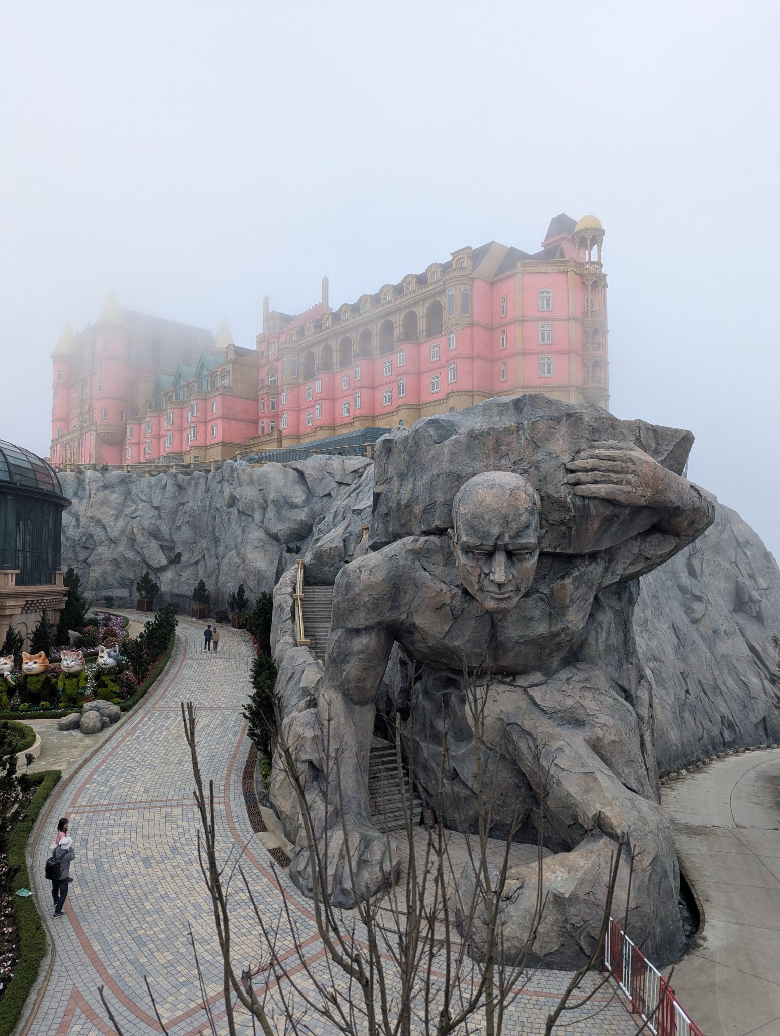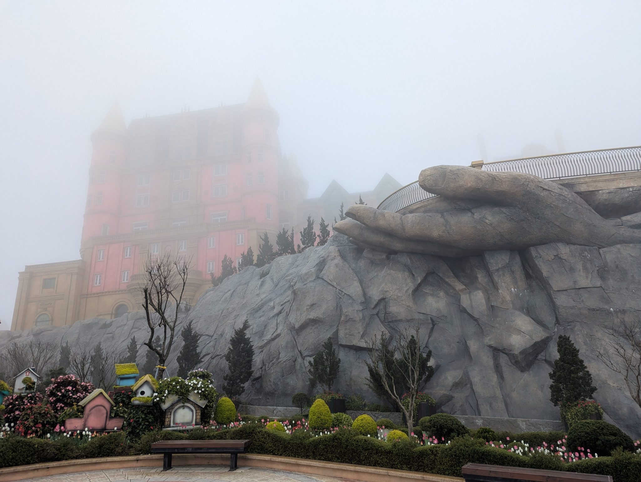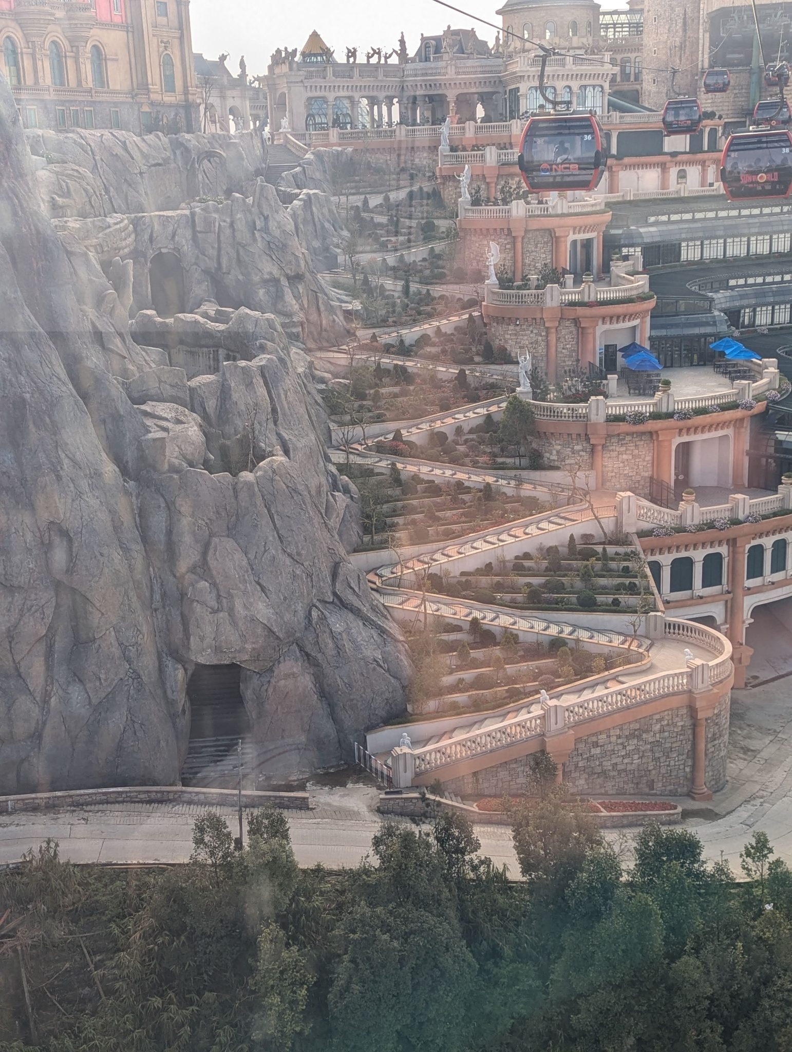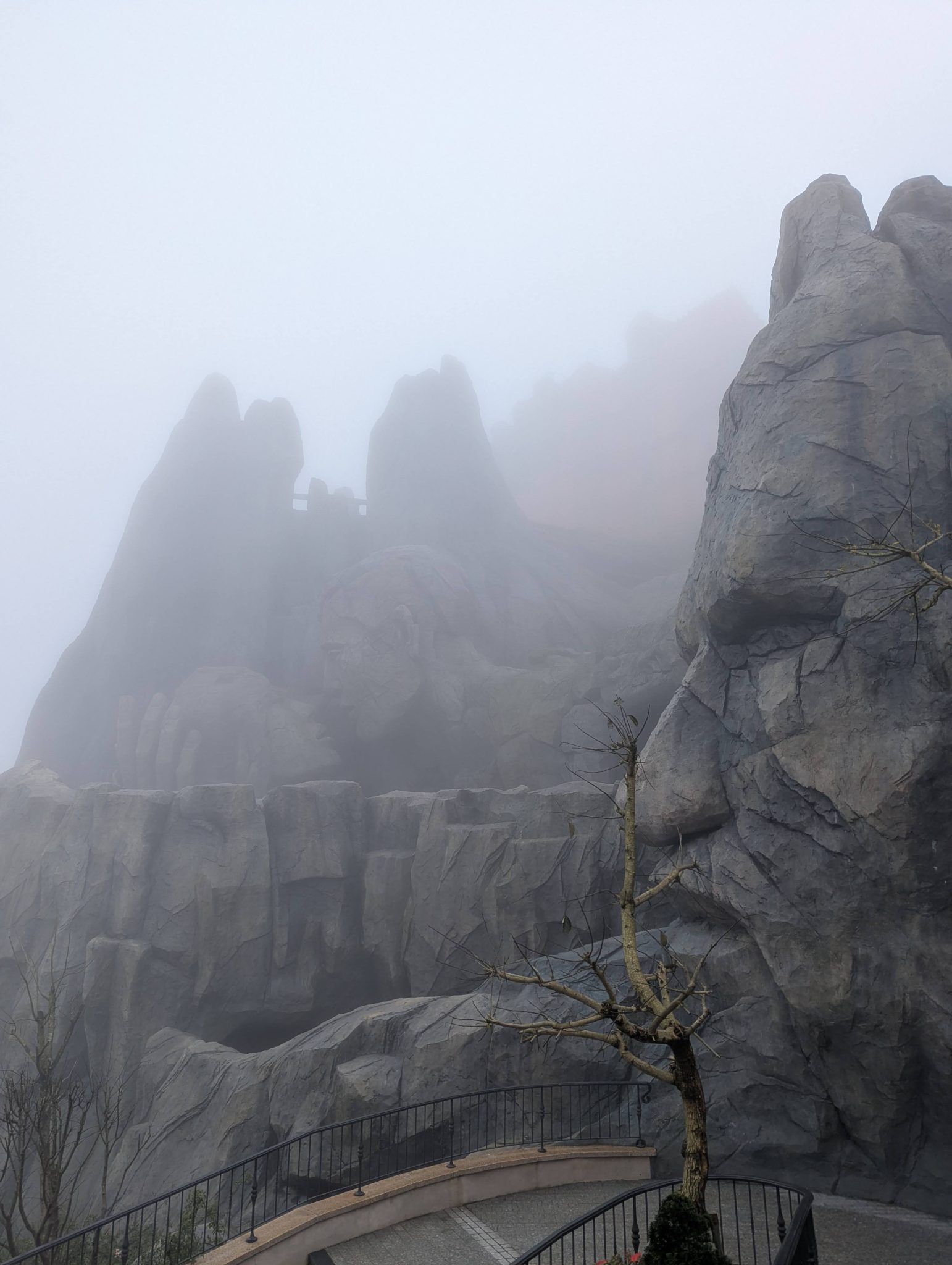 Adjacent to the square is an interesting winding path that on a paper map is called “Rainbow Road”. On the map it “looks” like you can walk it and wrap around to get to the castle. So the Sister and I start making our way down in the fog. We can’t quite see the end, but catch glimpses of the really cool design elements of the area, like faces on the cliff side. As we near the end we unceremoniously discover that the road simply just ends at a service road. There’s nothing preventing guests from going down this road. Why is it even on the map if it leads to nowhere?! Defeated, the sister and I trek back up the stairs we just came down. On the way up, there seems to be a common set of questions, “why and what is this place?” Later in the day, on a cable car ride, we get a pretty good view of the actual road in its entirety and the dead end and simply shake our heads.