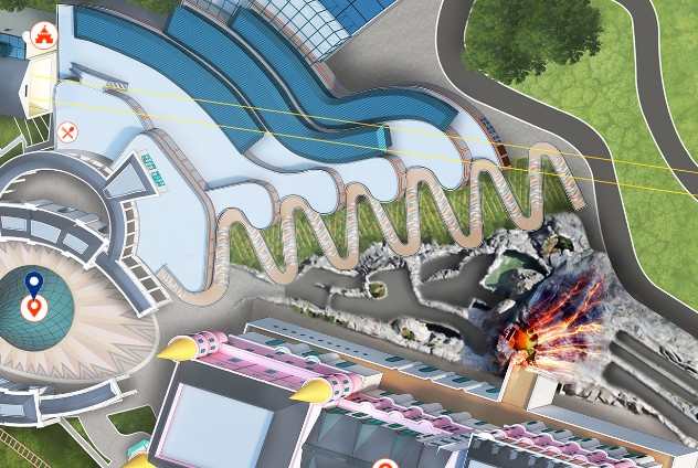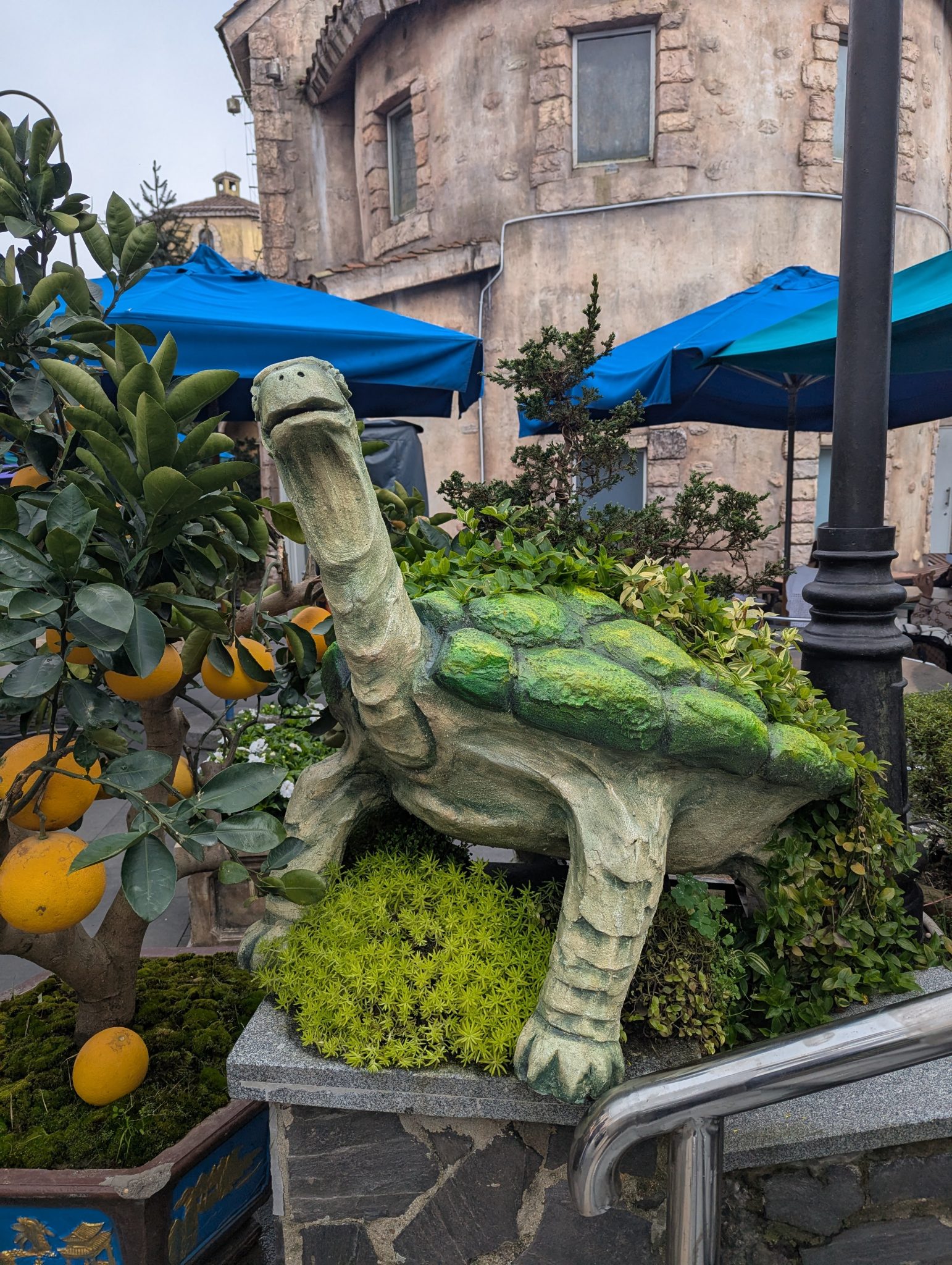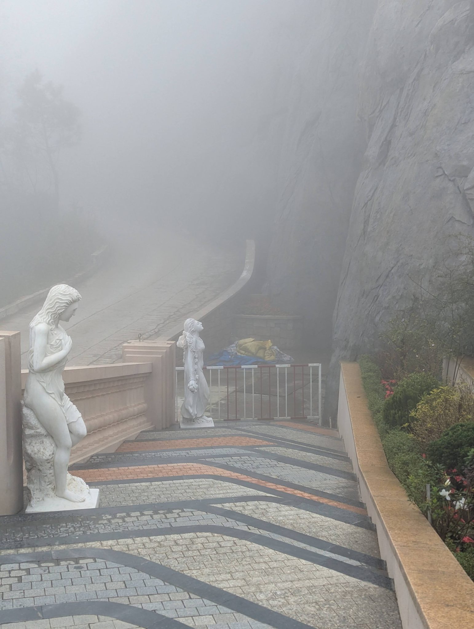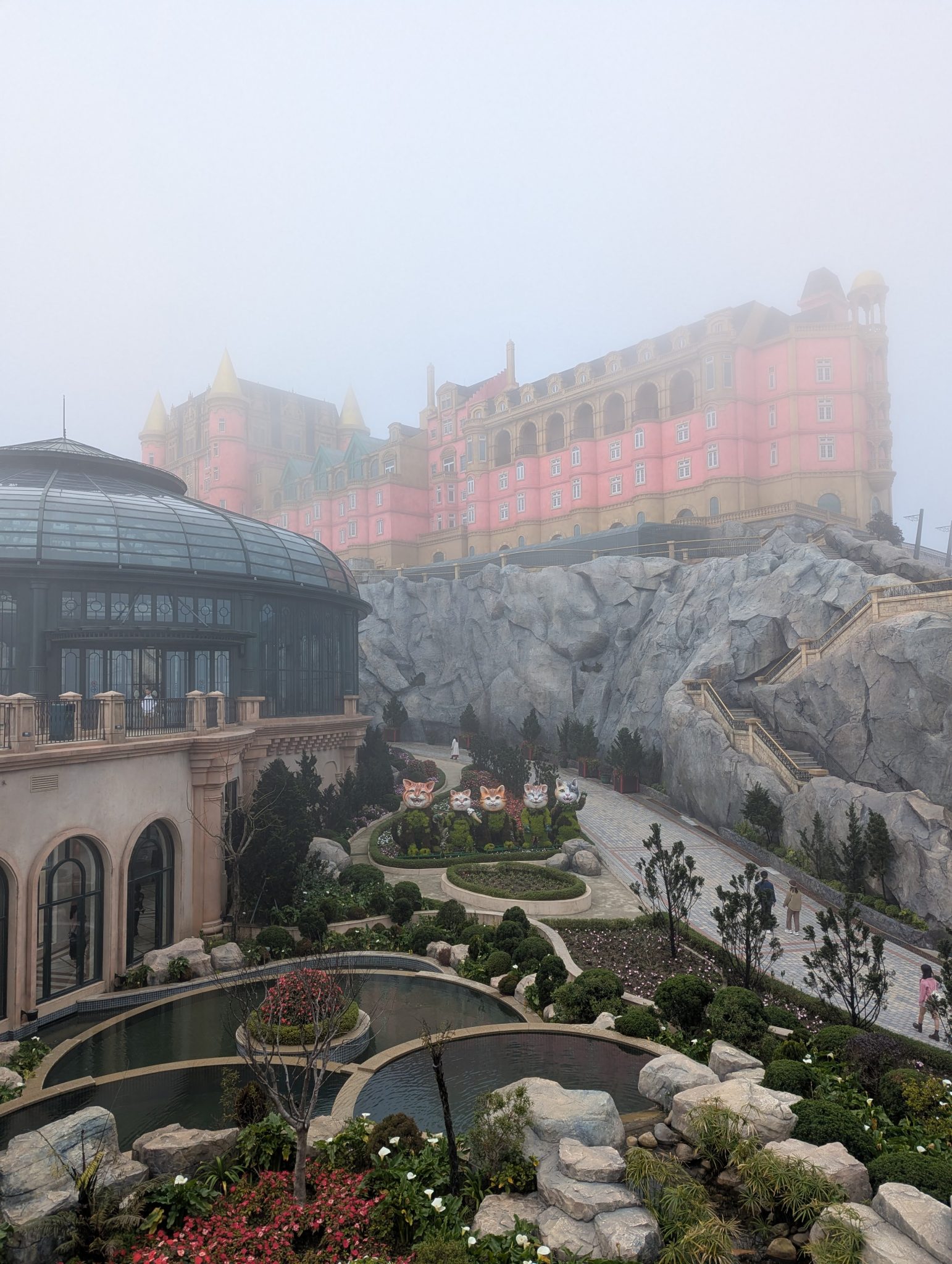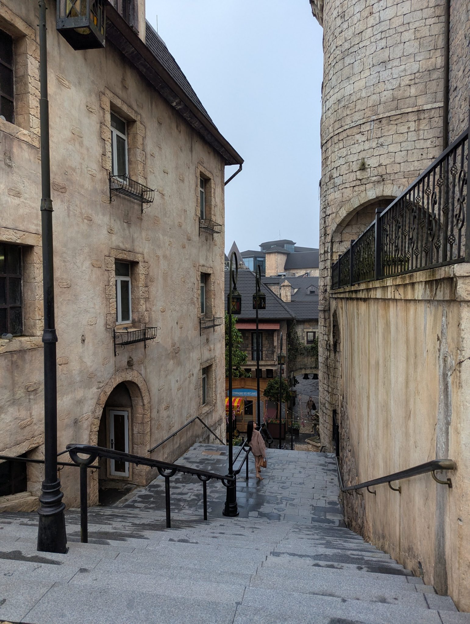 Adjacent to the square is an interesting winding path that on a paper map is called “Rainbow Road”. On the map it “looks” like you can walk it and wrap around to get to the castle. So the Sister and I start making our way down in the fog. We can’t quite see the end, but catch glimpses of the really cool design elements of the area, like faces on the cliff side. As we near the end we unceremoniously discover that the road simply just ends at a service road. There’s nothing preventing guests from going down this road. Why is it even on the map if it leads to nowhere?! Defeated, the sister and I trek back up the stairs we just came down. On the way up, there seems to be a common set of questions, “why and what is this place?” Later in the day, on a cable car ride, we get a pretty good view of the actual road in its entirety and the dead end and simply shake our heads.