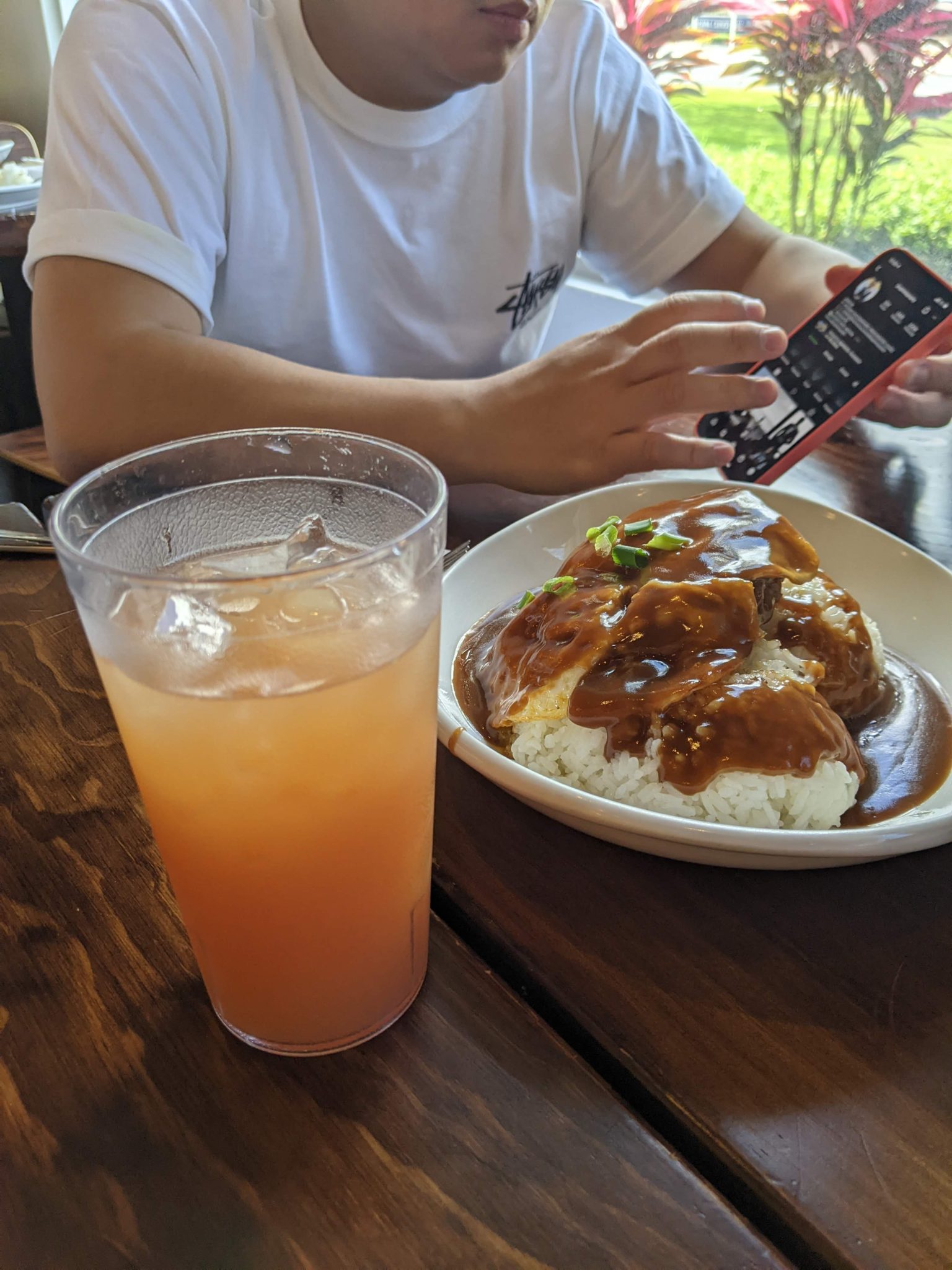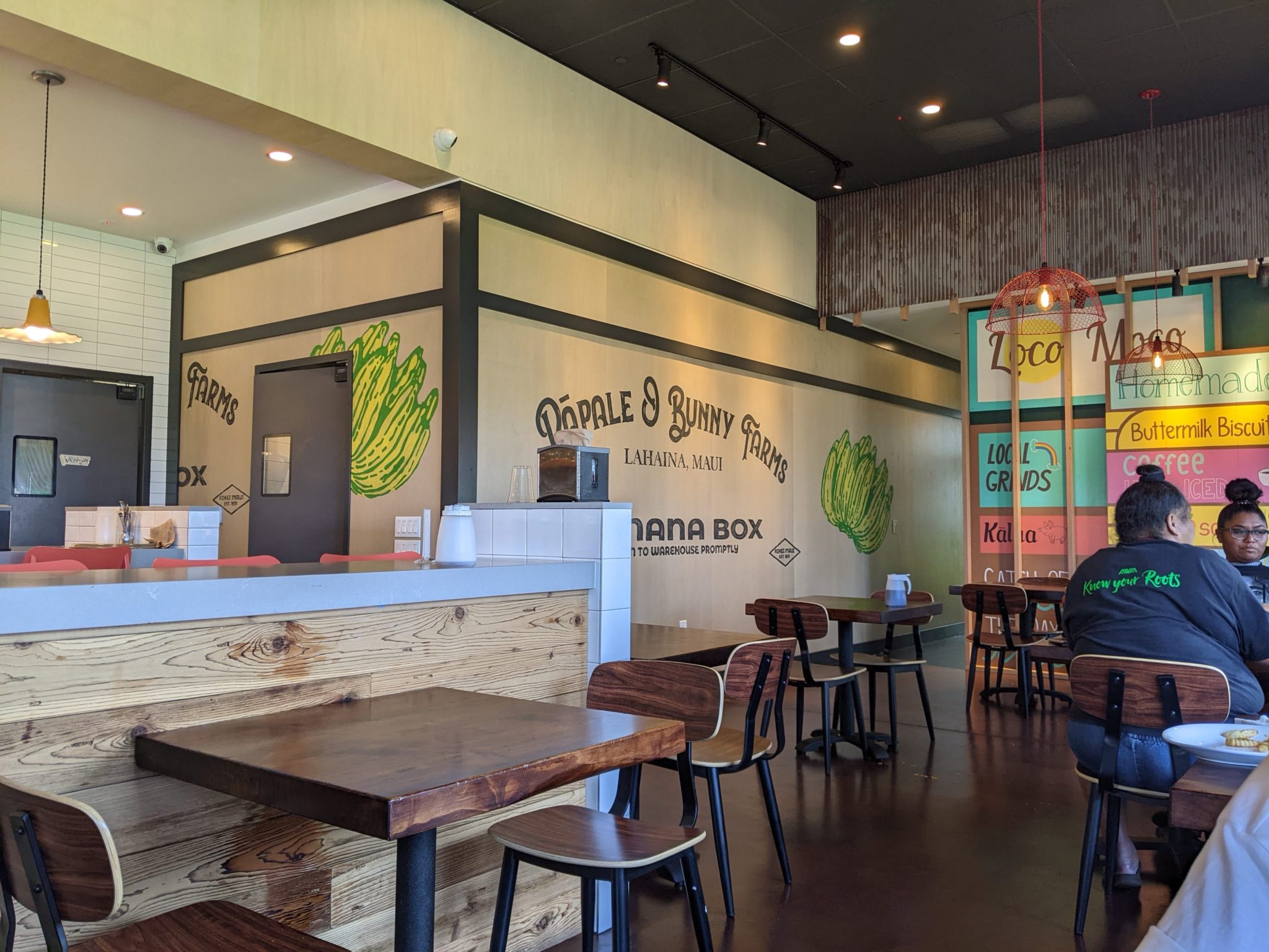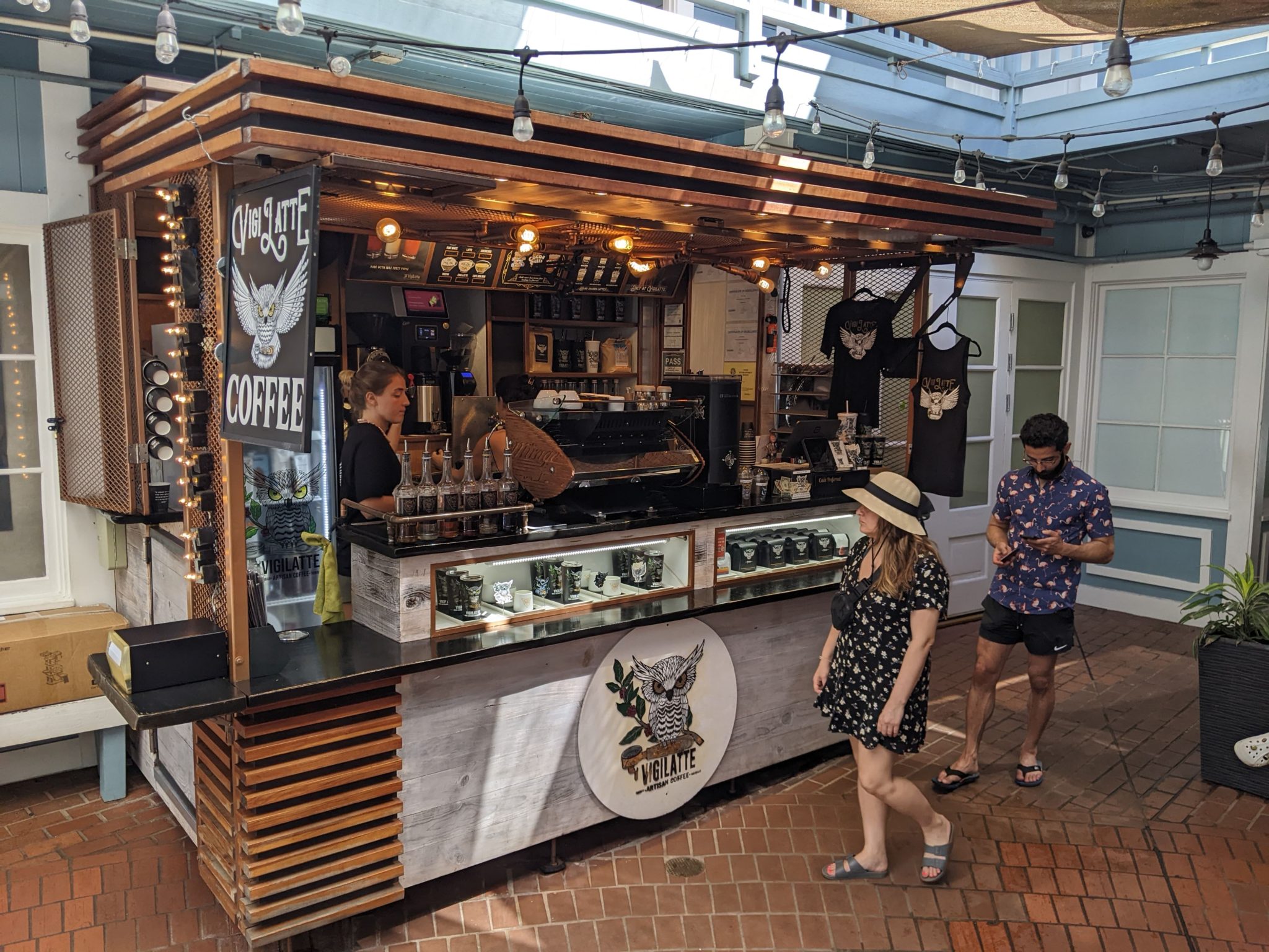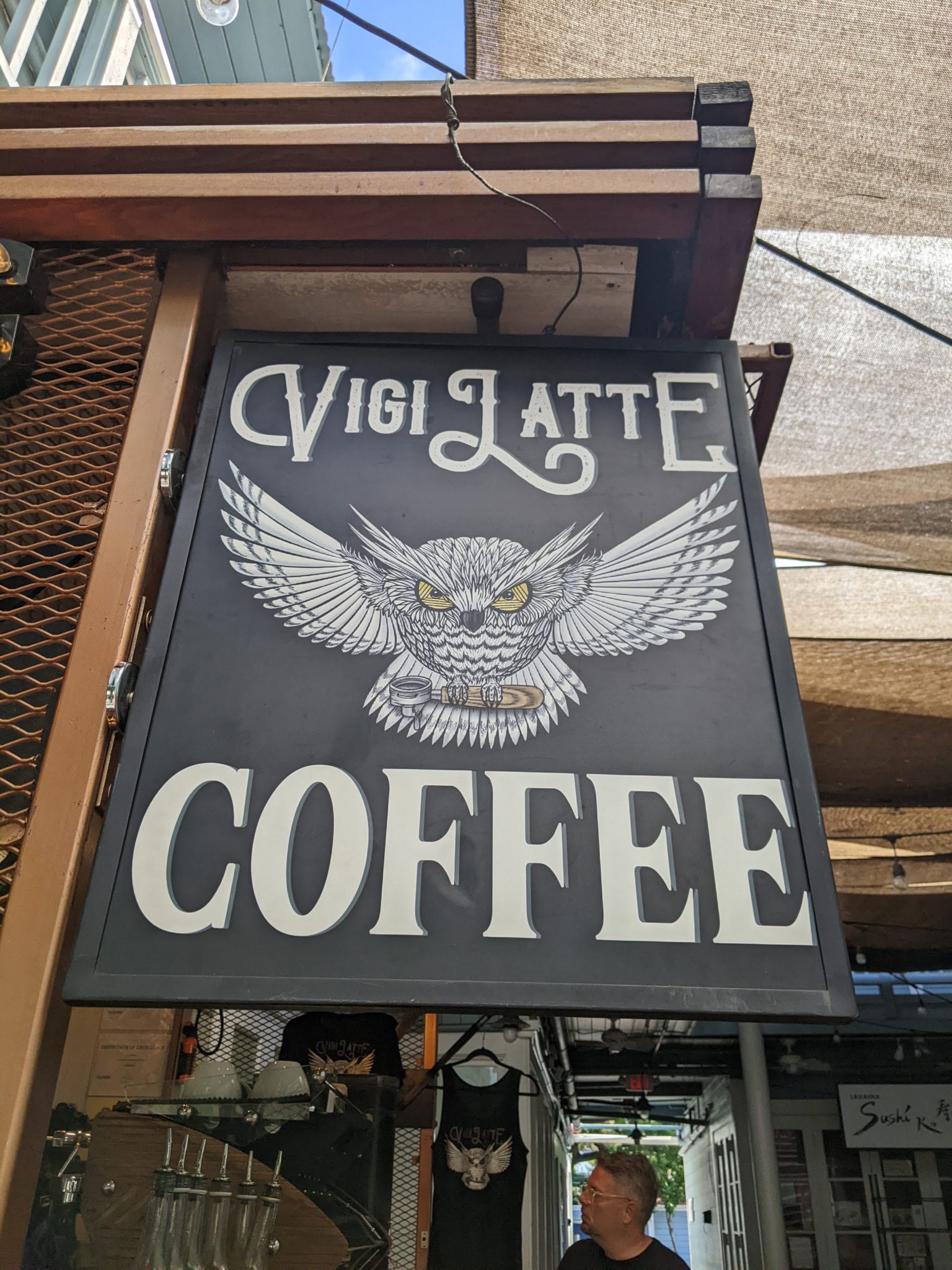 After our surfing lessons, the plan is to head back to our AirBnb, shower and head out for brunch/breakfast. But first given our early start, we sought out some caffeine! We find this in the form of Vigilatte Coffee. It’s a small artisanal coffee stand in the middle of Lahaina. I order their oat milk espresso agave and am pretty happy with my choice! Normally, I lean towards a basic dark roast coffee, but after the exertion of energy to surf something “nicer” is welcome!