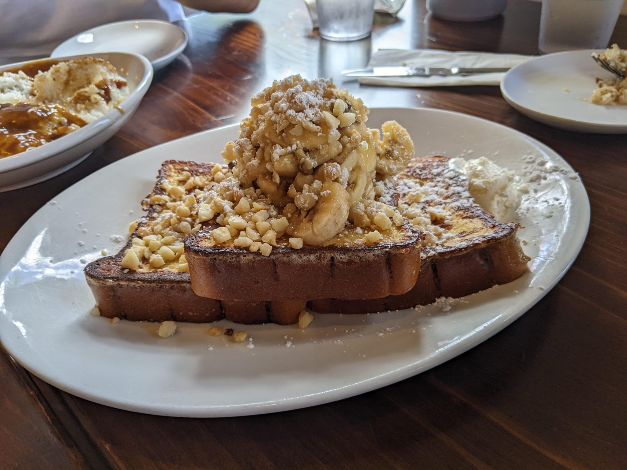 After showering at our AirBnB and feeling “fresh’ again, we head out for some food. On our list is a place called Kihei Caffe which kind of like an upscale cafeteria with table service. You order at the front, find a table and they bring the food out to you. The menu consists of some pretty decadent breakfast offerings and some local Hawaiian dishes too! We decide to share a few selections, so we order the Loco Moco, Pork fried rice and eggs and the Banana French Toast. Everything is super tasty, but I think my favorite is, surprisingly, the fried rice!