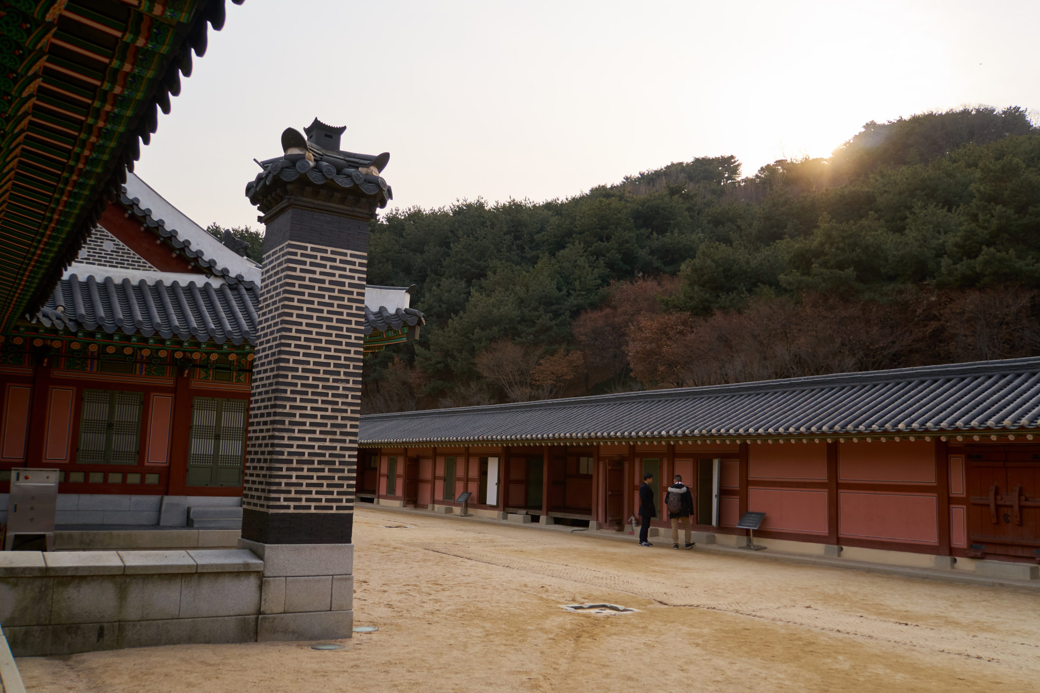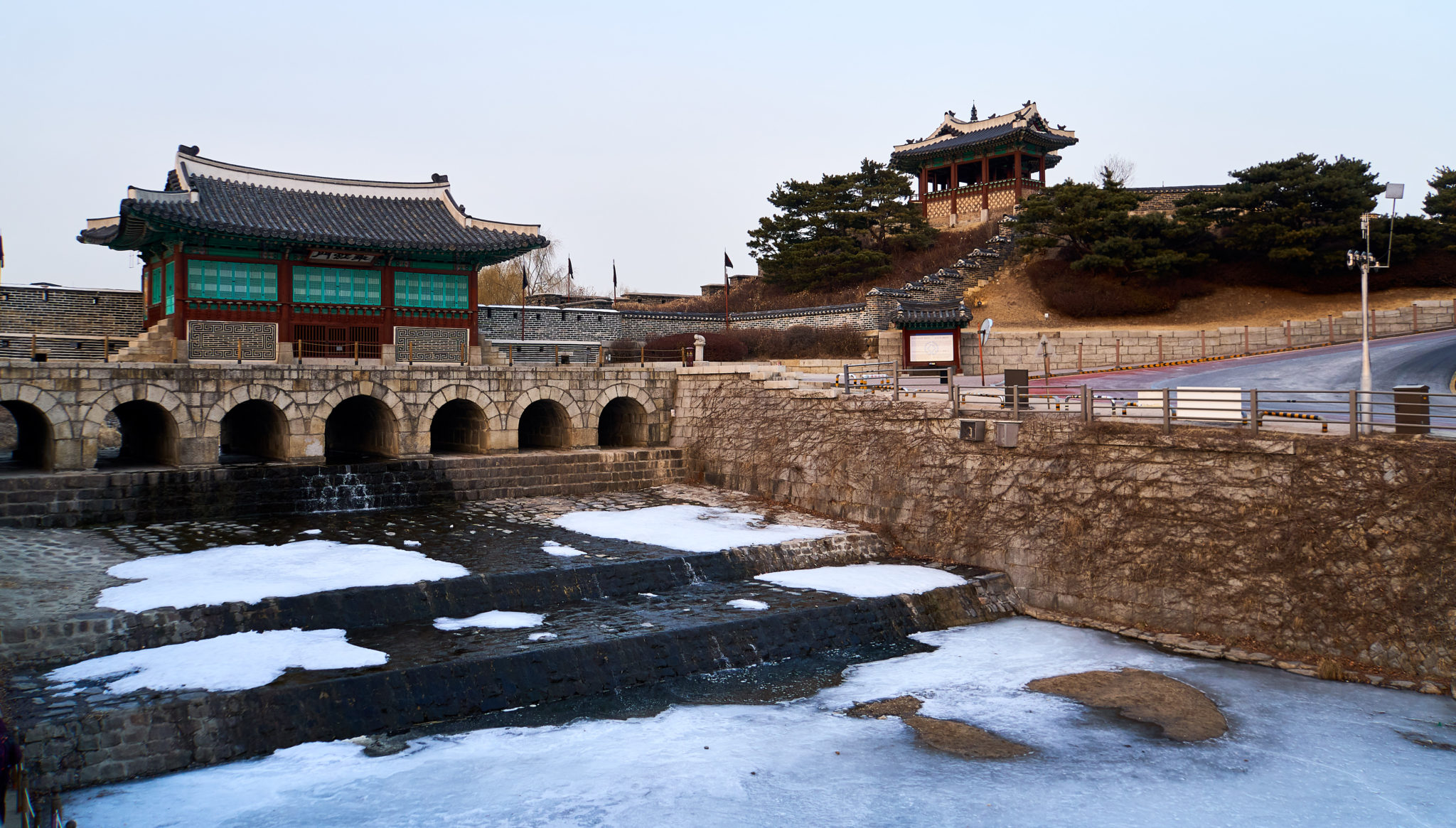 By the time we left the palace, the sun was starting to get low and we knew that wouldn’t be finishing the full wall walk today. However there was still one section of the wall that Suzy’s friend wanted to show us. So we walked along a small canal until we arrived at the Hwahongmun Gate. This was a part of the wall that allowed the Suwon river to cut through the wall. I’m thankful we saw this, especially during the winter with the river partially frozen.