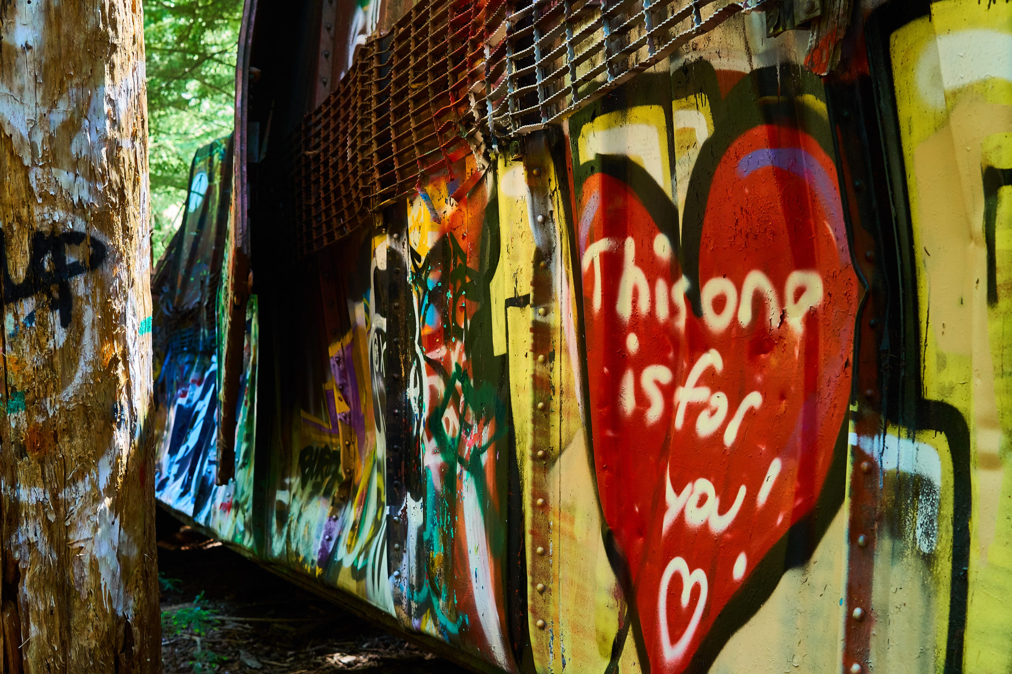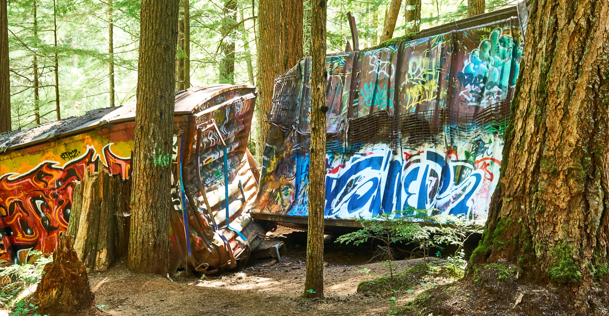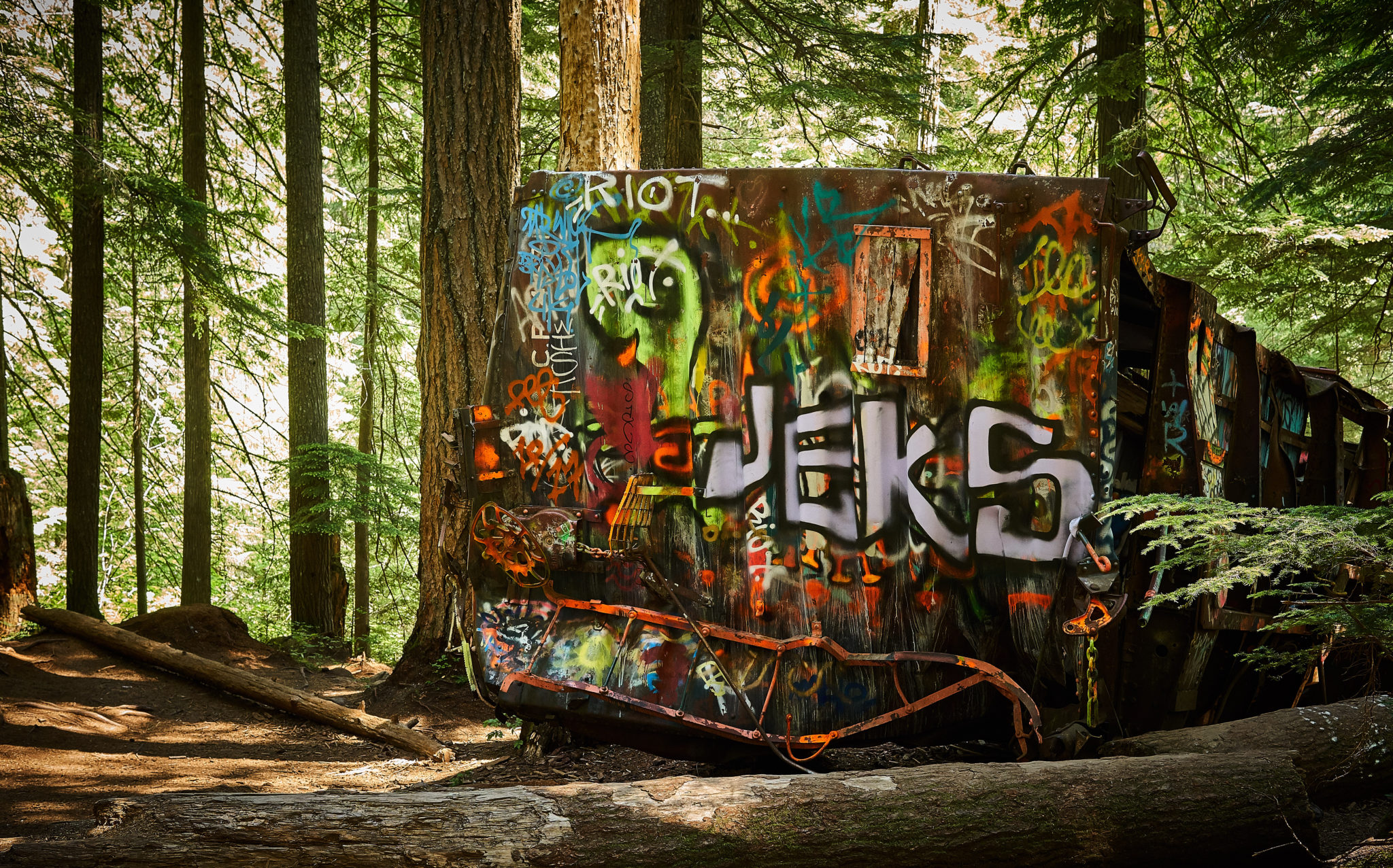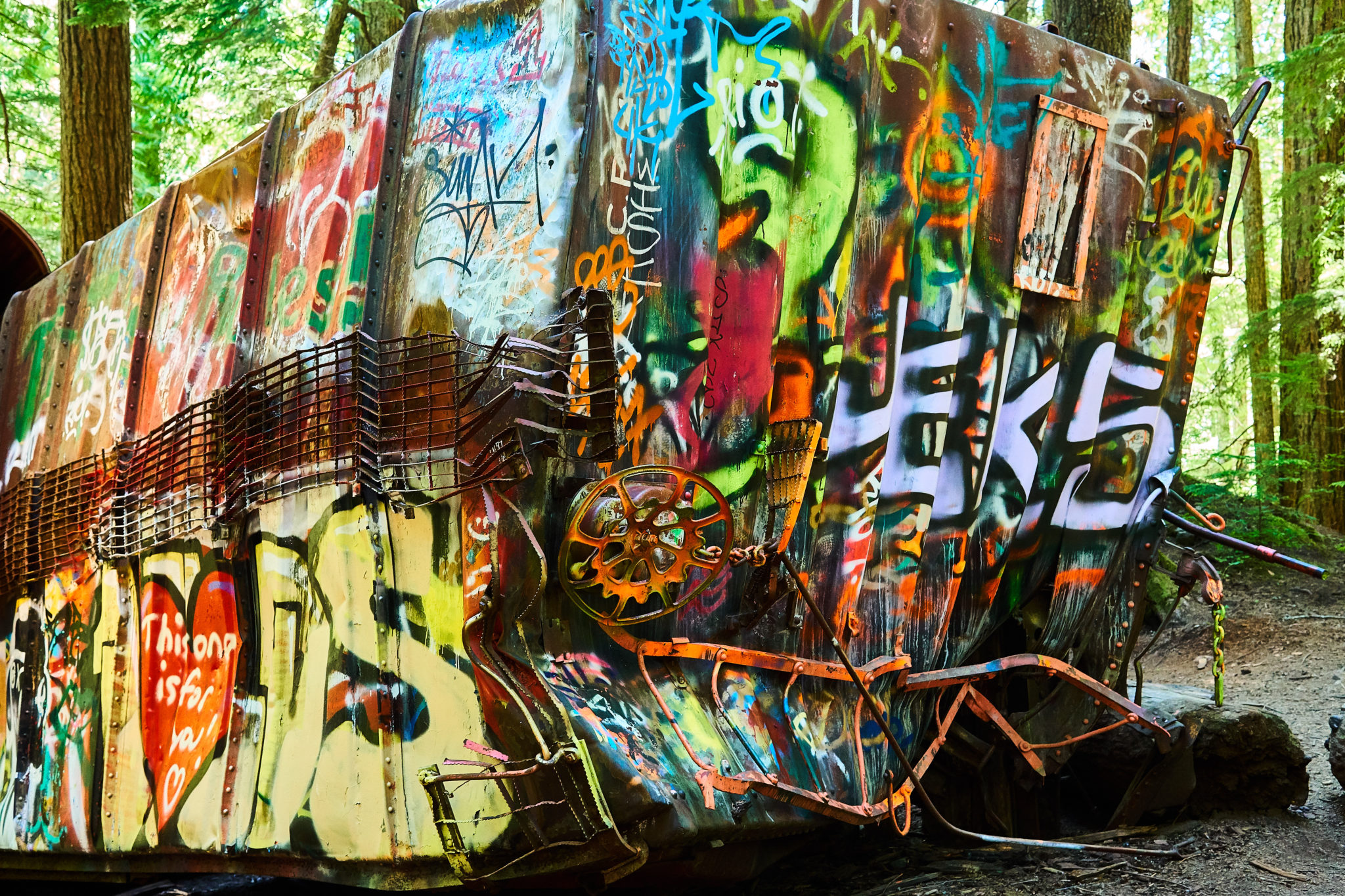 The next day, our plan was to visit the Train Wreck Hike. This is a short easy hike south of Whistler village. The story goes that there was a train wreck in the area and the remnants of the wreckage is what is on display in the forest now. The wreckage itself has been turned into an area for graffiti artists to show their craft and for mountain bikers to use for jumps and tricks.
