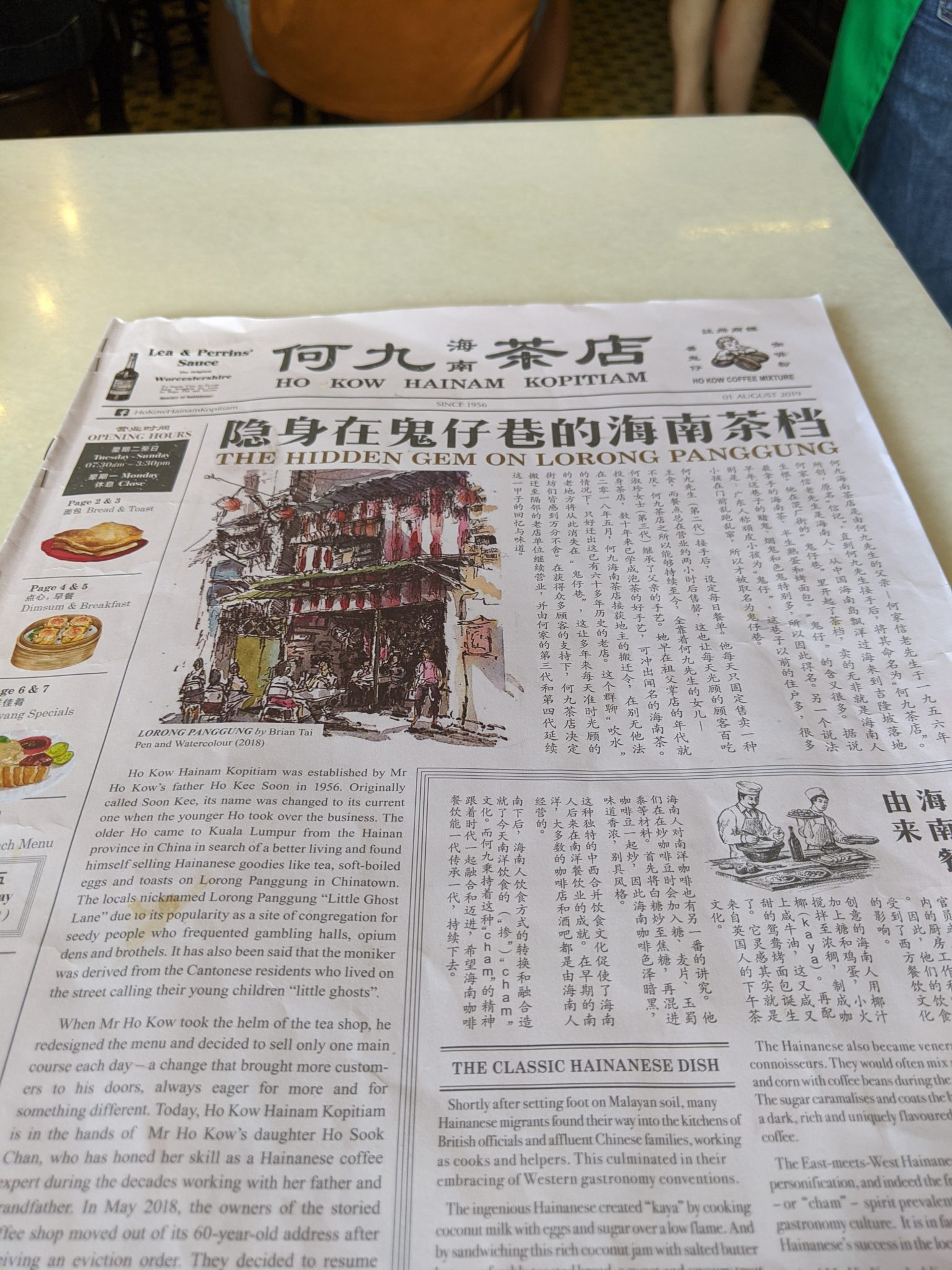 My Malaysian friend had recommended a great spot to eat, so I hop on a train and make my way to Ho Kow Hainam Kopitiam. When I arrive, I see that its already very busy. Leaving my name in their system, the wait takes a good 45 minutes! After settling into my spot I have a look at their menu. I really like the “newspaper” style of the menu. It makes browsing through the items more fun and actually makes the food offerings more appetizing too!