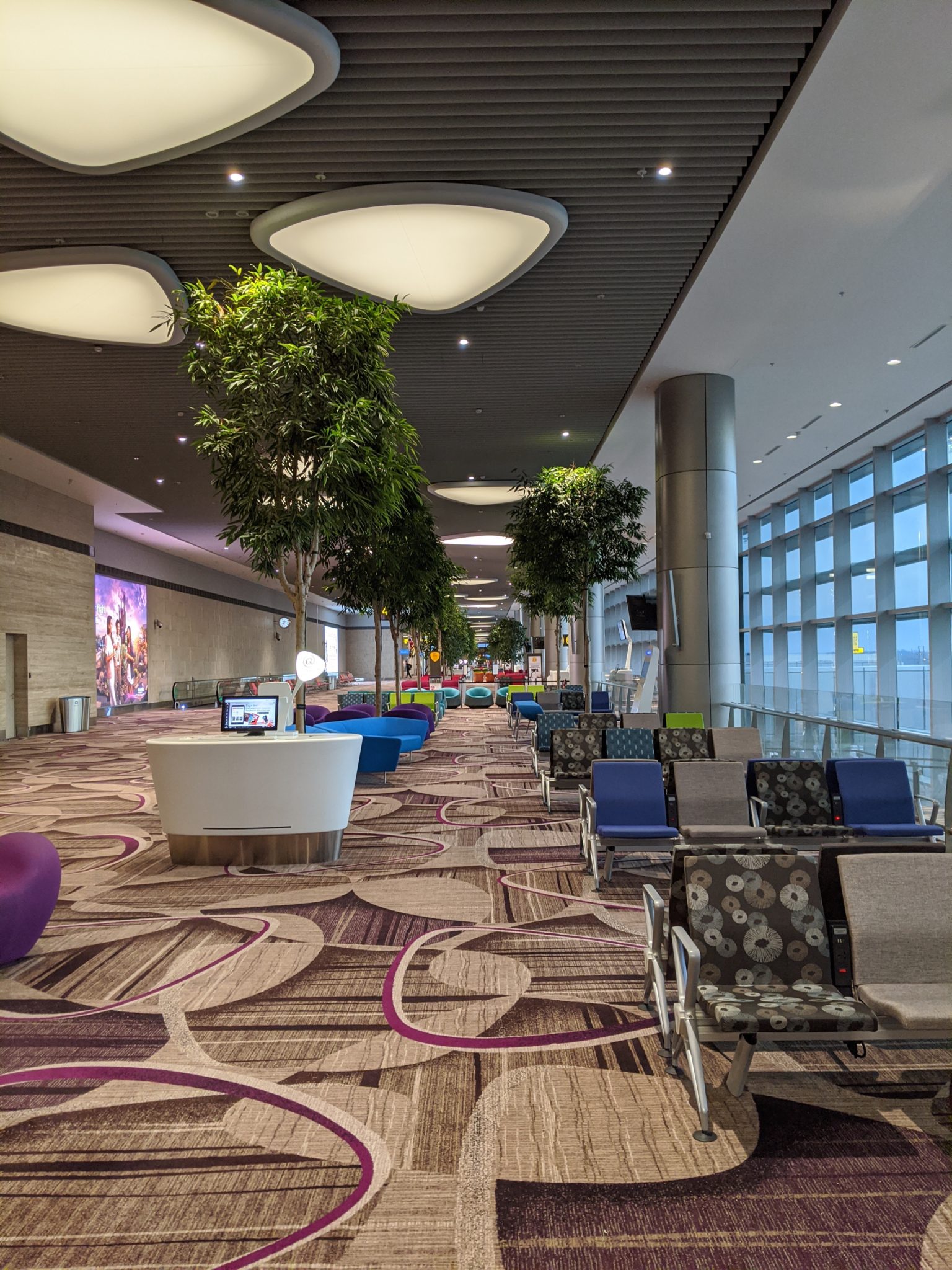Eventually most of the stores and amenities begin to close at the Jewel and I make my way over to Terminal 4 via a shuttle bus. Changi’s Terminal 4 is a brand new terminal and upon entering you almost get that “new car smell” from it. Its a pretty terminal and has some cool little features of its own! This includes a part of the wall that looks like its just part of the façade, but is actually a screen that periodically has a small “show” that runs!