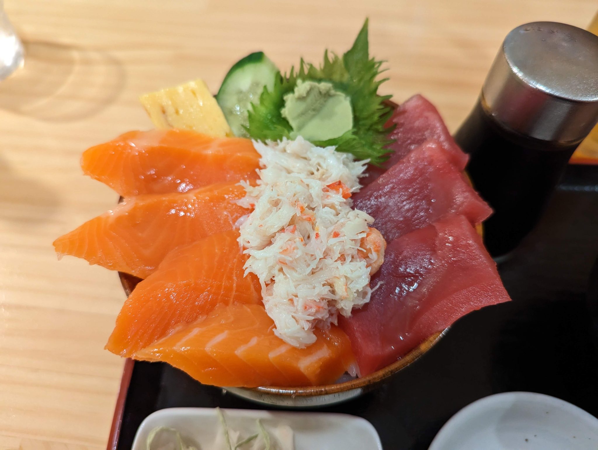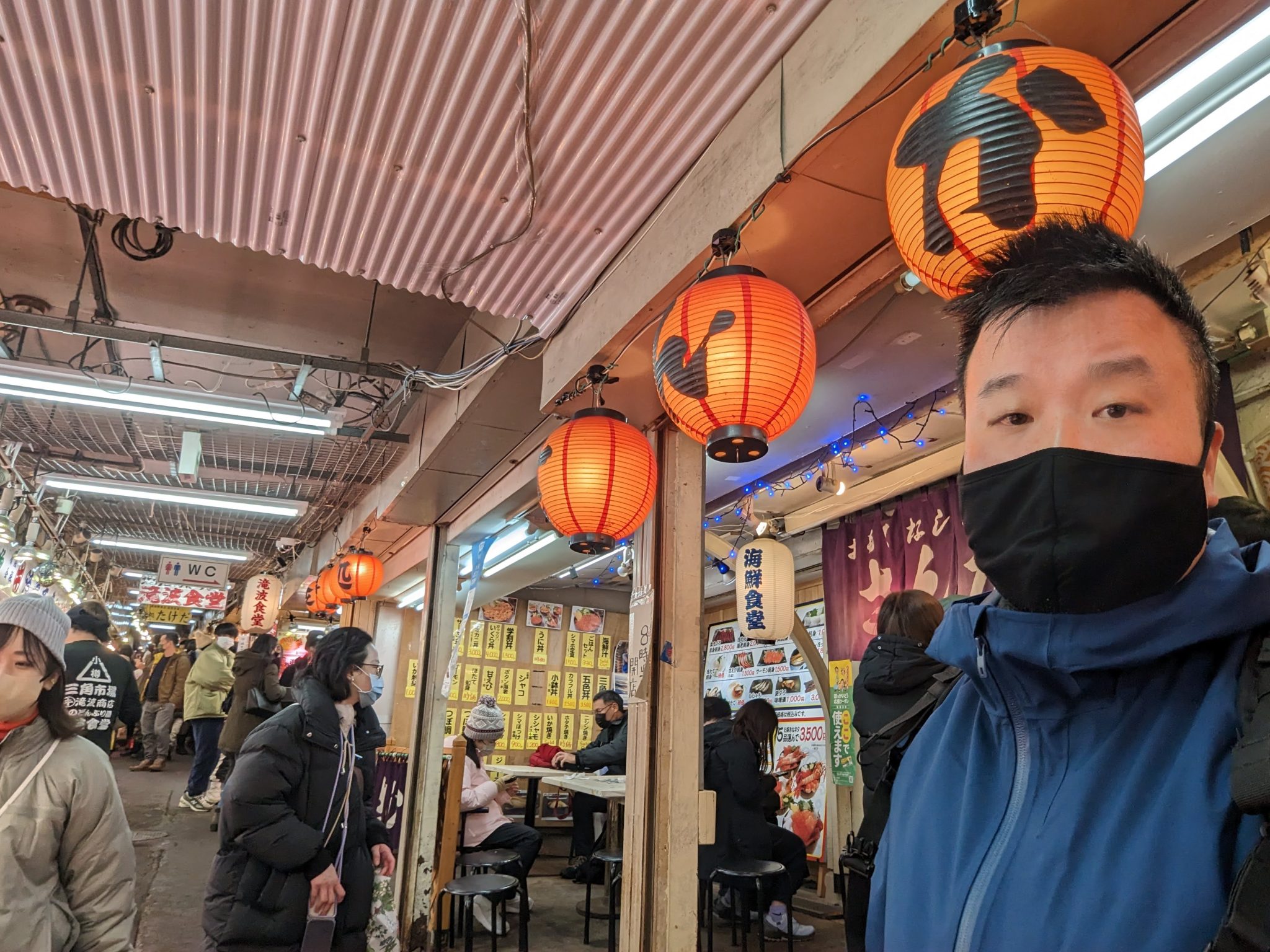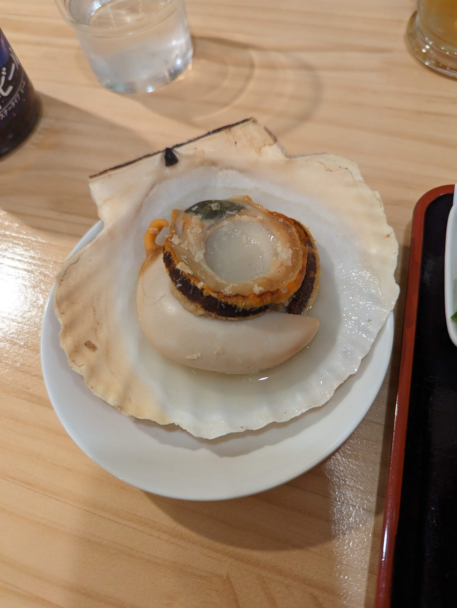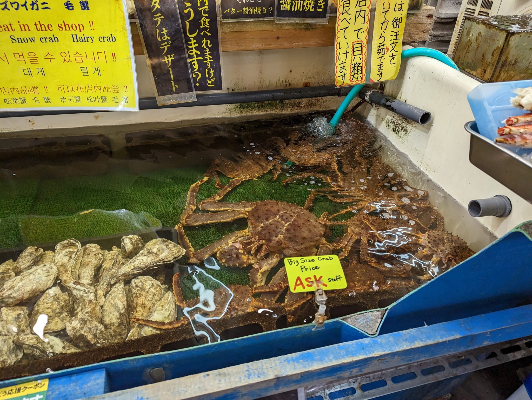 After trying to gauge the “waiting in line” to satisfaction ratio for many of these restaurants, I settle on Sankaku-tei. After a short wait, my name gets called and I’m seated. I order a seafood rice bowl along with a grilled scallop. I’m not sure if its due to the whisky of the stroll through the market, but I devour everything in what feels like seconds! It really hits the spot and I wouldn’t hesitate to recommend this spot to anyone else in the area!
