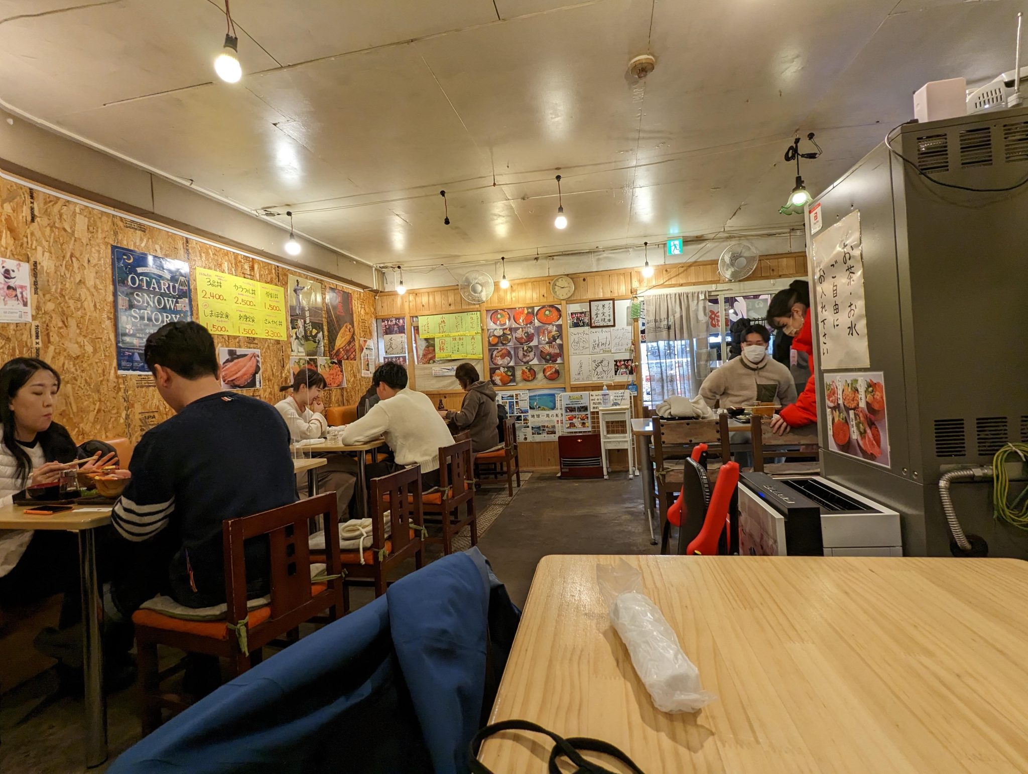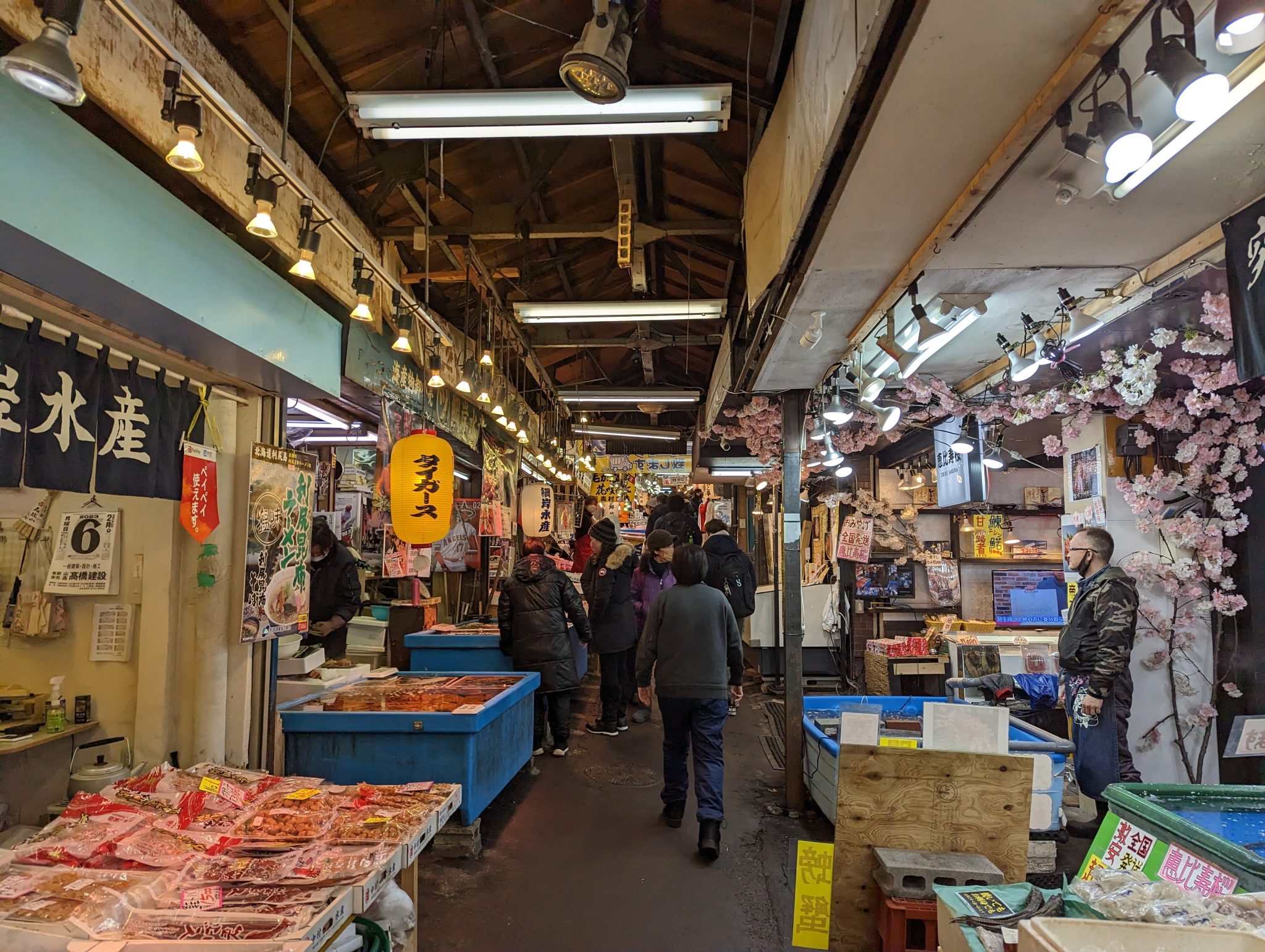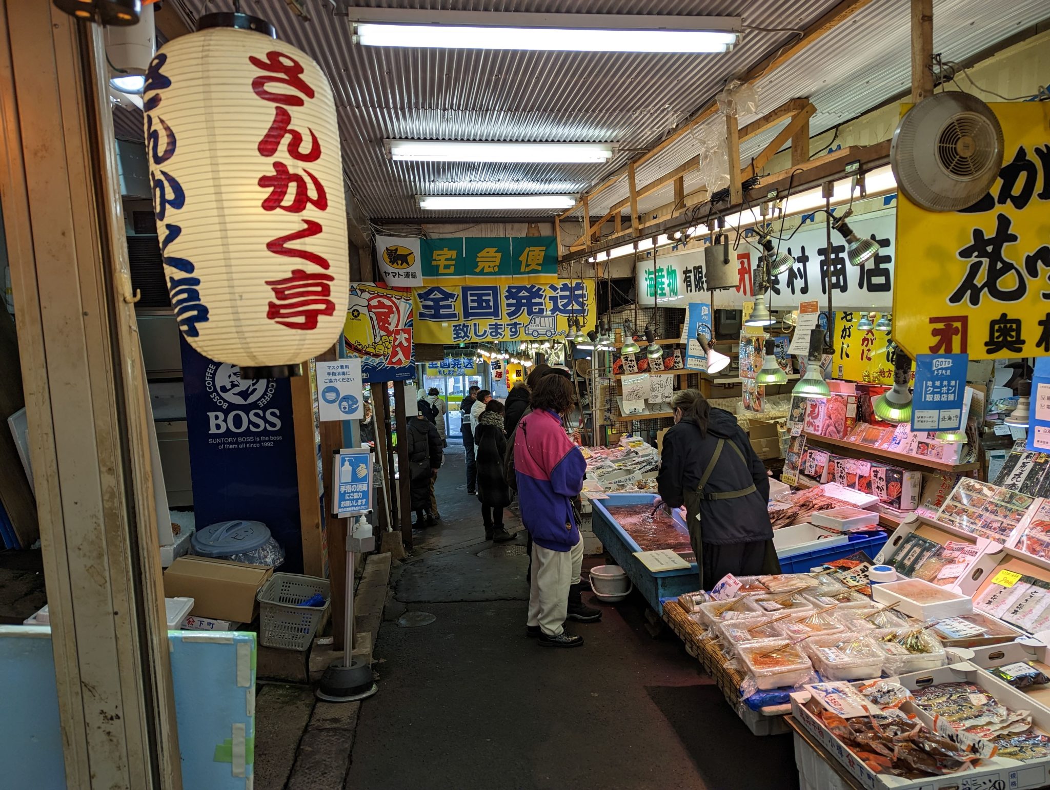 After exiting the Otaru Train station, I make the short walk to the Sankaku Market. This is a popular fish/seafood market with many little spots to eat fresh seafood. Upon entering the walkway is lined with shops selling all manner of beautiful looking seafood. It’s hard not to feel your appetite growing as you peruse through the different storefronts. Thankfully there are also plenty of small restaurants interspersed between the merchants selling wonderfully tasty looking meals as well.