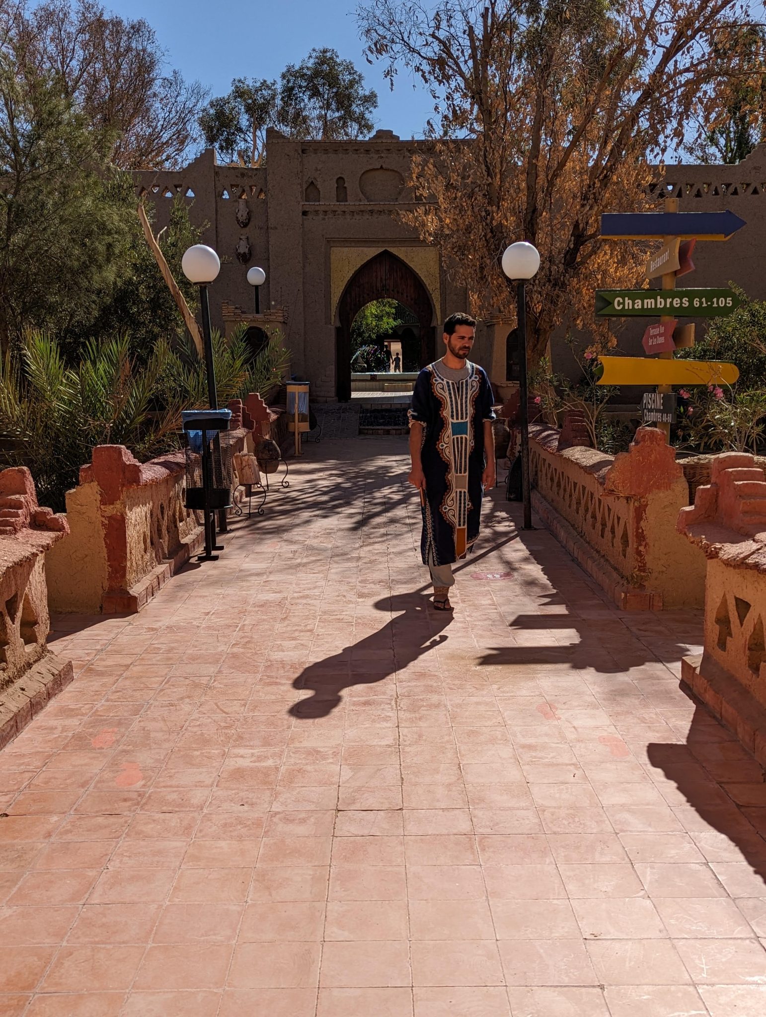 After a few more hours of driving we arrive at La Kasbha Charme Dunes D’Or. From the outside it looks a little dusty, but once you get inside the main gate it opens up into what I can only describe as a desert resort! There are two main pools in the courtyards and surrounding each pool are the rooms. Our room is easily the largest room we’ve had the entire trip! What makes this place even cooler is its all built from “scratch”. They use the same mud mixture they would for traditional building. You can tell because even by the bed there are bits of hay/sand you can scratch off the walls if you try hard enough!