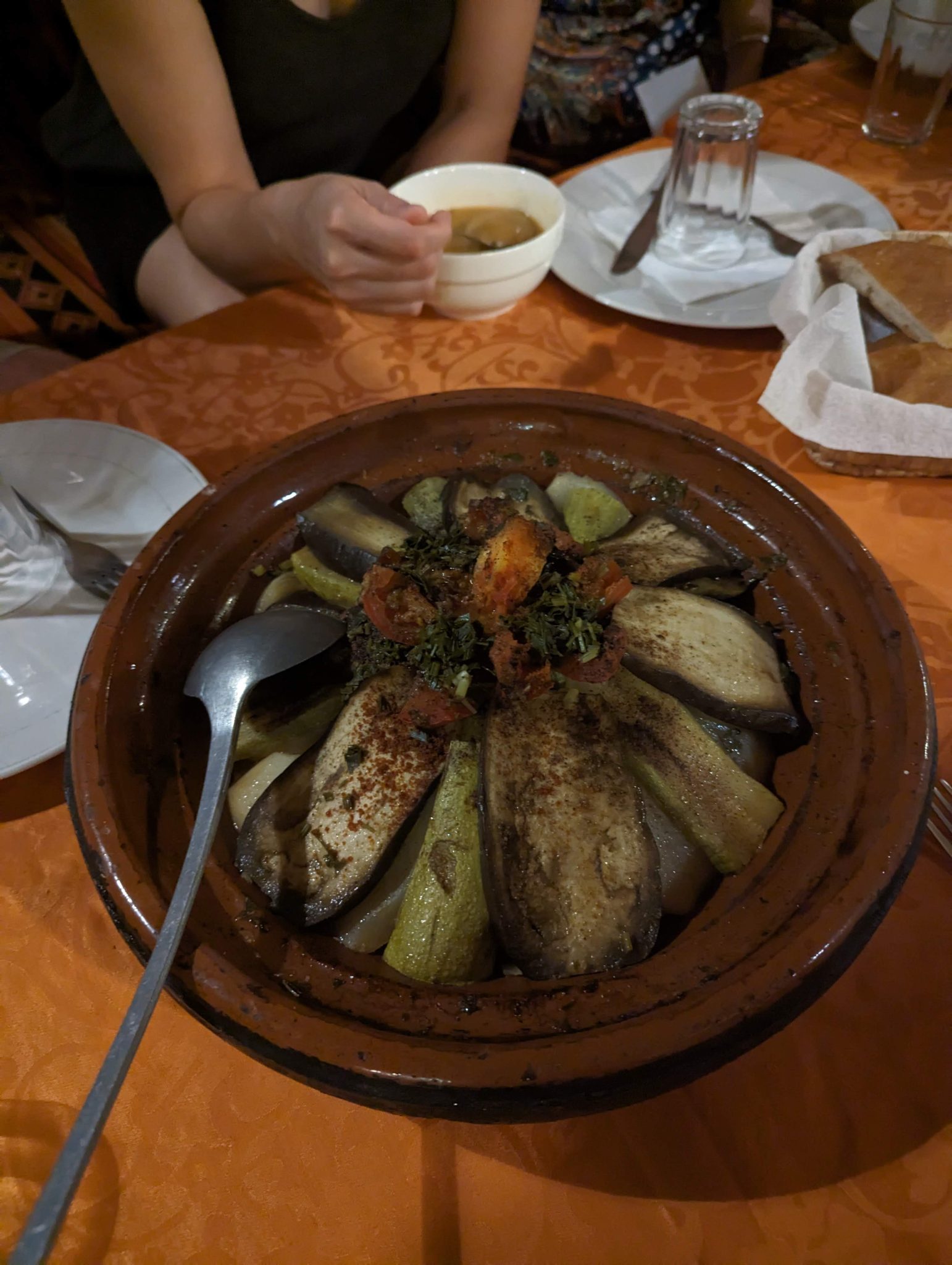 Given there aren’t many establishments in this part of the world. We have dinner at our hotel. Upon arriving we are treated to a traditional tagine and soup! If I recall correctly, this is the first soup of the trip and not something I would expect to be having given the environment we’re in. But in both cases the food is very very good and certainly hits the spot after a long day of transit and the exhilaration of the camel ride.