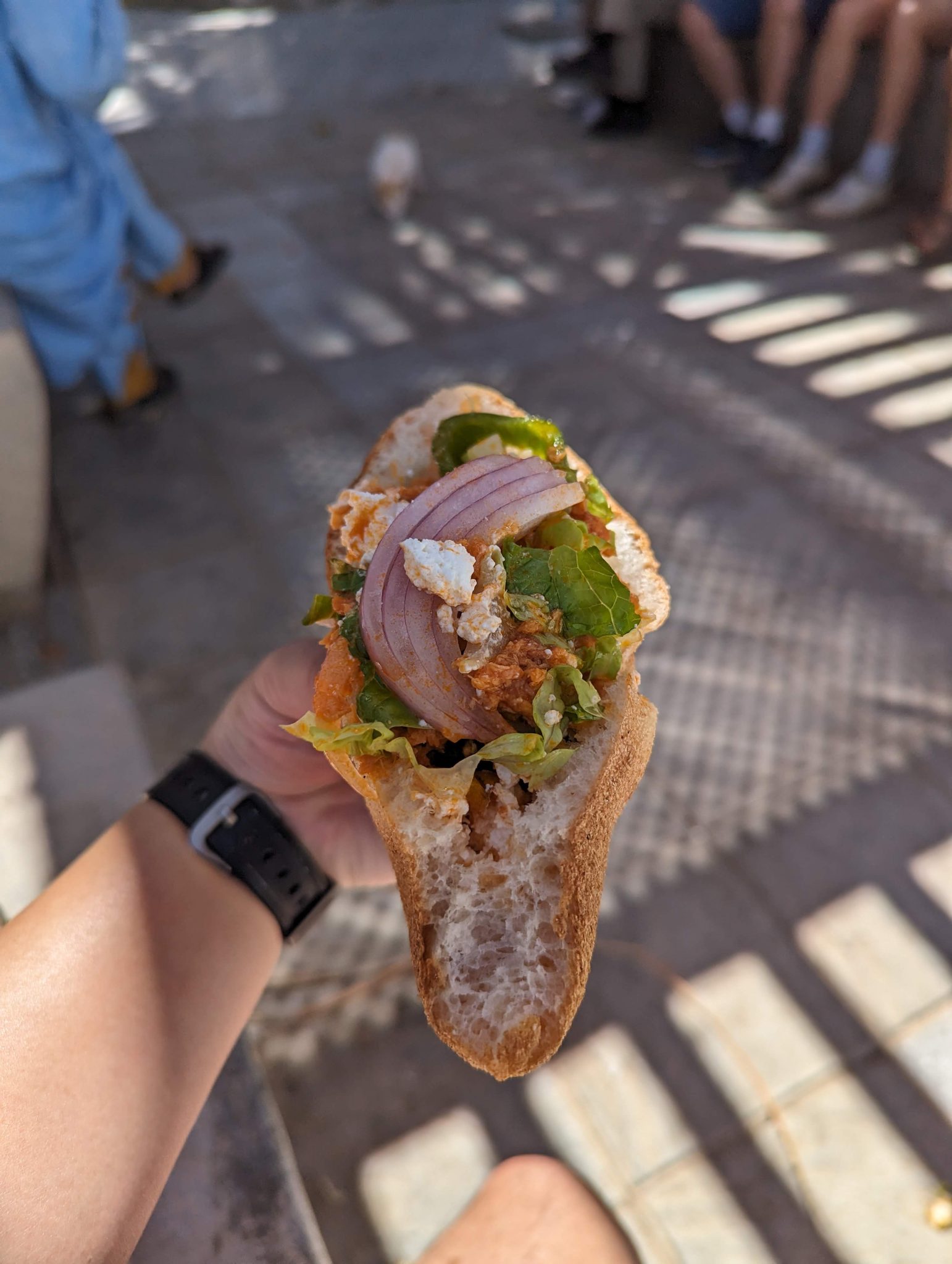After a few hours of driving, we eventually stop for lunch. Seemingly in the middle of nowhere is this more “developed oasis”. It’s almost like a “rest stop” in North America. On the side of the road there is this neat area that cars can stop at and there are spots for sitting, eating and even swimming! Along the way Said had been collecting different ingredients so that we could have a picnic at this spot! After setting up, and preparing the food we all got to make our own wraps for lunch. Normally I’m a bit leery about a veggie heavy meal being satisfying for me. However, loading up on the veggies and adding a small scoop of marinated tuna turns out to be an amazing recipe! I devour my wrap and it’s actually very filling so I’m happy to be wrong about my preconception!