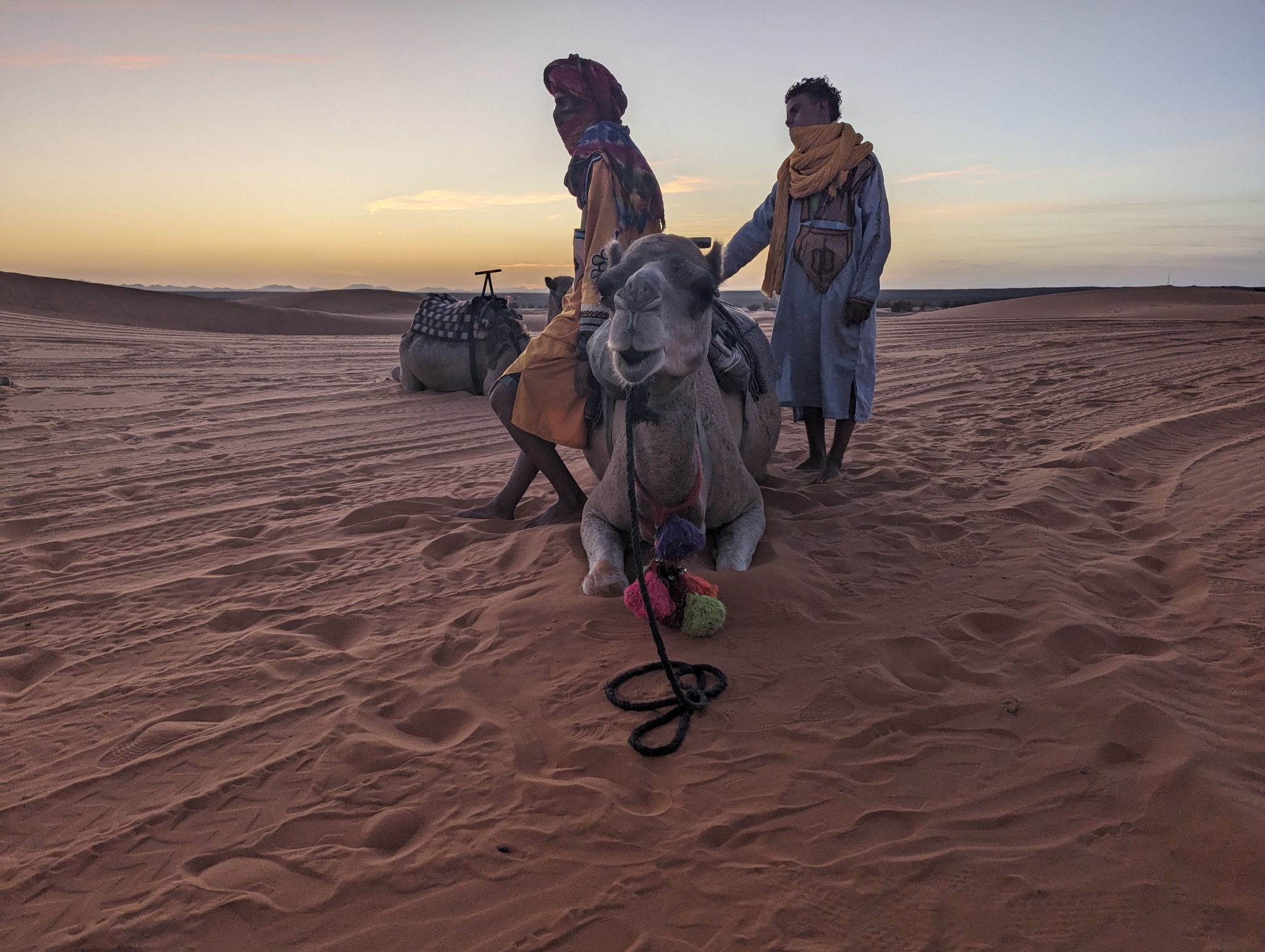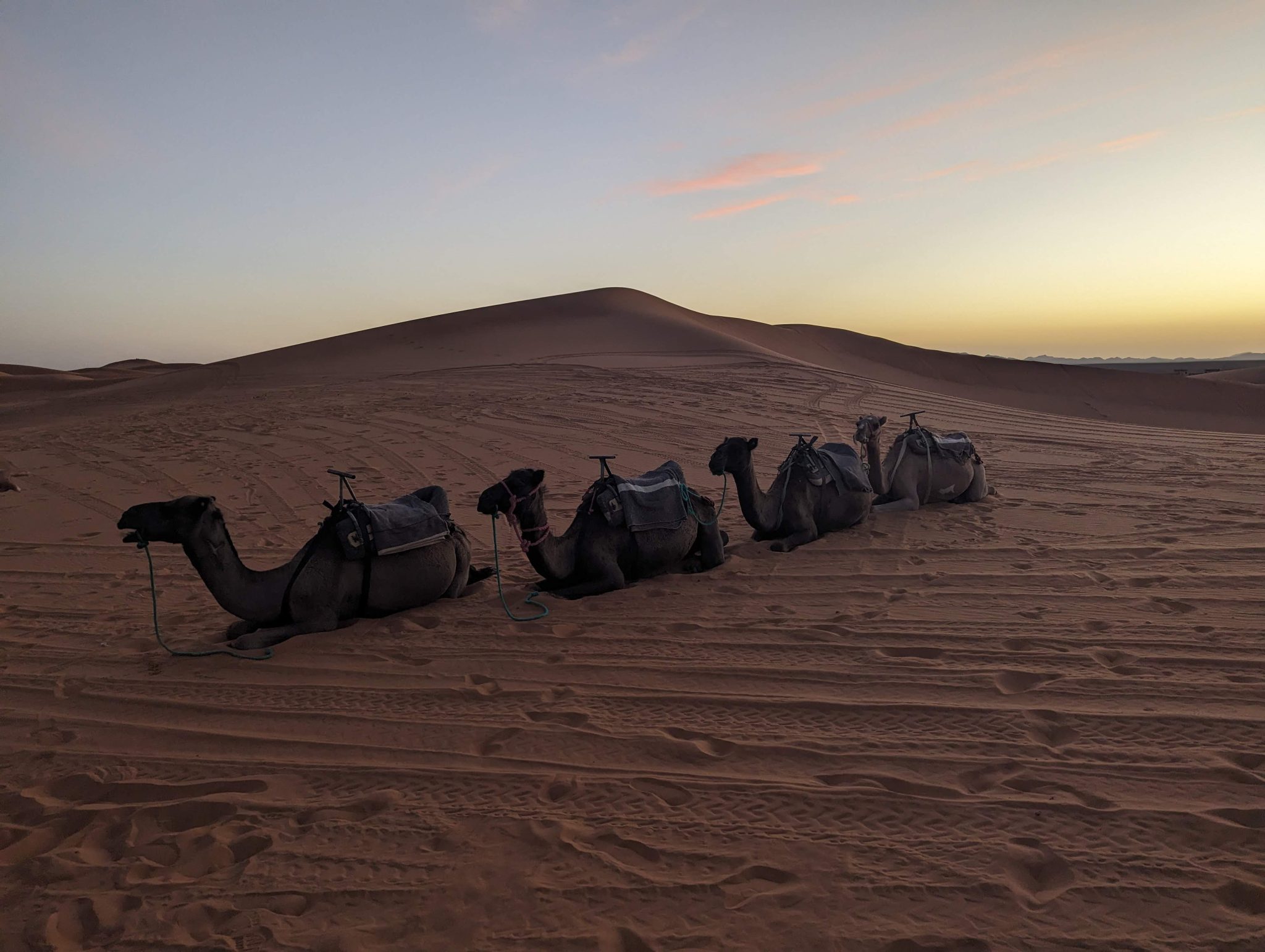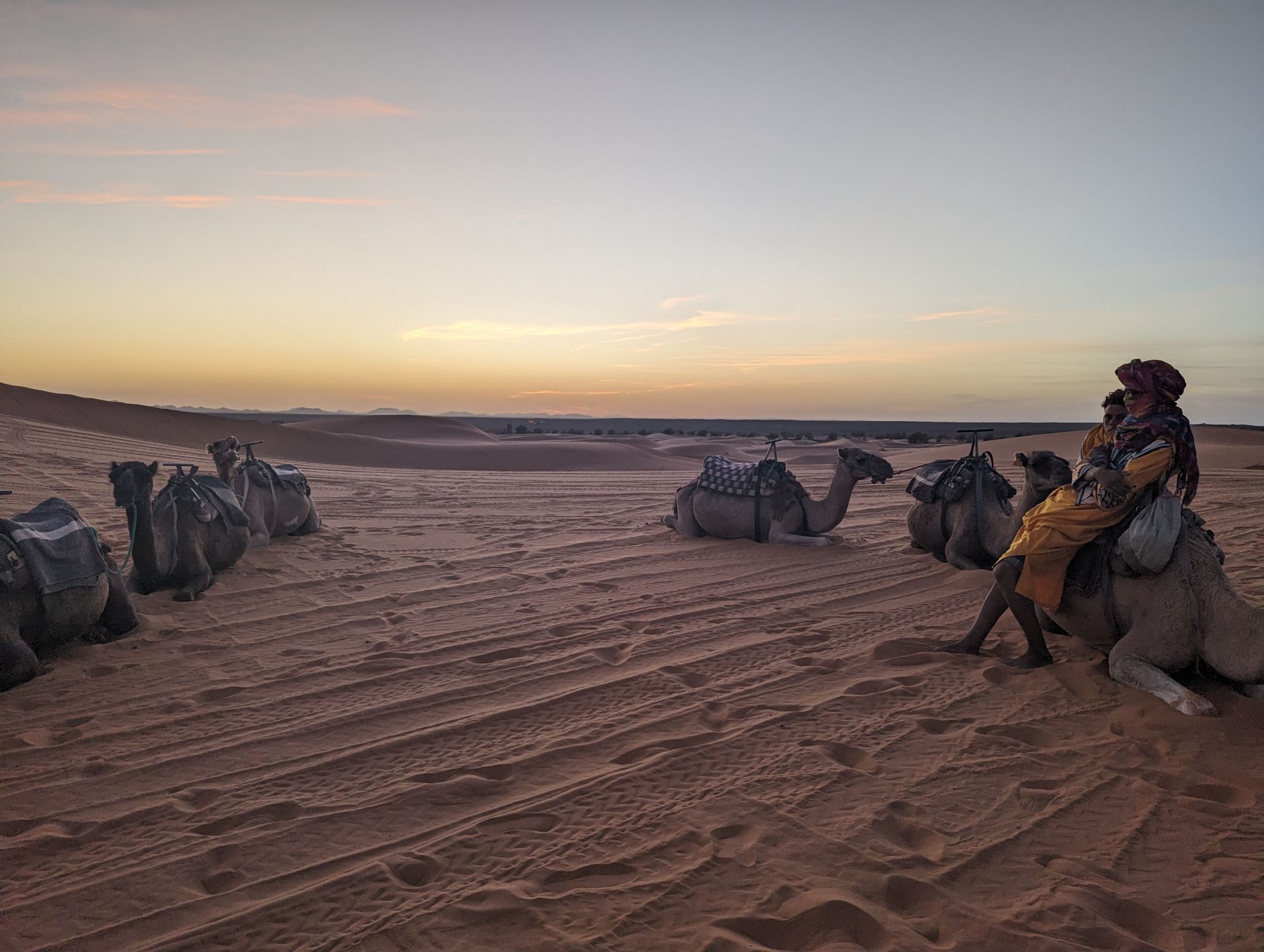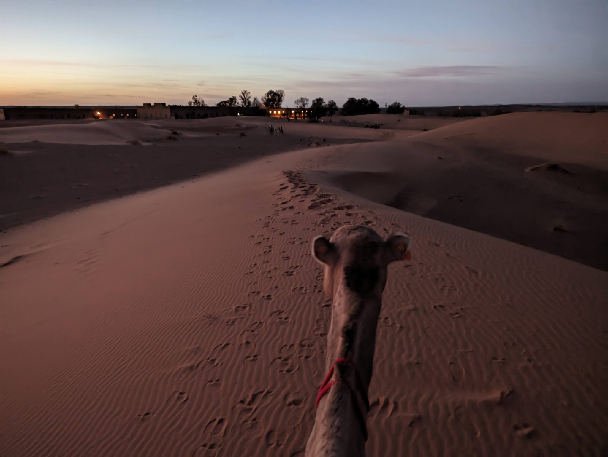 We hang out until the sun disappears and then we make our way back to our camels. Everyone gets back on and we now make our evening “ride” back to our hotel for dinner. While we start to lose light quite quickly. It’s still incredibly scenic to see the desert in a different “light”.