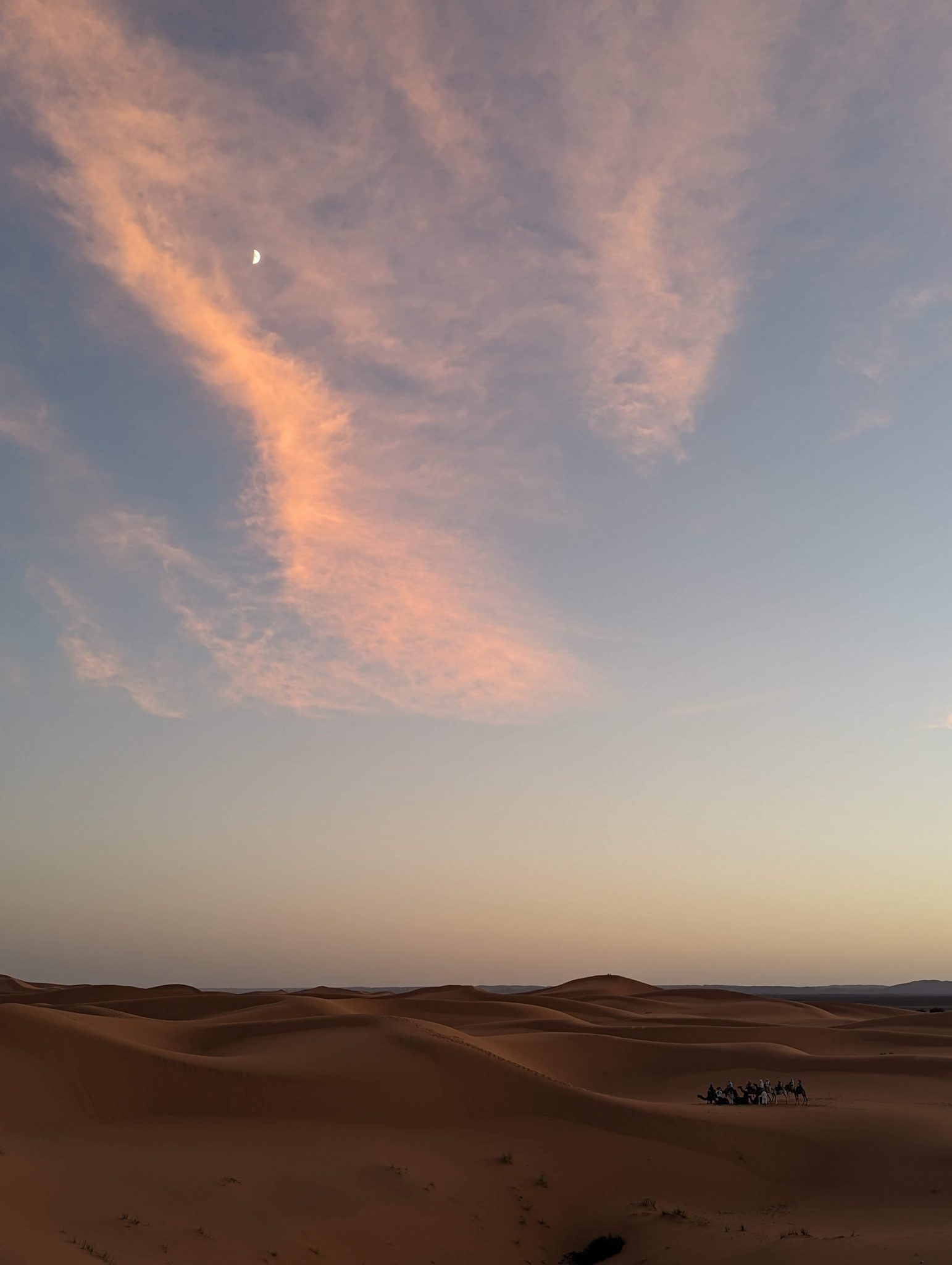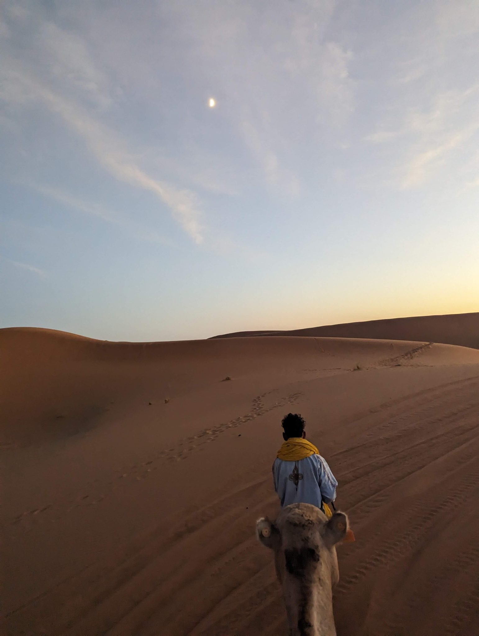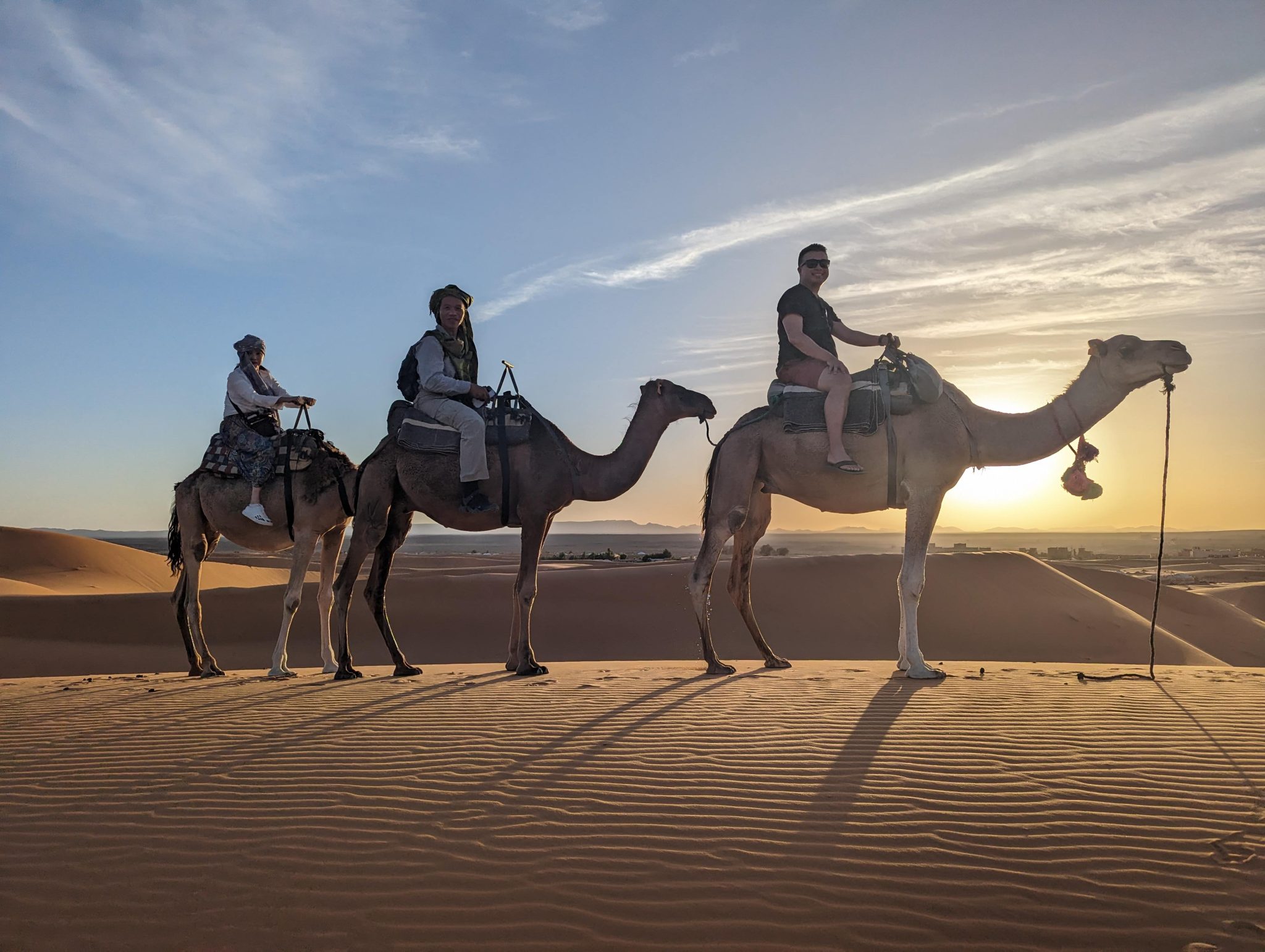 We hang out until the sun disappears and then we make our way back to our camels. Everyone gets back on and we now make our evening “ride” back to our hotel for dinner. While we start to lose light quite quickly. It’s still incredibly scenic to see the desert in a different “light”.