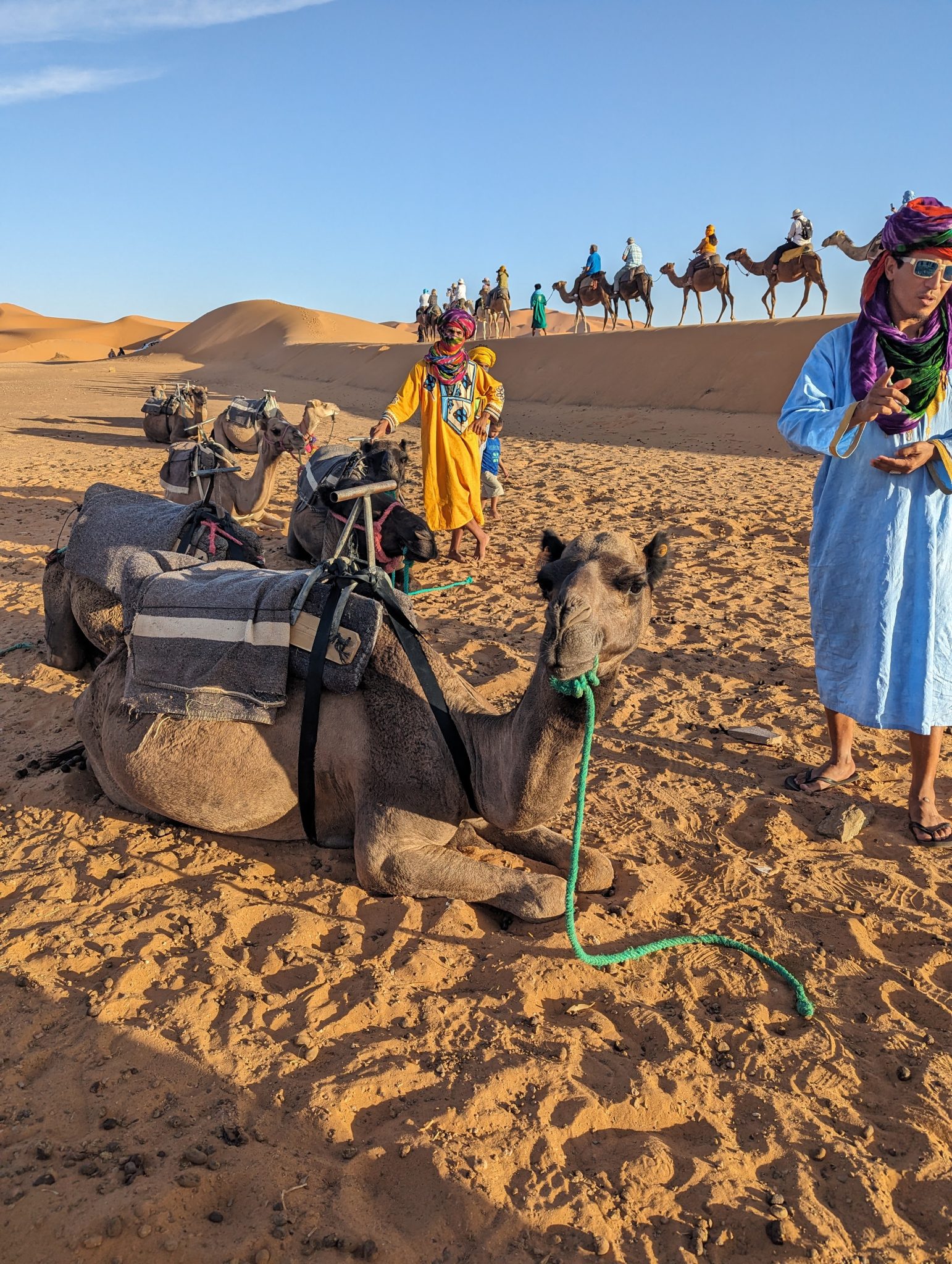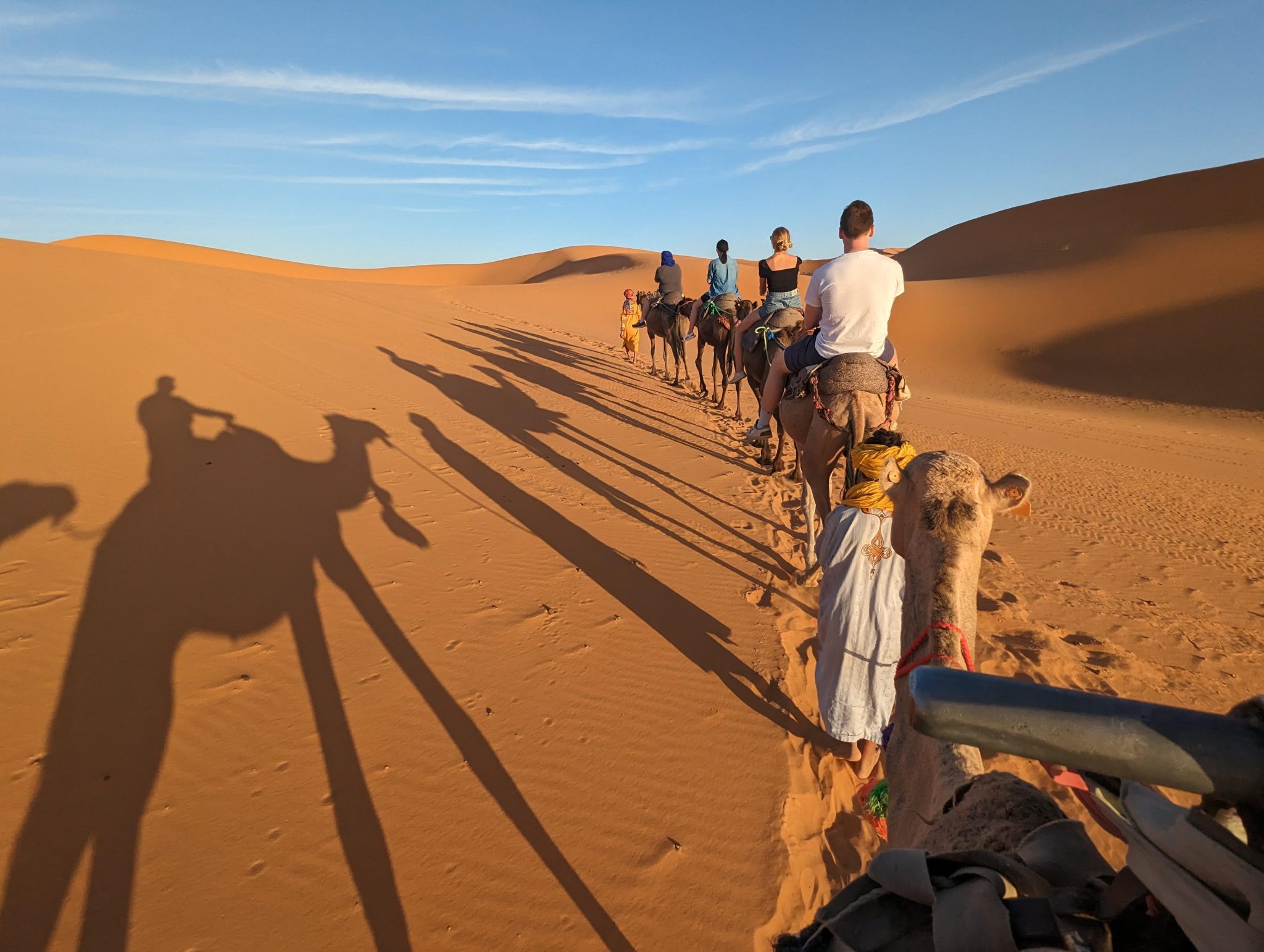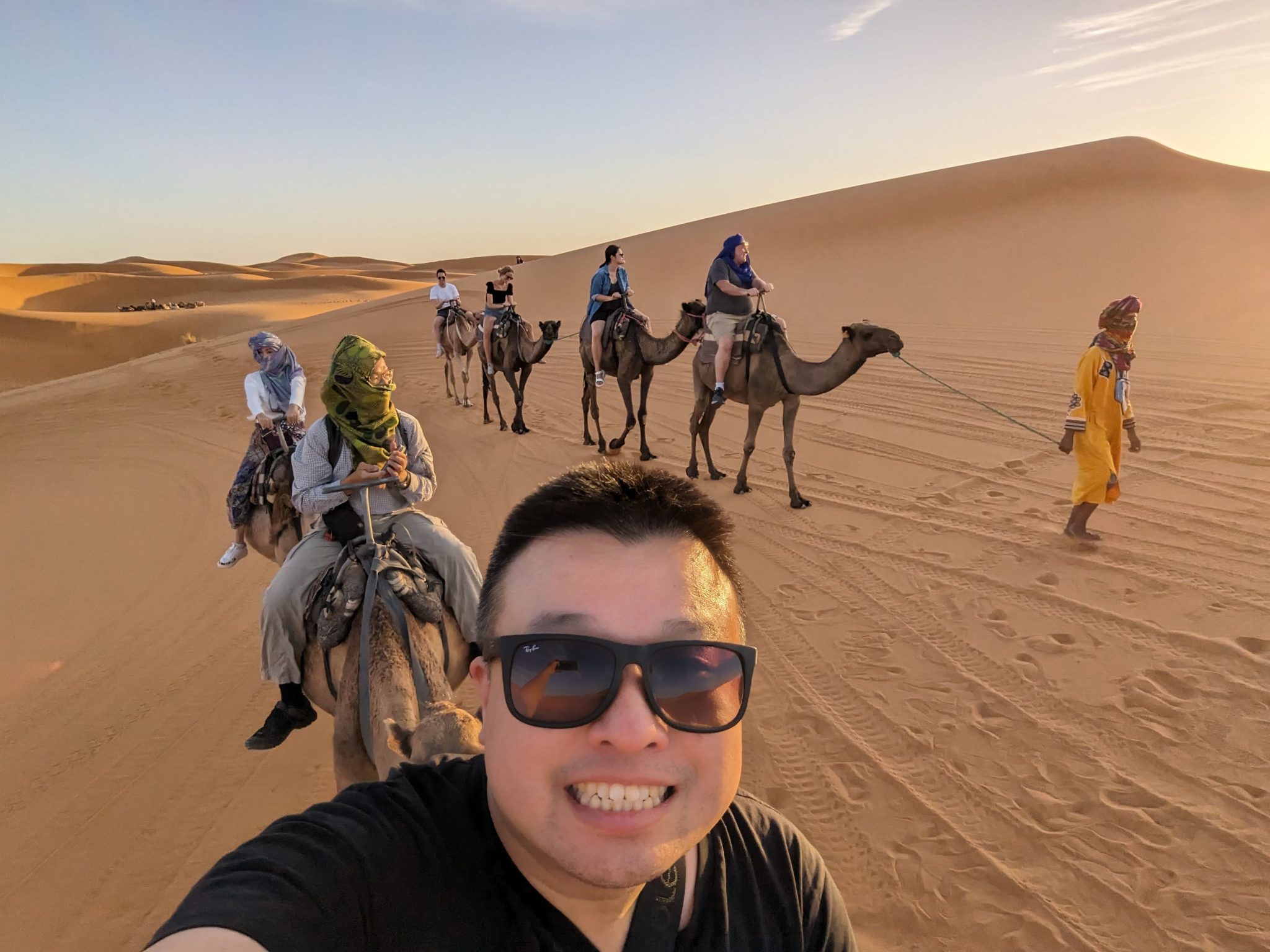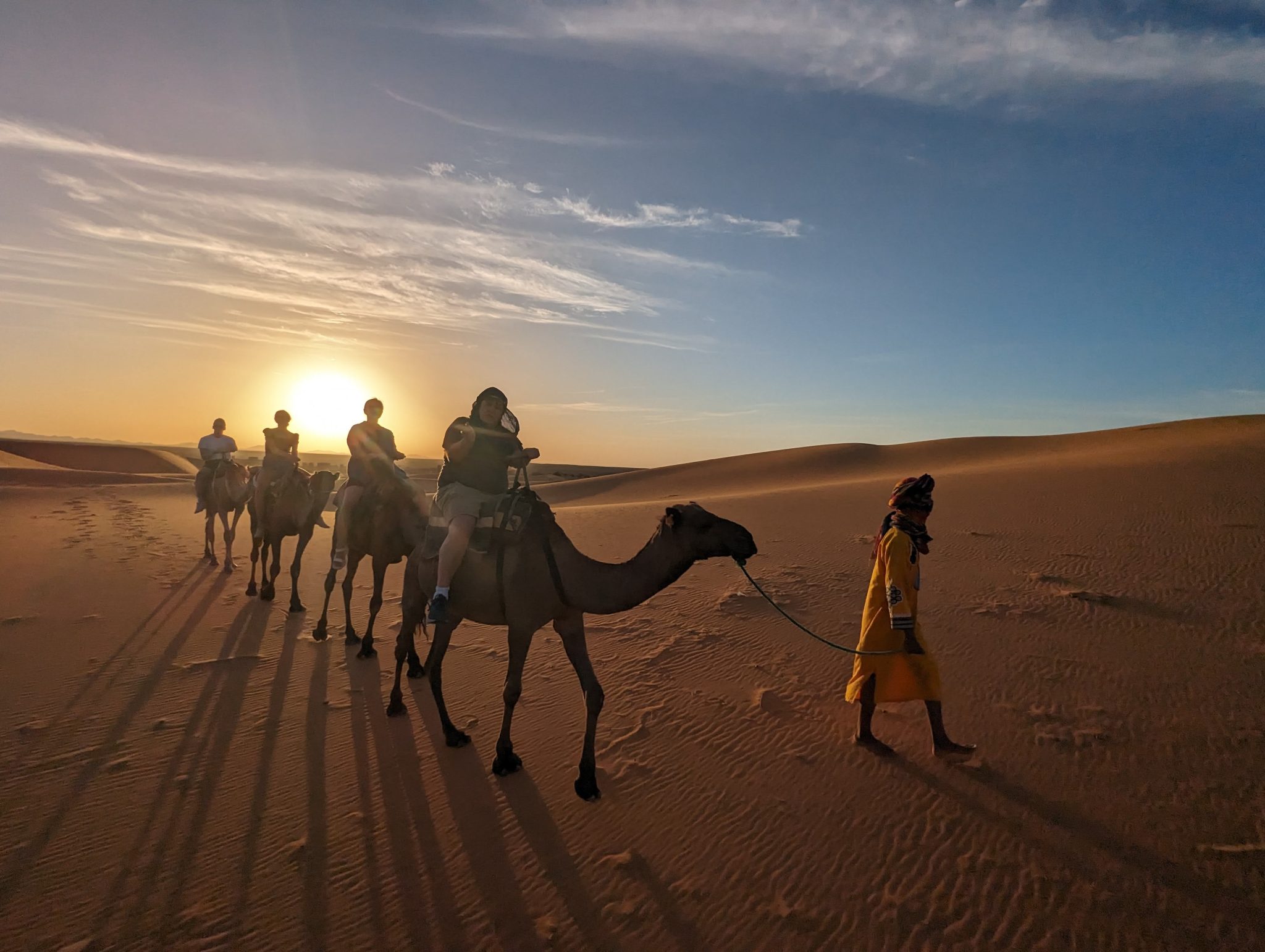 We hang out until the sun disappears and then we make our way back to our camels. Everyone gets back on and we now make our evening “ride” back to our hotel for dinner. While we start to lose light quite quickly. It’s still incredibly scenic to see the desert in a different “light”.