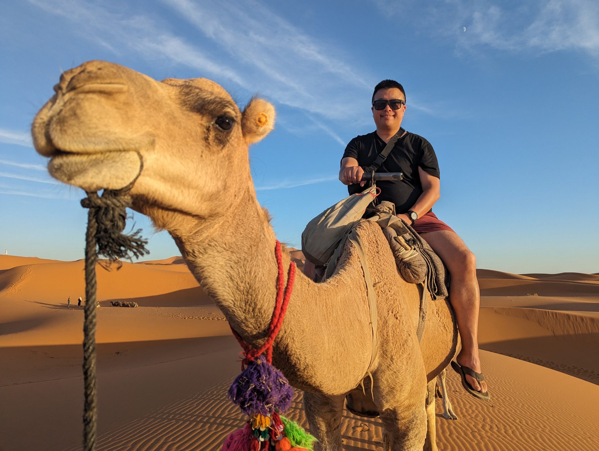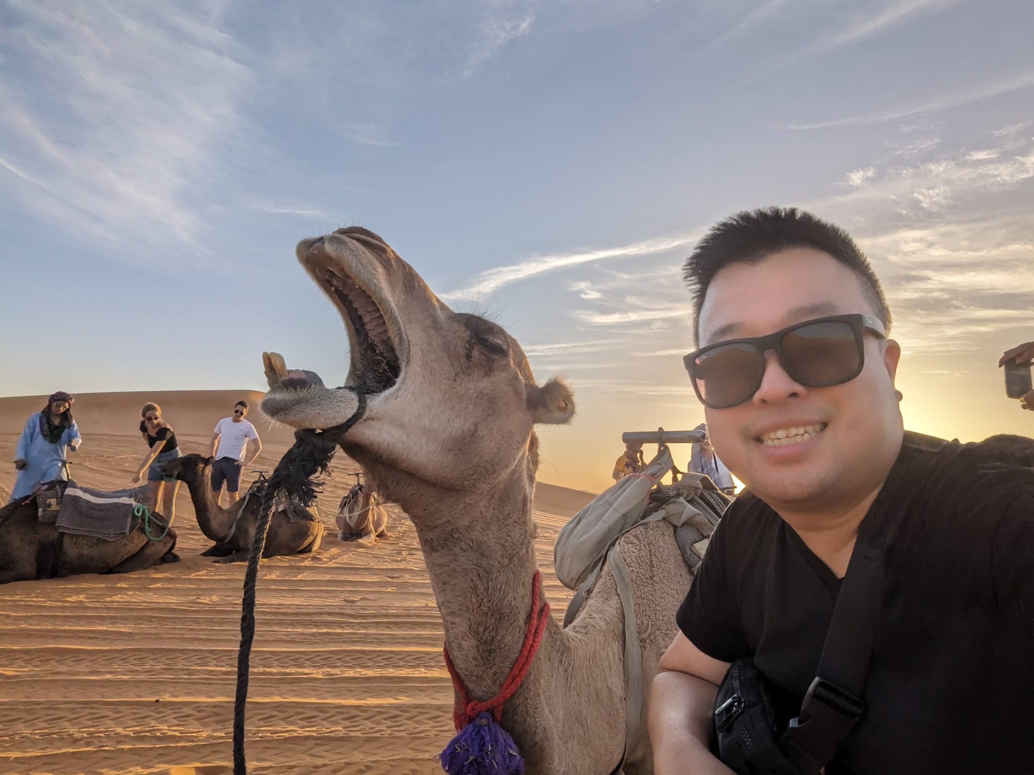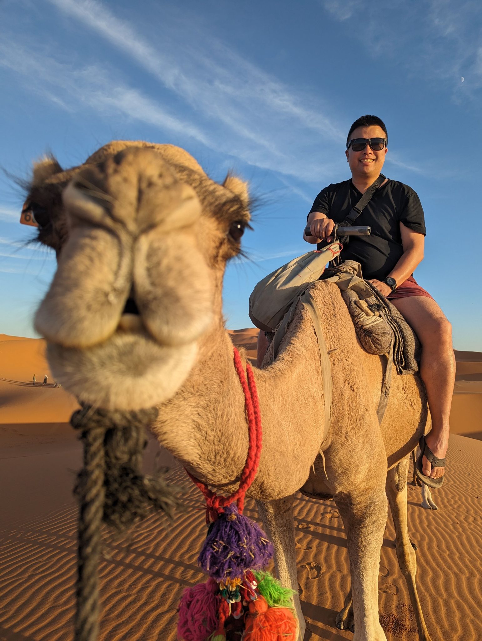 After having an hour or two to settle into our rooms, we had to the back of our hotel where our plan is to ride camels into the desert and watch the sunset! This isn’t the first time Gimpy or I have rode camels before. We’ve done it once in Egypt and another time in Dubai. However this time feels a bit different. Facing “away” from our hotel you see nothing but dunes. On our other rides you’re still near civilization, but in this case you can almost feel like you’re riding into the vastness of the desert! (Though I’m very aware it’s still guided and a part of a tour!)