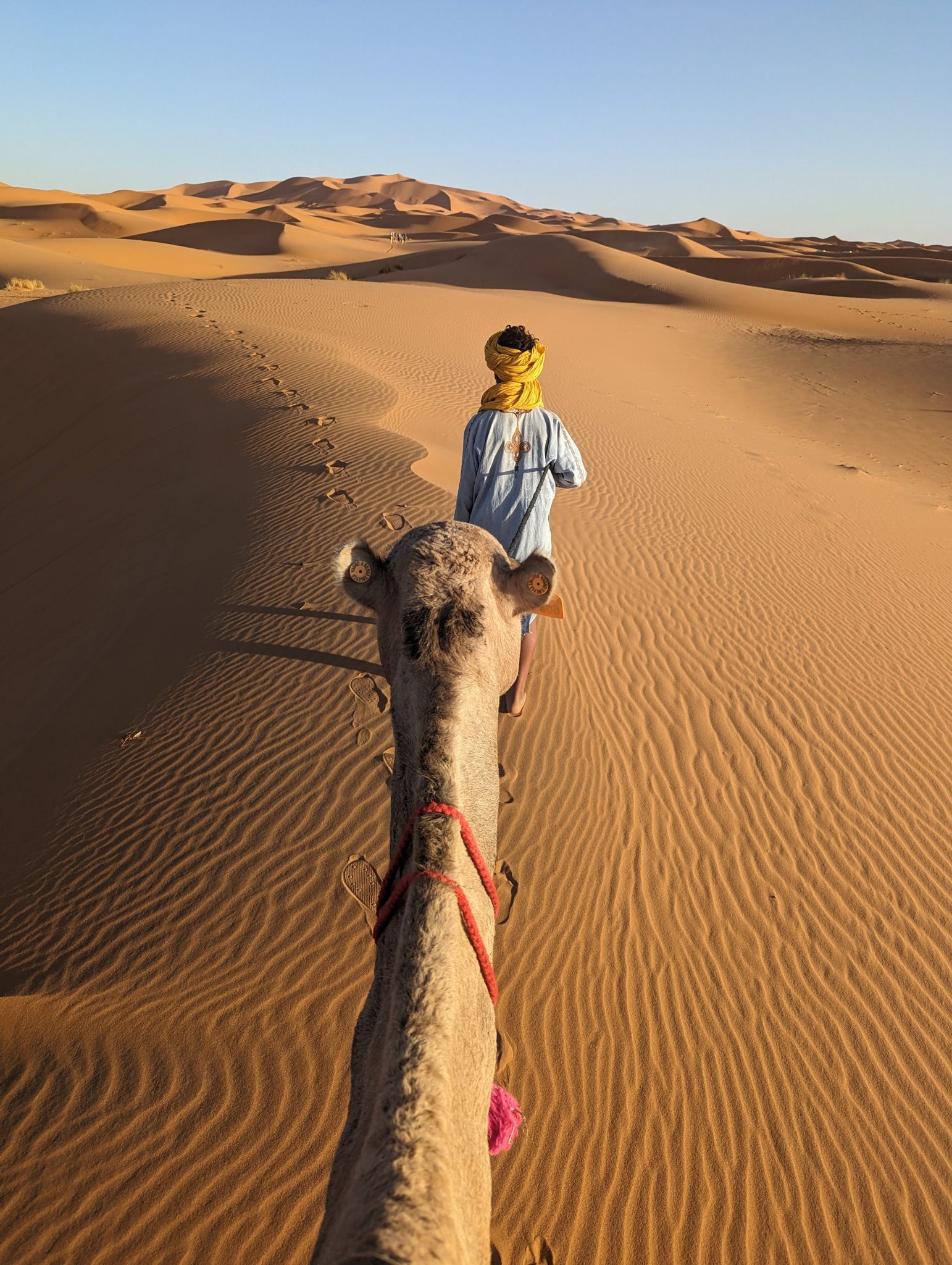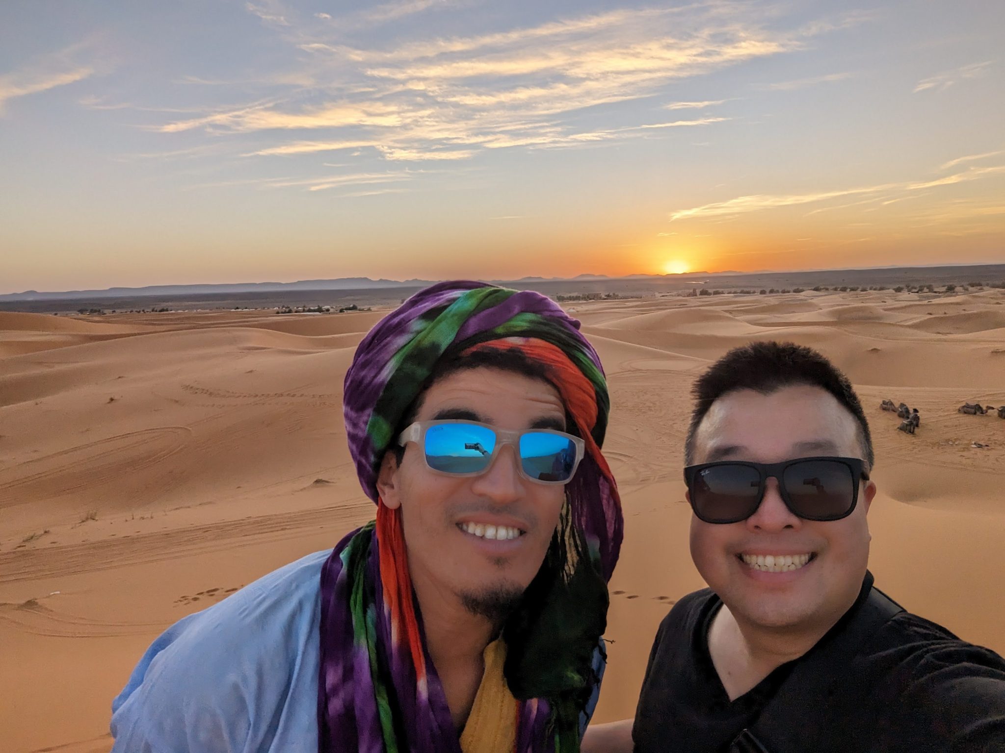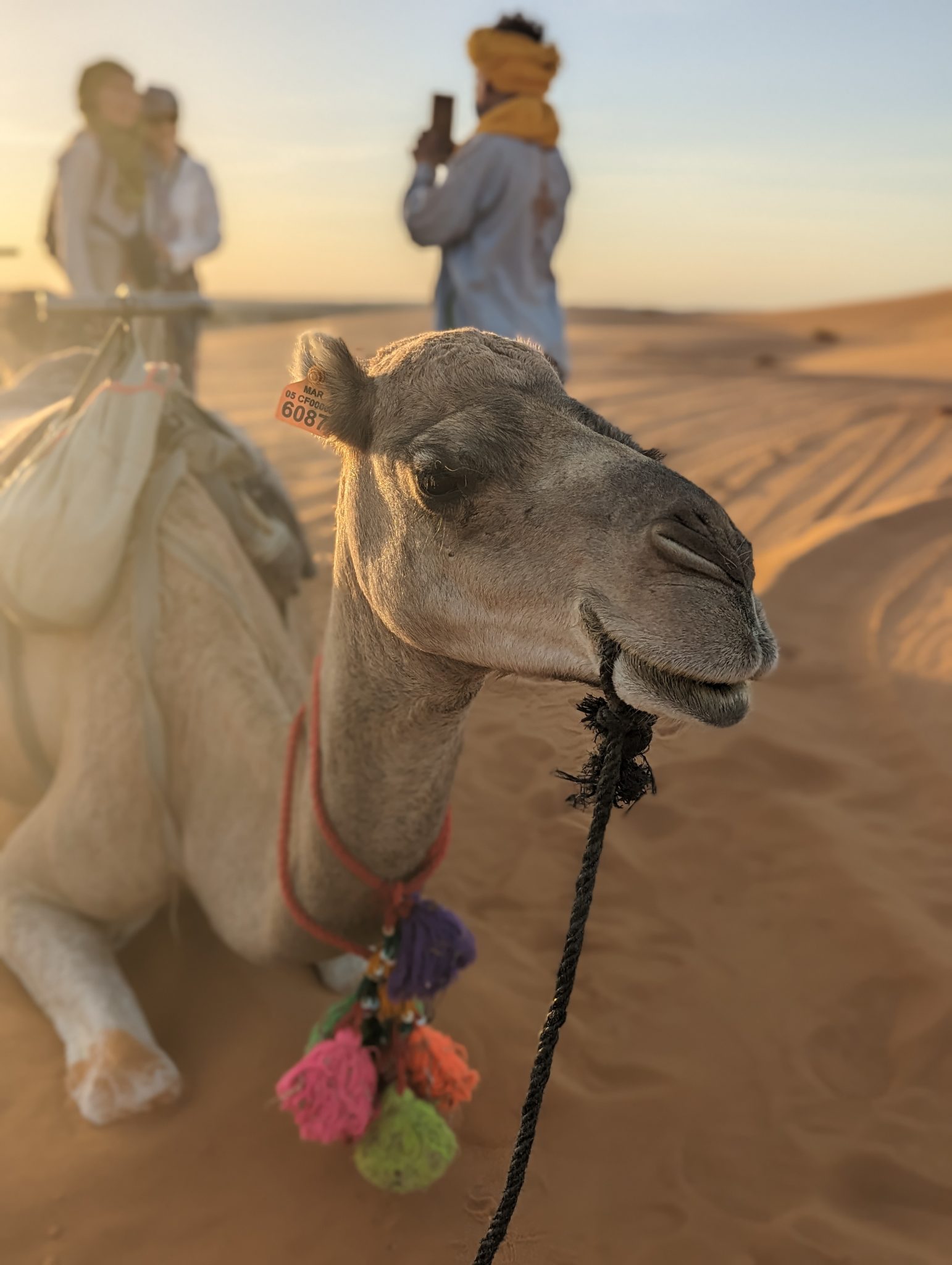 After having an hour or two to settle into our rooms, we had to the back of our hotel where our plan is to ride camels into the desert and watch the sunset! This isn’t the first time Gimpy or I have rode camels before. We’ve done it once in Egypt and another time in Dubai. However this time feels a bit different. Facing “away” from our hotel you see nothing but dunes. On our other rides you’re still near civilization, but in this case you can almost feel like you’re riding into the vastness of the desert! (Though I’m very aware it’s still guided and a part of a tour!)