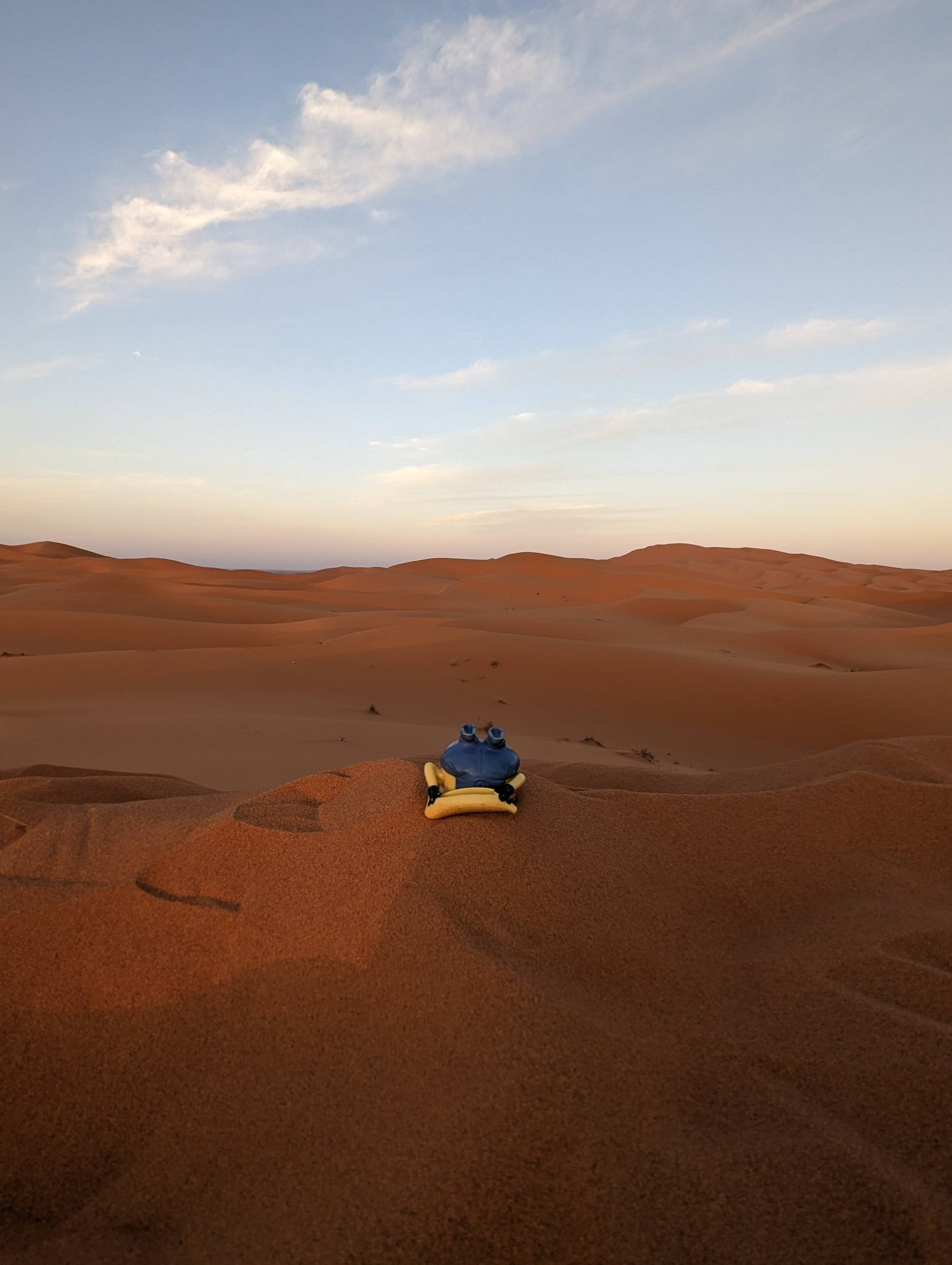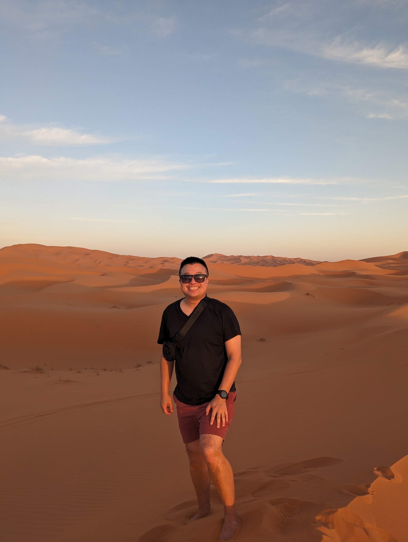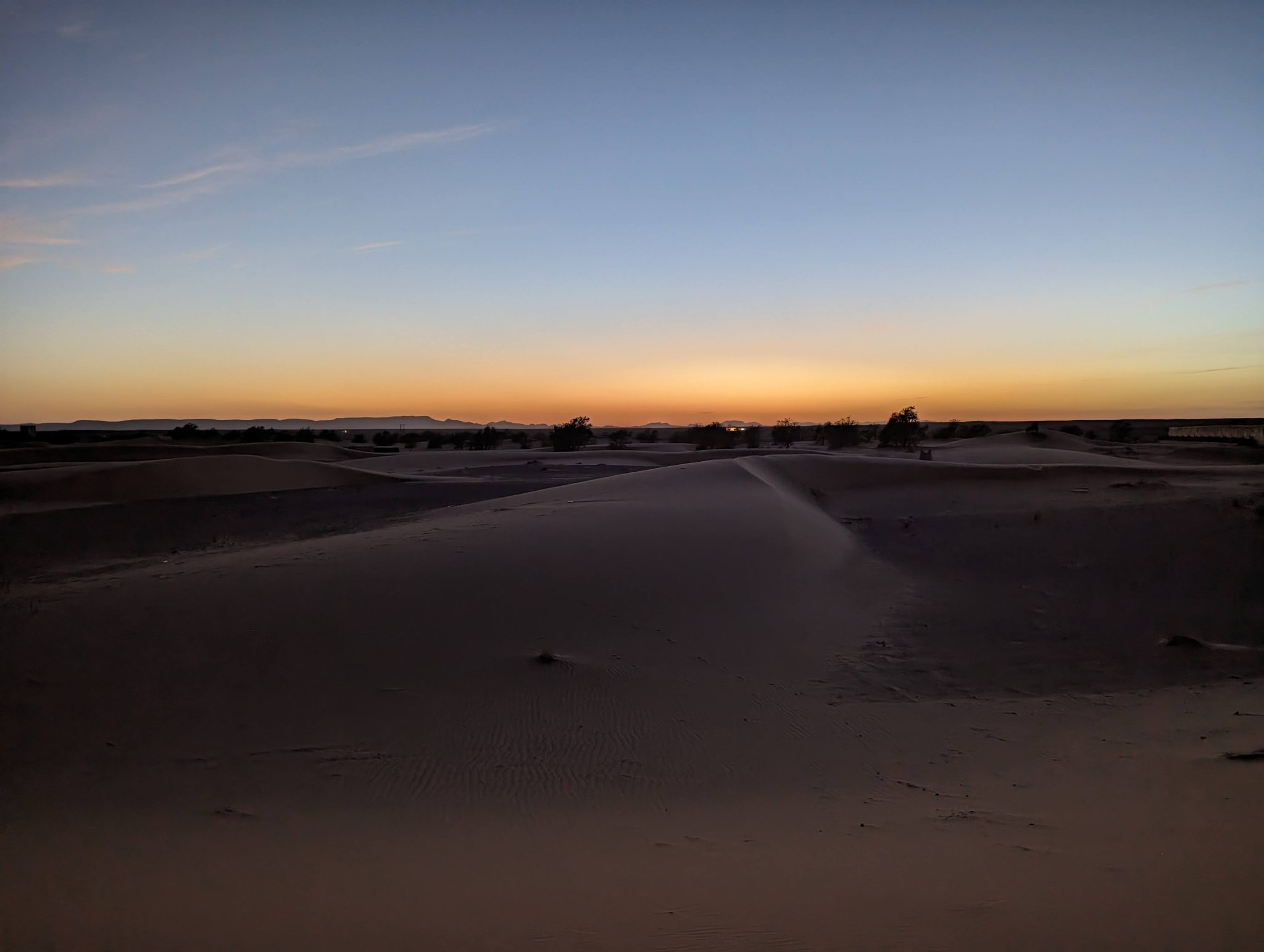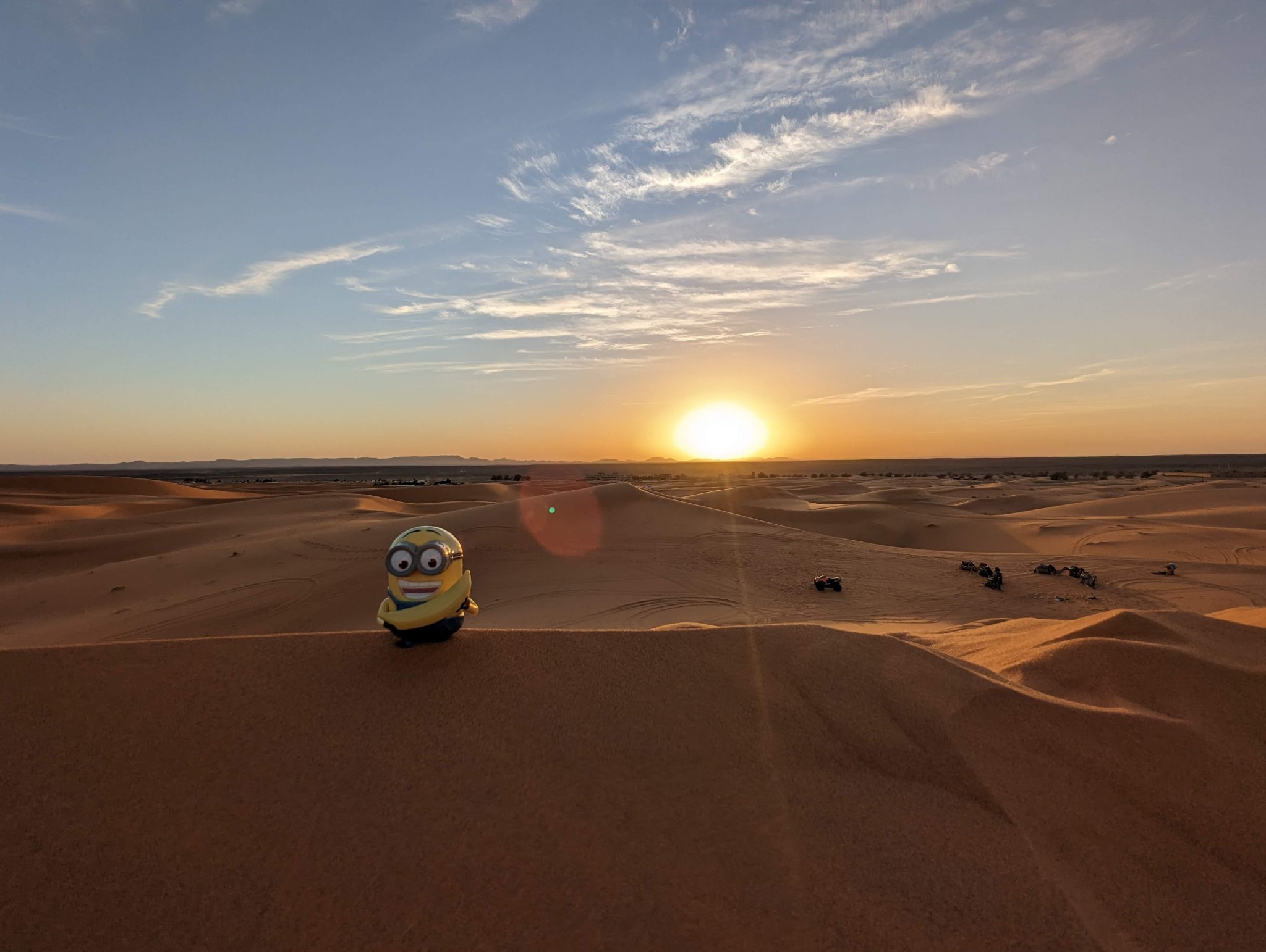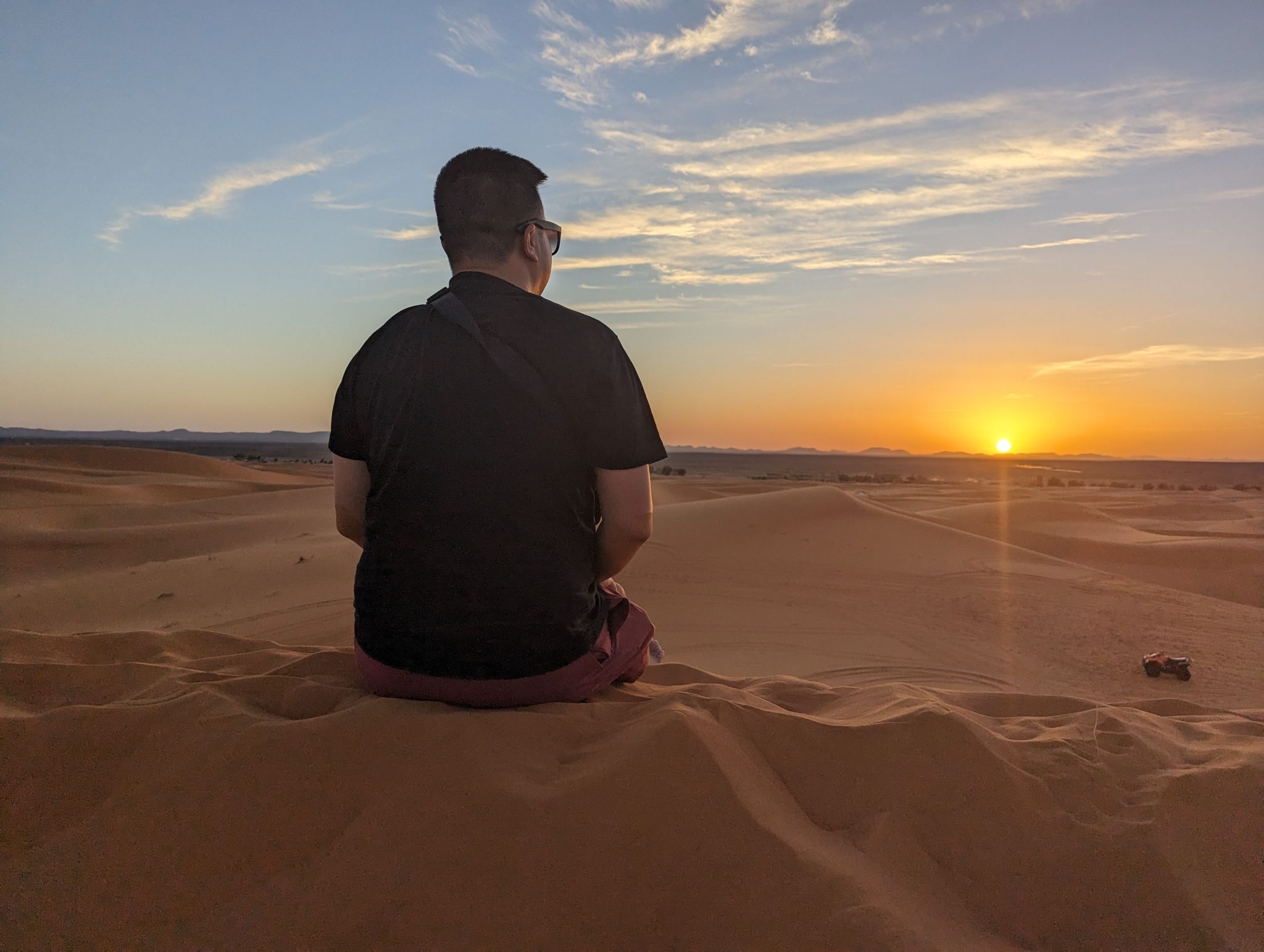 After a bit of a ride we finally stop and dismount. From here we hike up one of the dunes and settle at the top to watch the sun set over the horizon. I’ve been to some very scenic places in the world and I like to think this up there with them! Not only is it an amazingly clear sky (though I imagine this is the norm in the desert). But there’s something about how quiet it is that I didn’t expect. I can only liken it to being up in the mountains whilst snowboarding. Sometimes you might be the only human in the vicinity and things feel and sound incredibly calm. Beyond the conversations and laughing of our group, all you can hear is the light breeze that blows through once in a while.