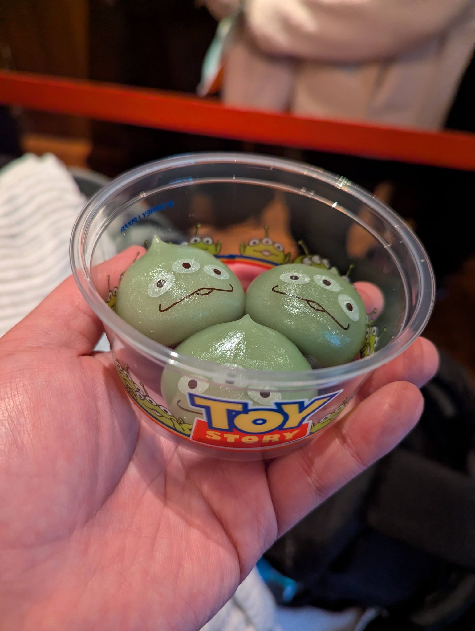 Another popular Disneyland treat are the “little Green Dumplings” that represent the aliens from Toy Story. On our way to lunch we pass by a booth that sells these things so I line up and pick up some to try. They are actually mochi balls with strawberry, chocolate and vanilla filling. They’re tasty and just a very creative way that Disneyland Tokyo does food merch! Kudos!