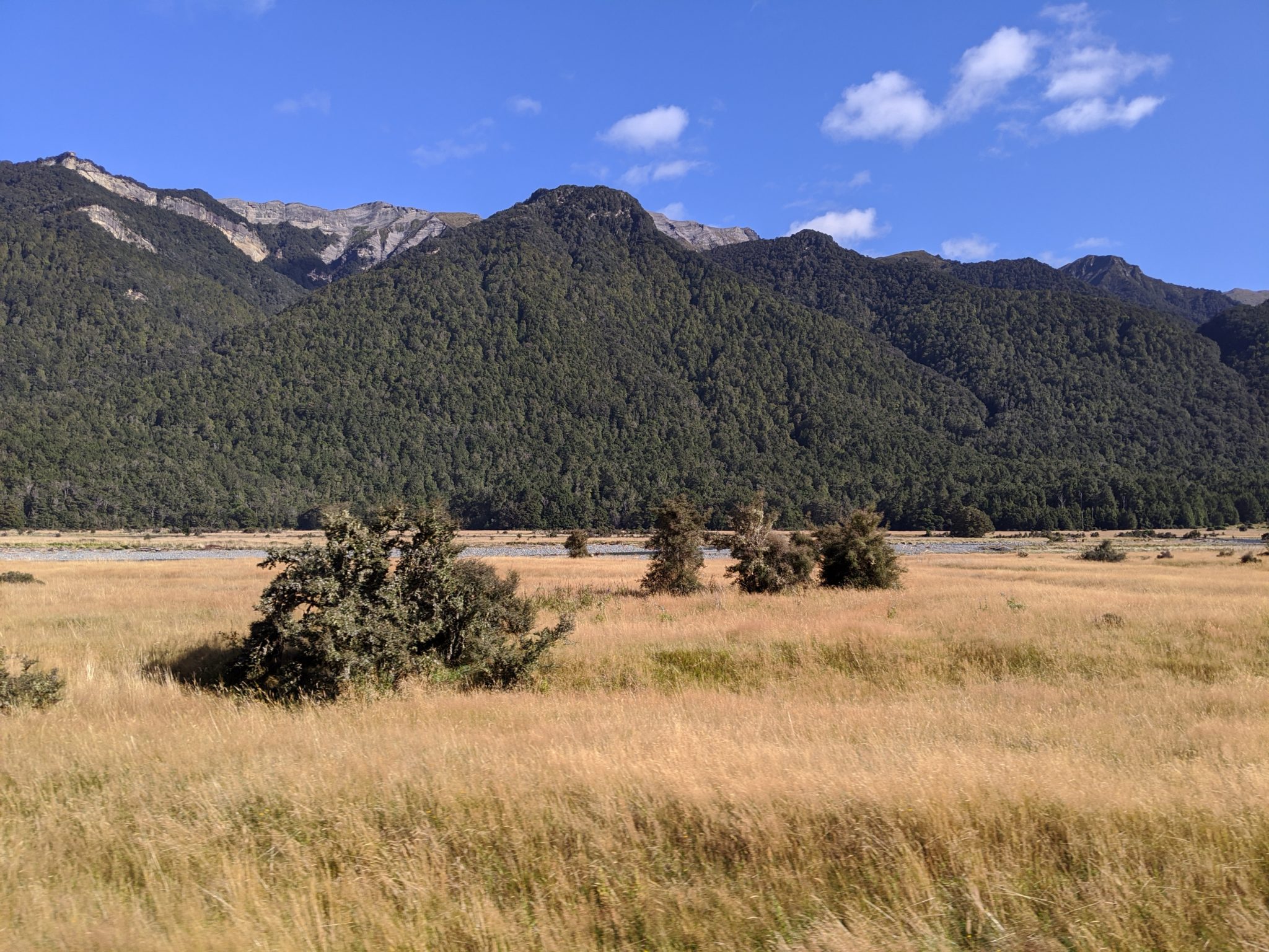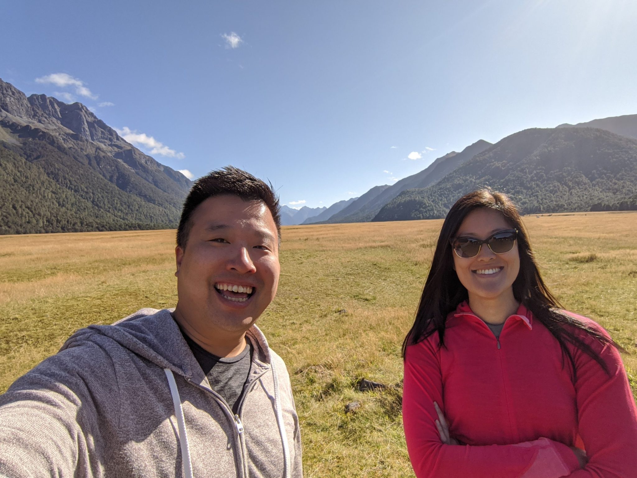 Our first stop on the route is Eglinton Valley. This is a HUGE flat grassy valley that was once carved out by glaciers. Normally seeing the surrounding mountains, I would expect to see a river running between them. But this grassy meadow is a welcome surprise and super vast. In one of the photos you can see how big it is compared to some people off in the distance. This was our first taste of the sights along the road and we were amazed!