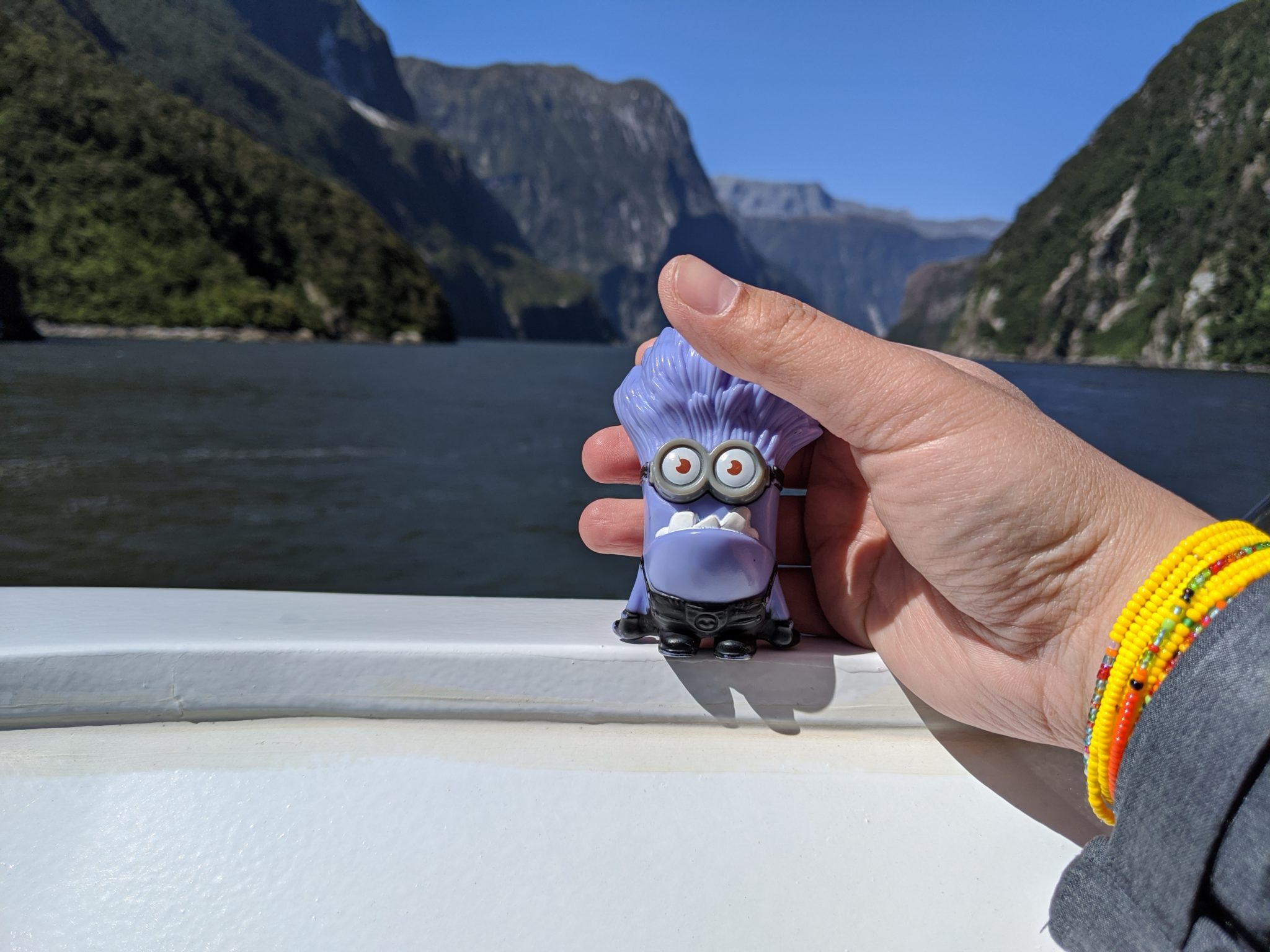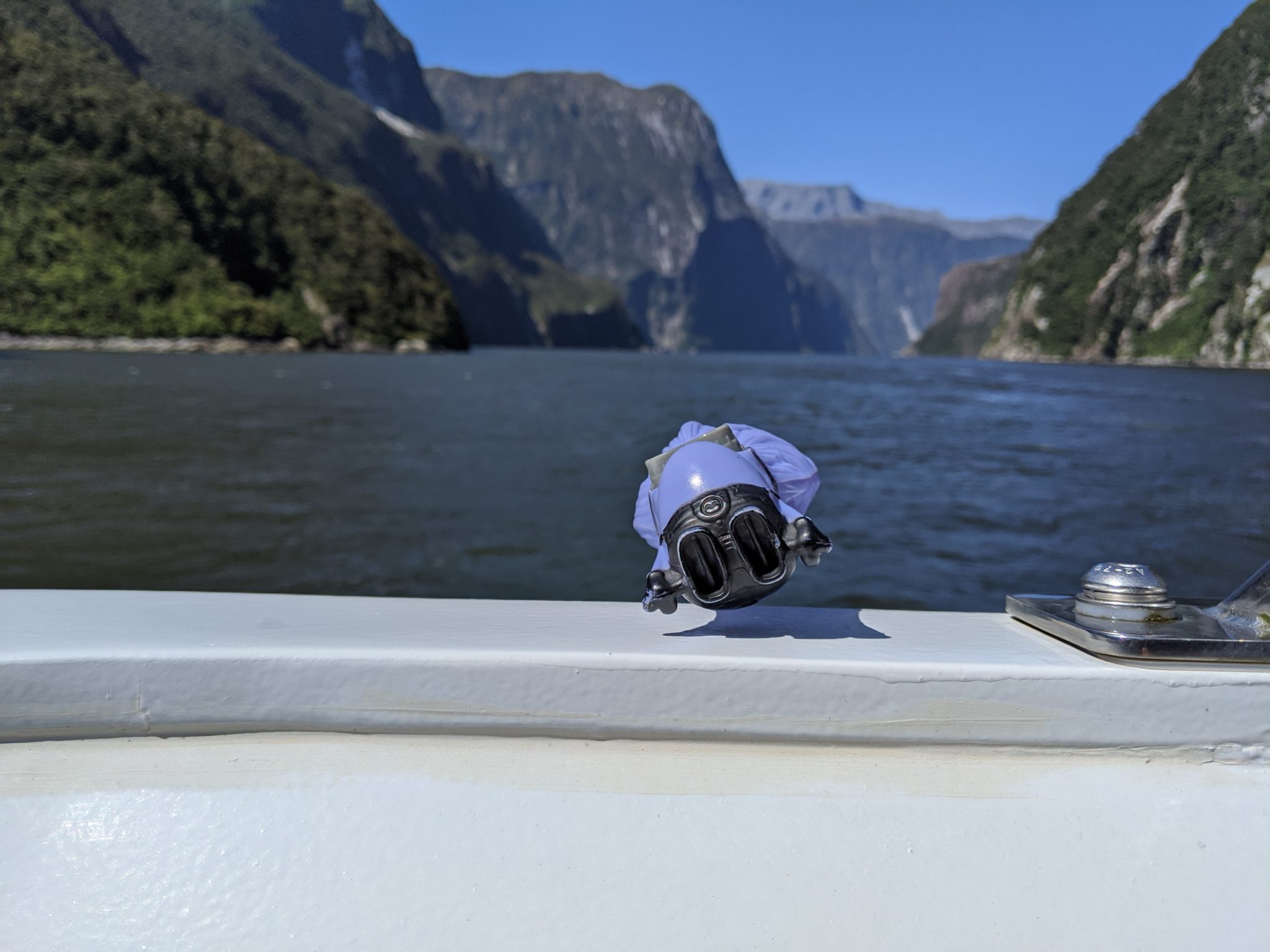 It’s at this point where I wanted to take a photo with one of my minions! Sadly, with the boat moving and the wind blowing I just couldn’t keep our beloved purple minion stable on the edge. So it is with great regret that I’m here to announce that the purple minion took a tumble and won’t be making the return trip back with us. Humorously, I did capture the moment “it happened” for posterity. Farewell purple minion may you be eternally travelling, wherever you are! Before you ask, thankfully I do have one or two replacement minions waiting in the wings, so I’ll be back to my full compliment of travelling companions on my next trip!