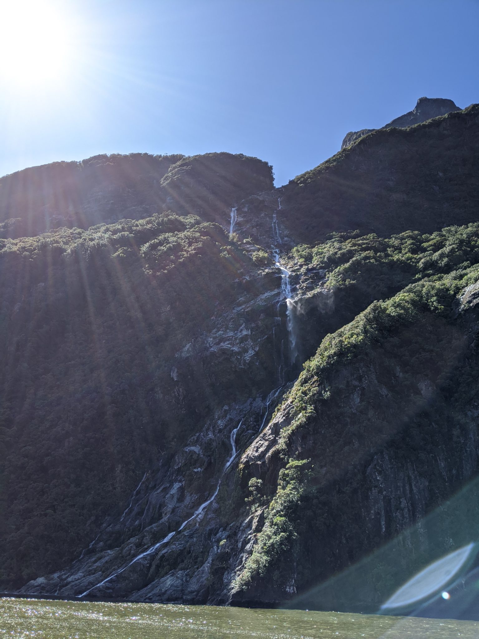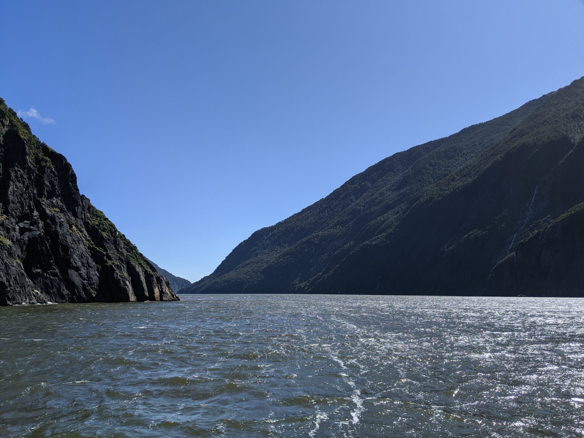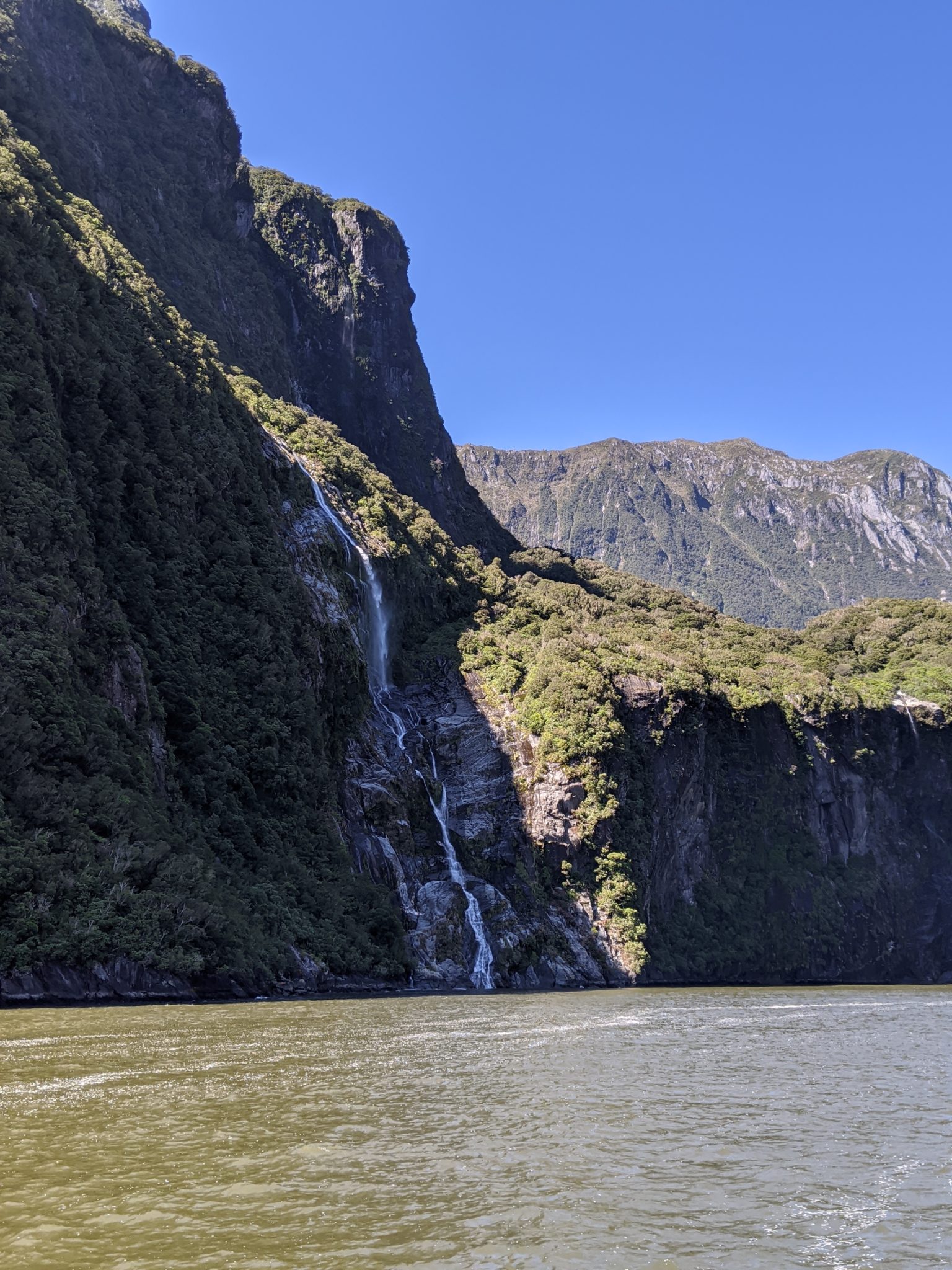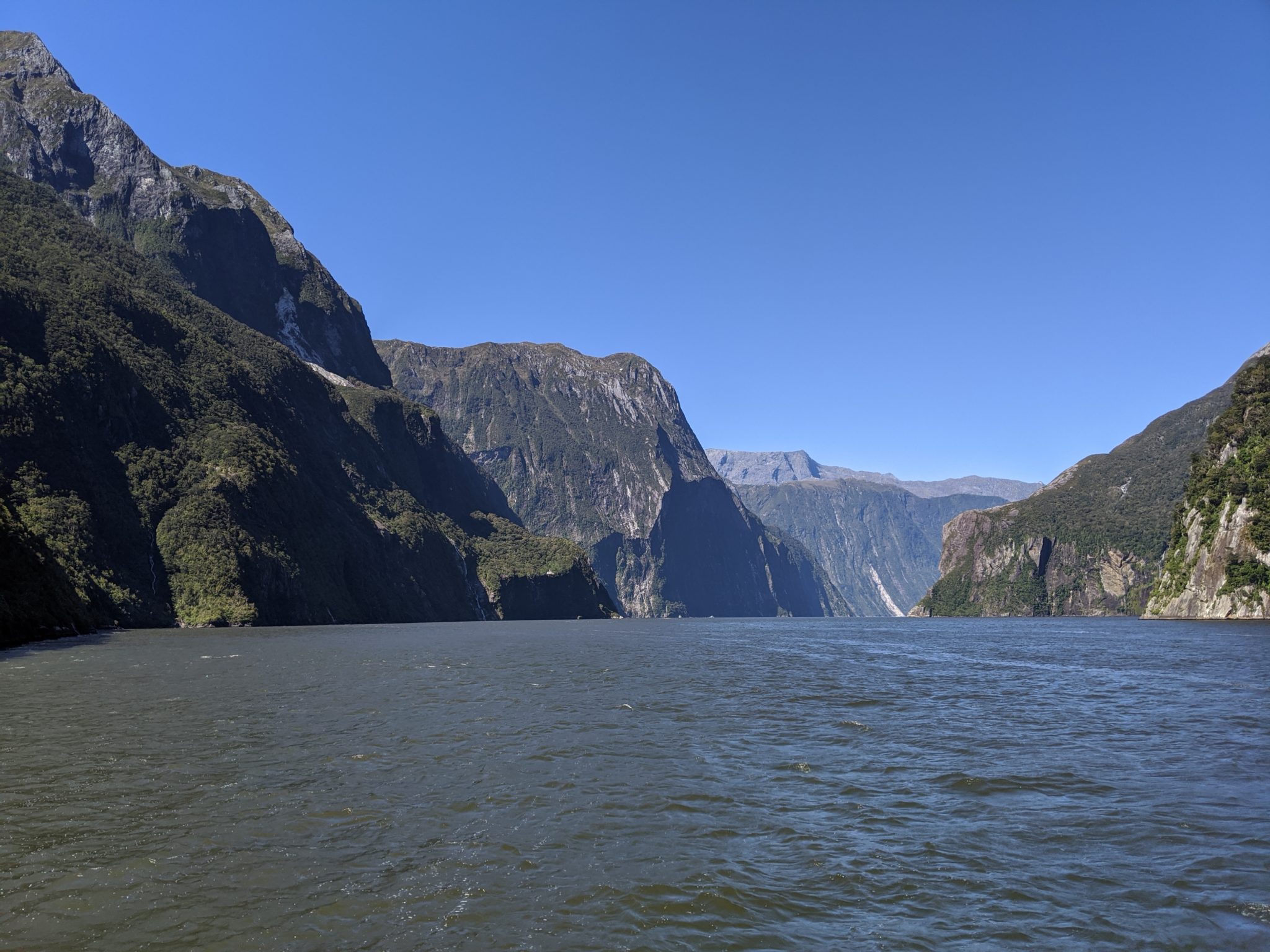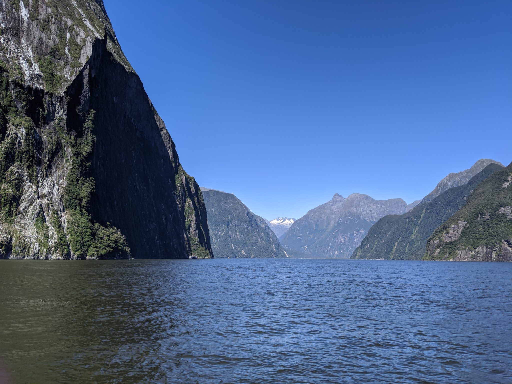 After taking a moment to mourn the loss, I recompose myself and make an effort to enjoy the return trip through Milford Sound. I will say that I think the return leg is prettier than the outbound leg. There seems to be more interesting landscape features like more waterfalls in the distance and valleys that lead into mountains.
