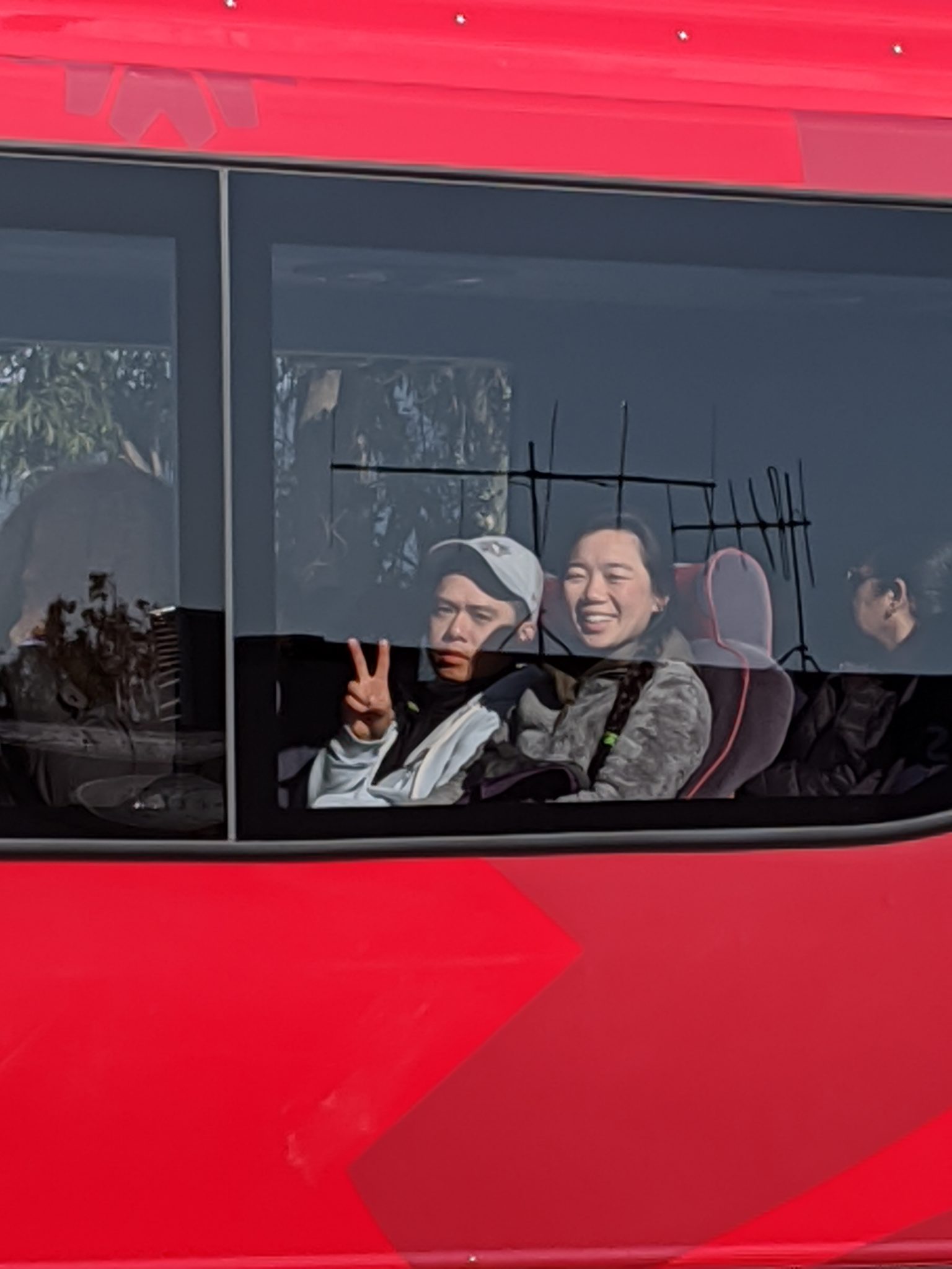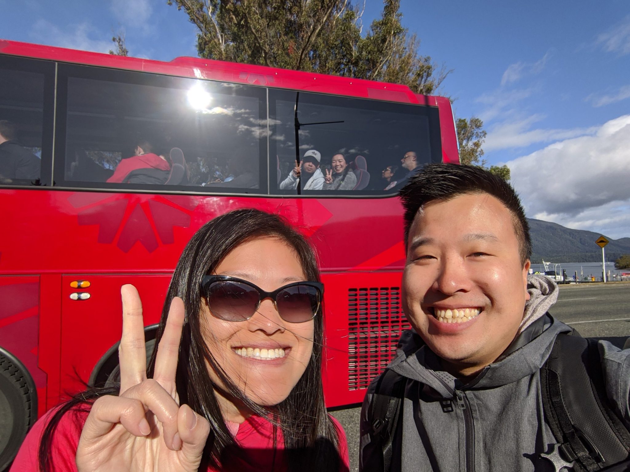 The pickup point for our bus is in Te Anau and after finding free parking in the street, waited for our bus to arrive. Coincidentally, we found two friends travelling through New Zealand as well! They were with me at Physio’s wedding in Australia and then did a honey moon trip through New Zealand too. Gimpy and I kept tabs on them throughout their trip. Throughout our trip we ended up leap frogging each other on our way from the North to the South. While we weren’t on the same bus we were headed to the same place, but to spot them while walking by their bus is quite fortuitous!