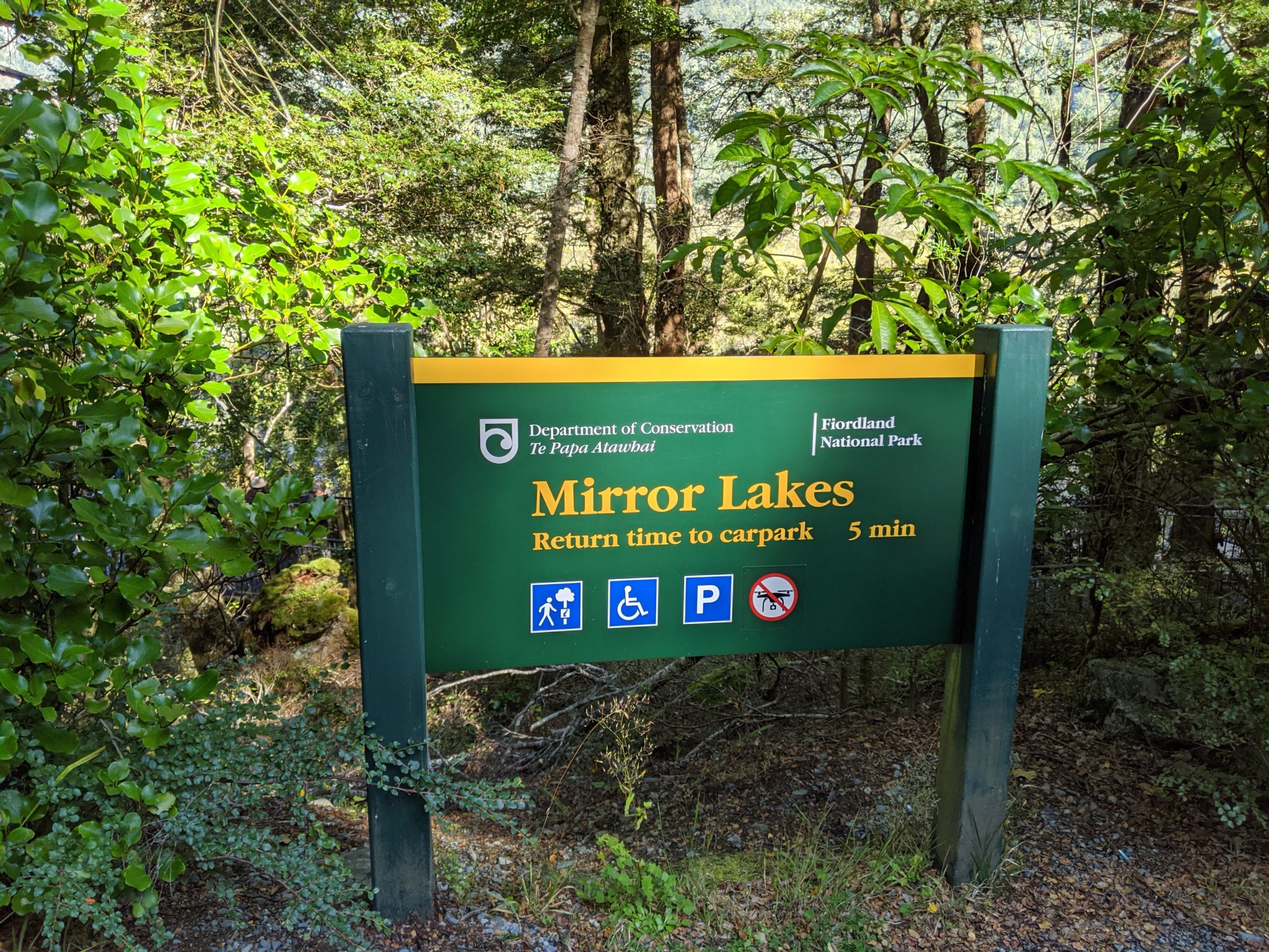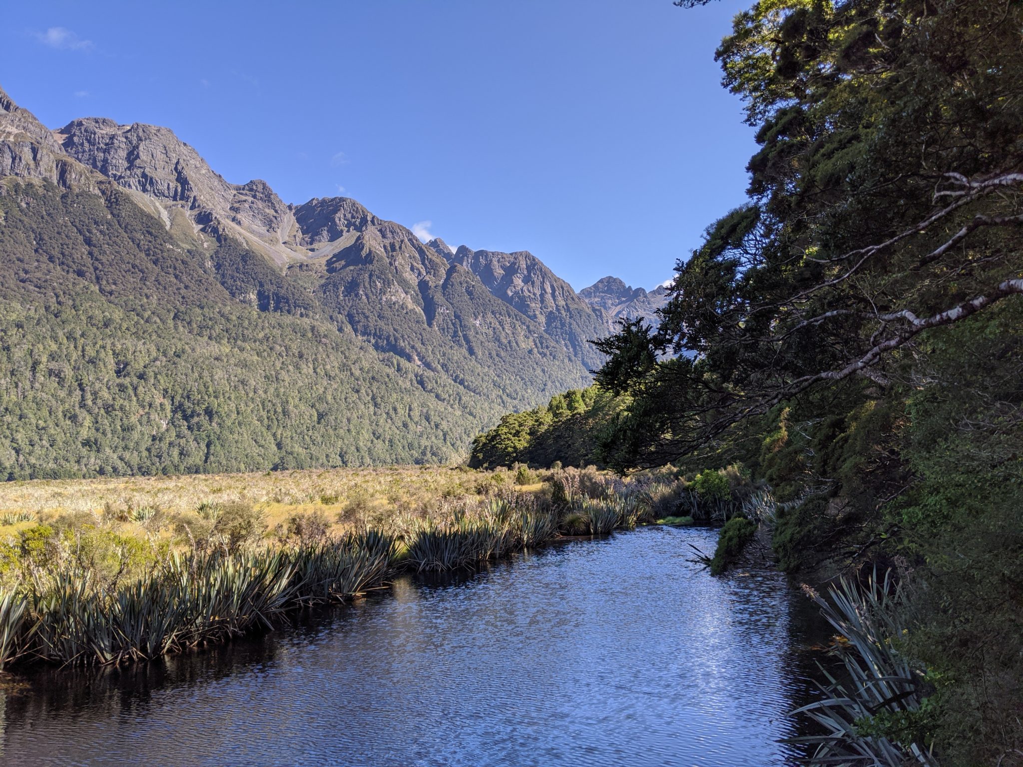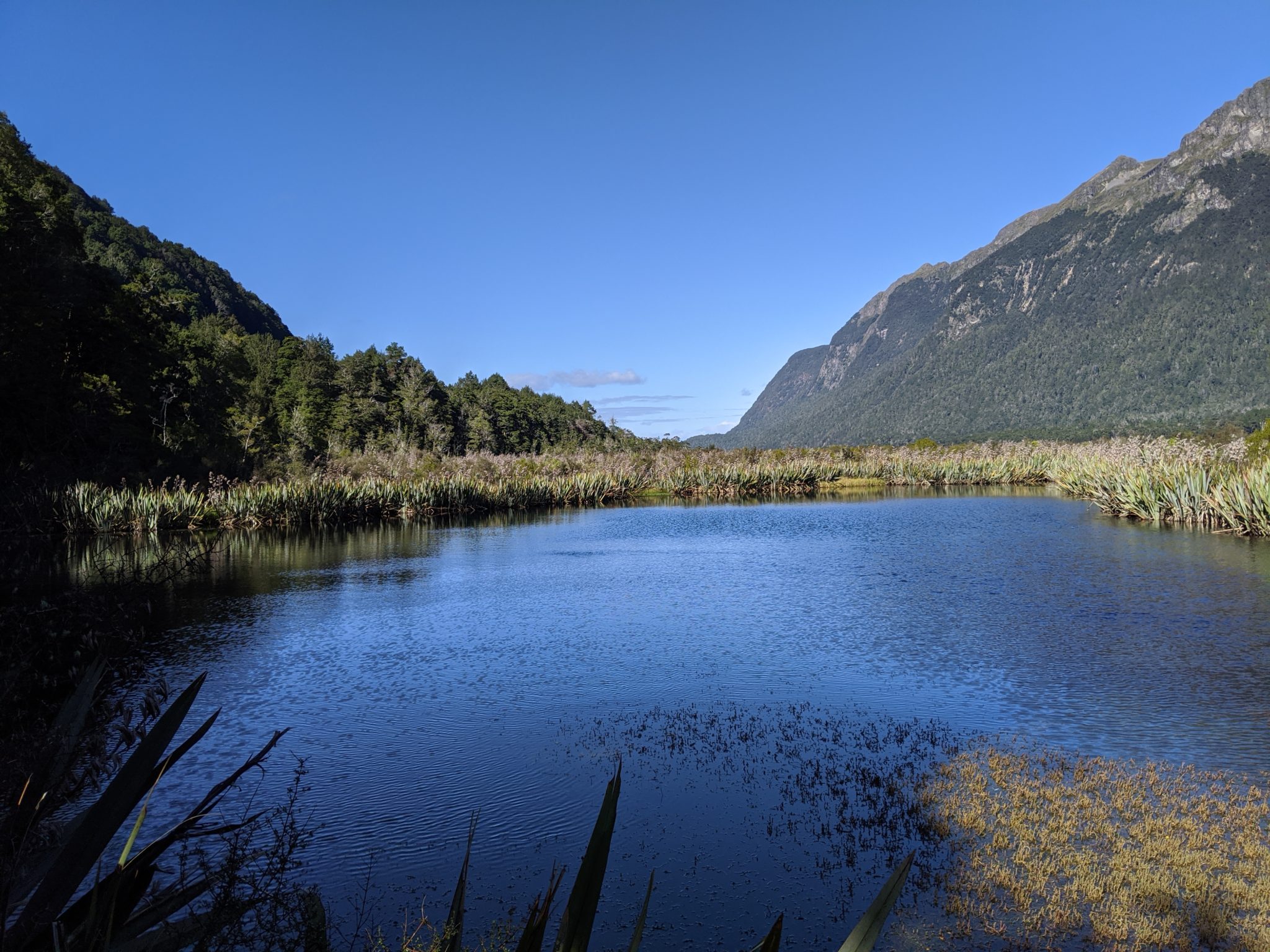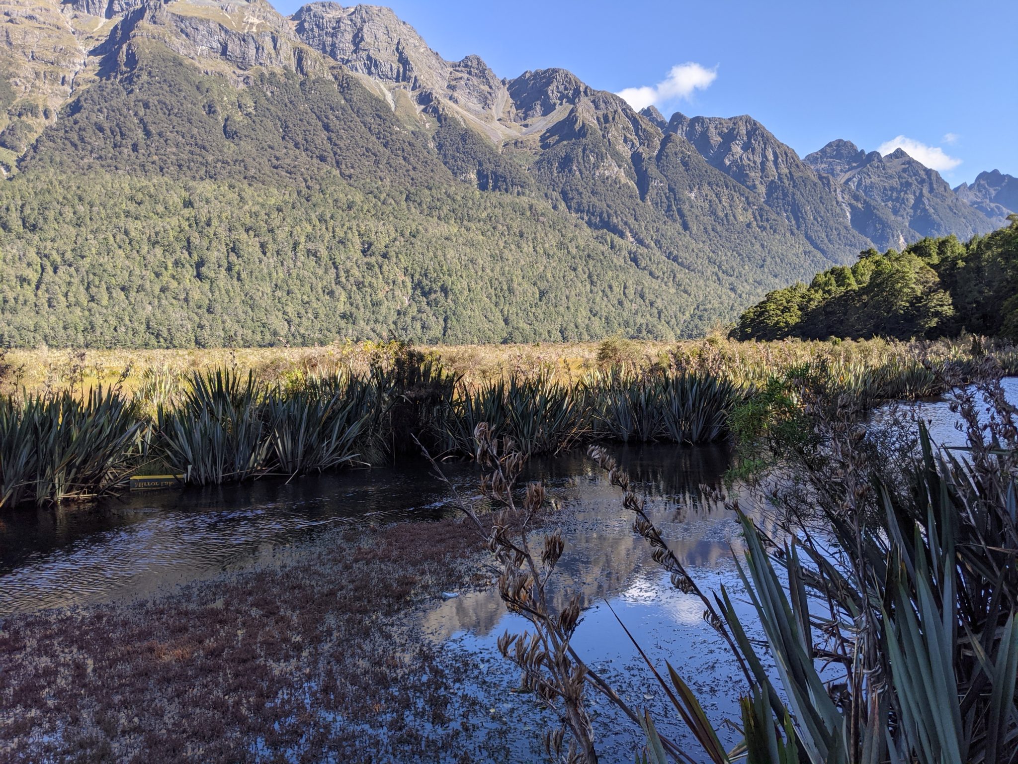 About a half hour after Eglinton Valley, we made our second stop at Mirror Lakes. This is a small set of lakes in the valley, and I suspect is supposed to be very reflective. However, today is quite windy and there were more ripples than reflections. Nonetheless I did get a glimpse of some reflection and can see why this would be a beautiful stop on a calm day.