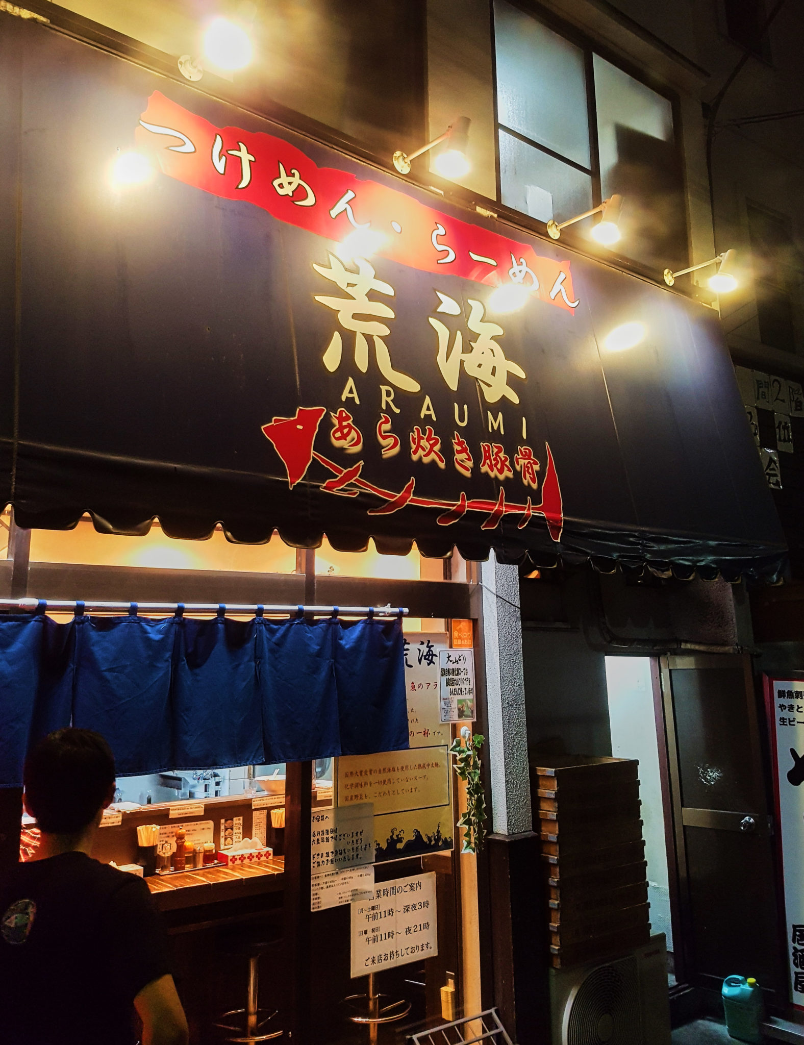 After leaving our room and wandering a bit. we saw a small alley that had a few small restaurants. We decided to check out the menus, and chose this small Tsukemen/Ramen shop called Araumi. It was very cool in that there was a single cook and a bar that sat at most 8 people. You order and pay from a vending machine that prints a ticket which you give to the chef to start your order. We both ordered the Tsukemen ( a noodle you dip into a small bowl of sauce) . It was really good! From what I hear you can’t really go wrong with food at any place in Japan and if this was any indication, Japan and I were going to be good friends by the end of this trip.
