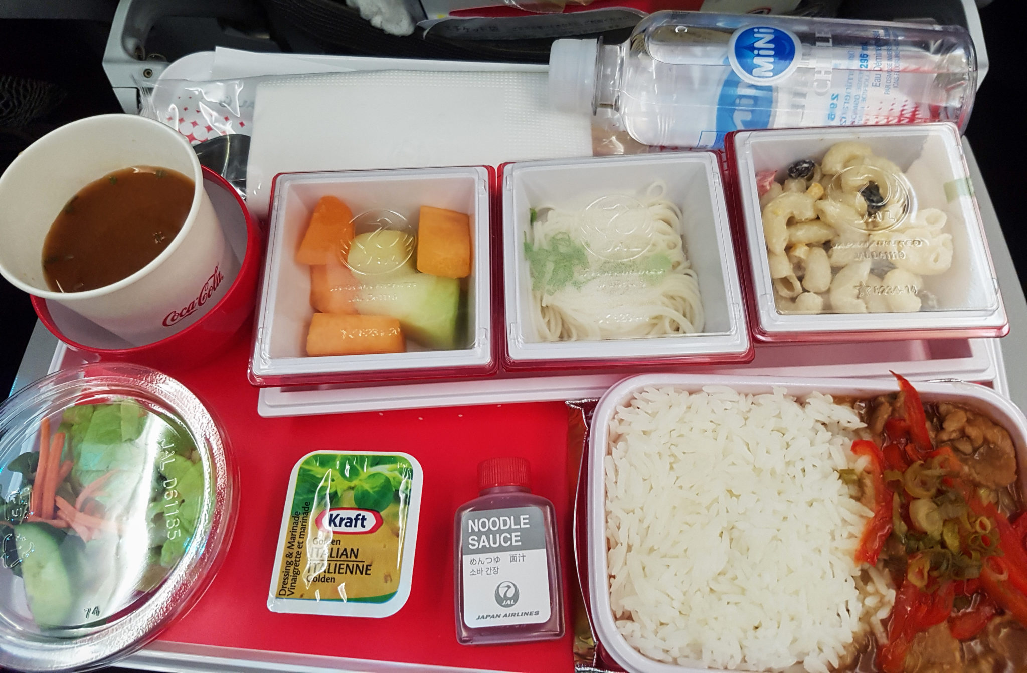 Additionally the food was amazing. I always look forward to seeing what the different airlines have to offer and JAL impressed! We were served both a miso soup with the meal and a follow up broth at the end. In between we had a fresh assortment of fruits, a very crisp salad, an average potato salad (the only let down if I was being nit picky), a great pork and rice dish and a cold noodle with a noodle dipping sauce. I wasn’t expecting the dipping sauce noodle, but it was a great little treat that made the meal unique and prepared us for the Japanese adventure ahead.