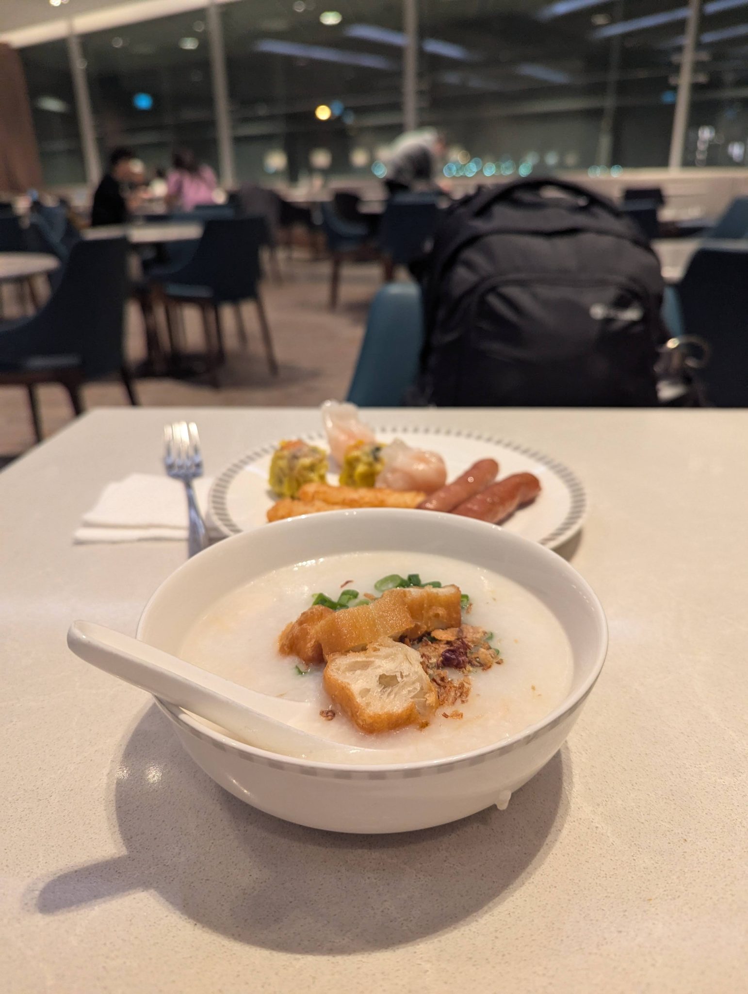 After landing in Singapore I have a few hours to kill before boarding my next flight. It’s sadly not enough leave the airport and explore Singapore so I spend most of my time in the SilverKris Lounge. I take a shower which is great after a long flight and get to the food in time for breakfast! I love that they have congee in the lounge which is a huge comfort food for me. I happily enjoy breakfast along with a very tasty coffee with a view before heading off for my next flight.