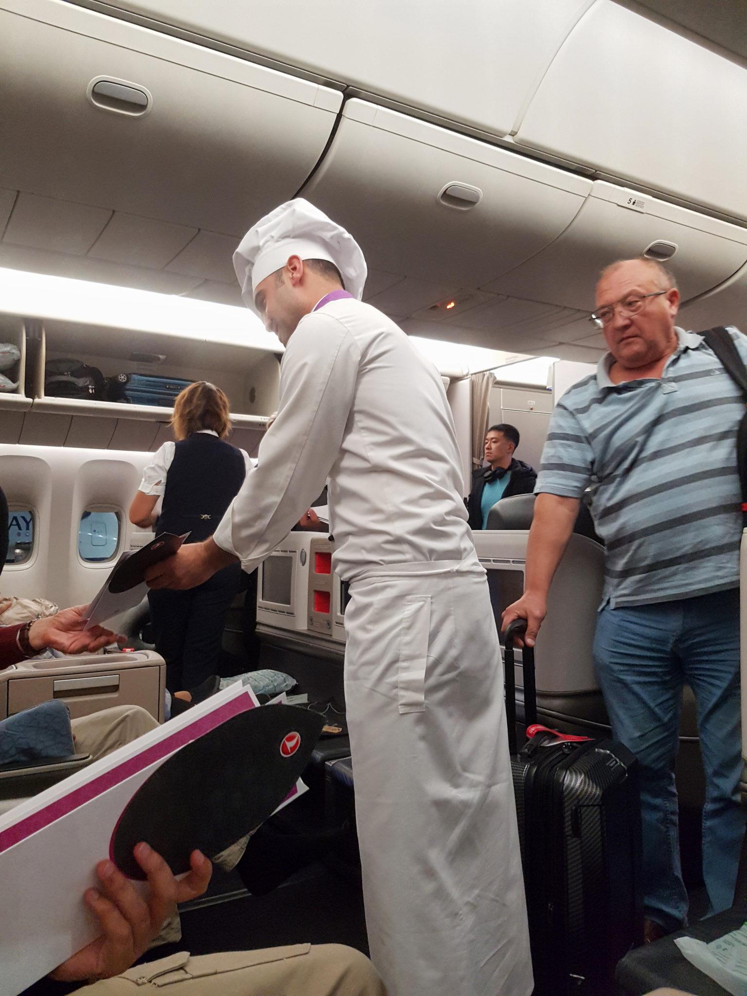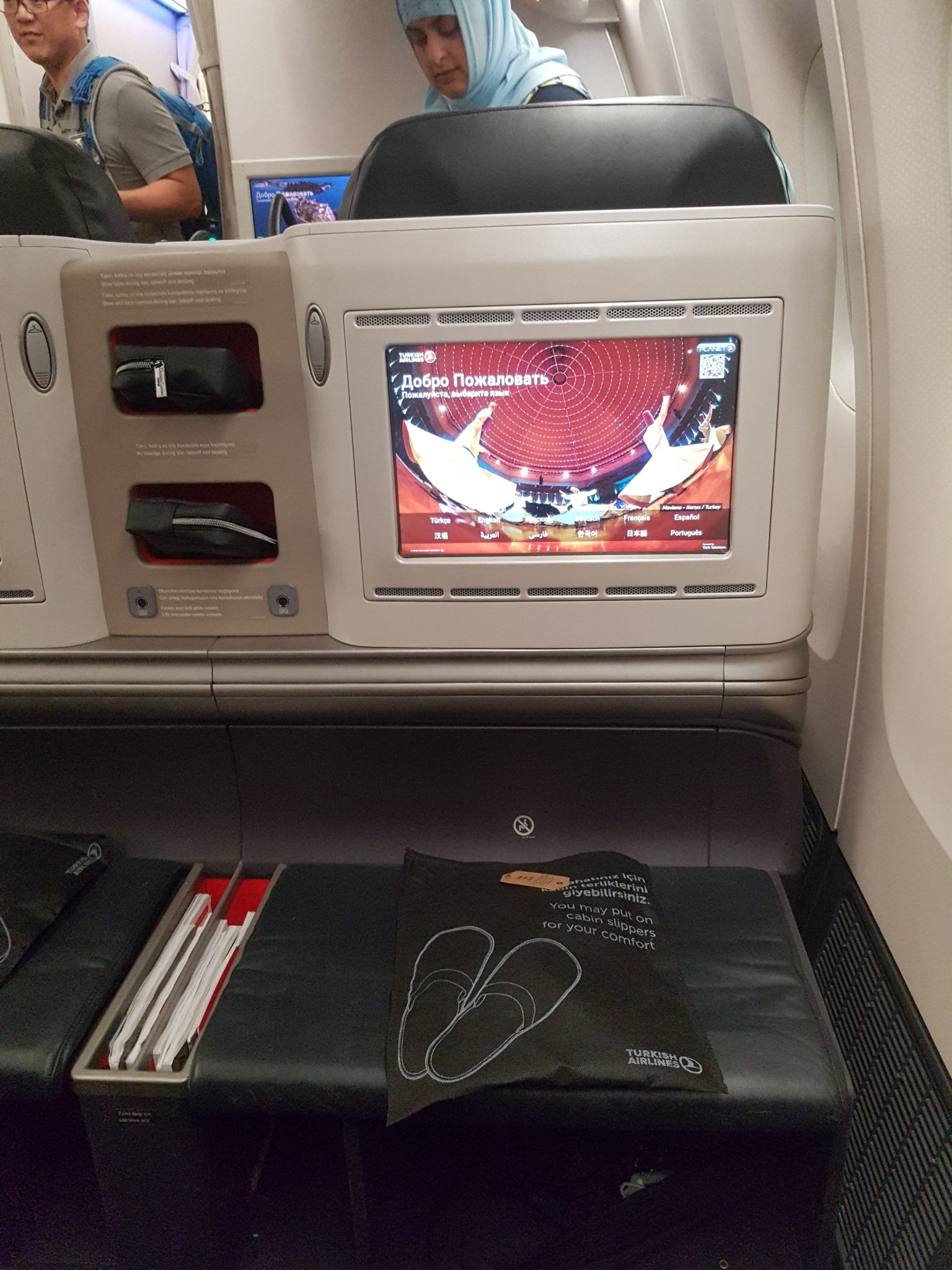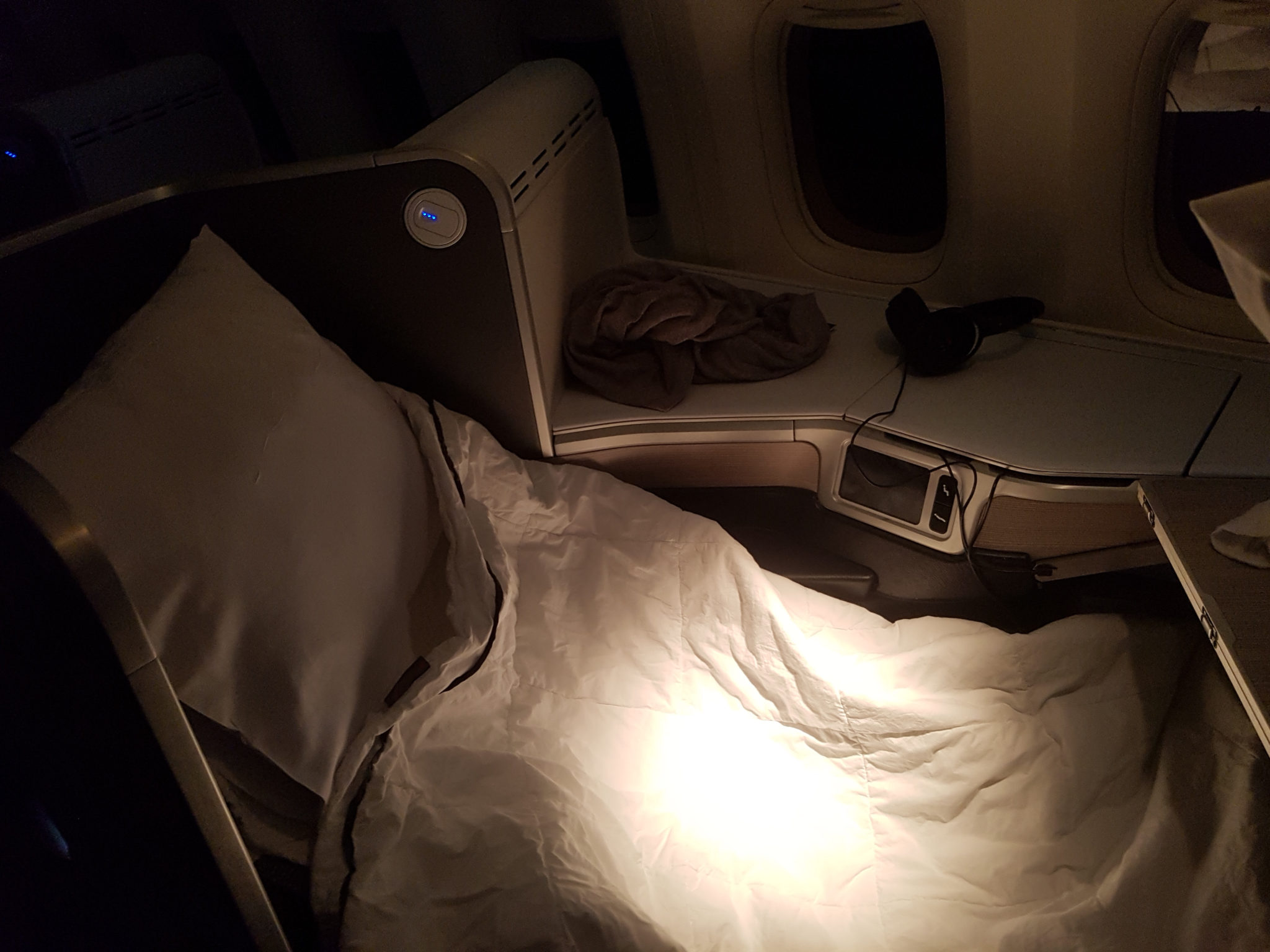 I was excited to try this flight as I’d heard and read many amazing things about it. Of note are the fully lie flat beds and their exceptional meal service with on board chefs! Once I arrived I was allowed to pack away my shoes and use the provided slippers.