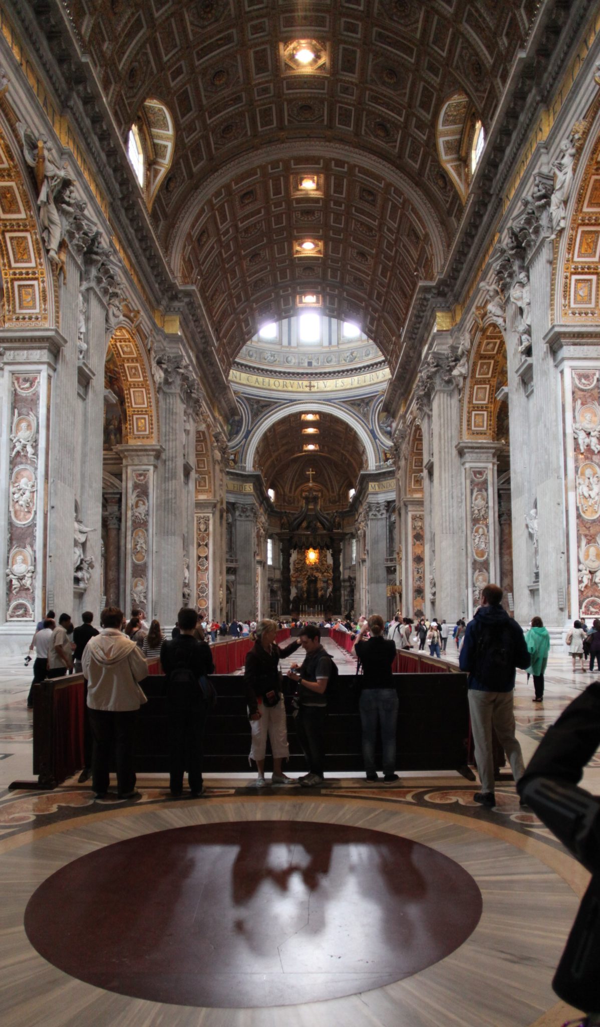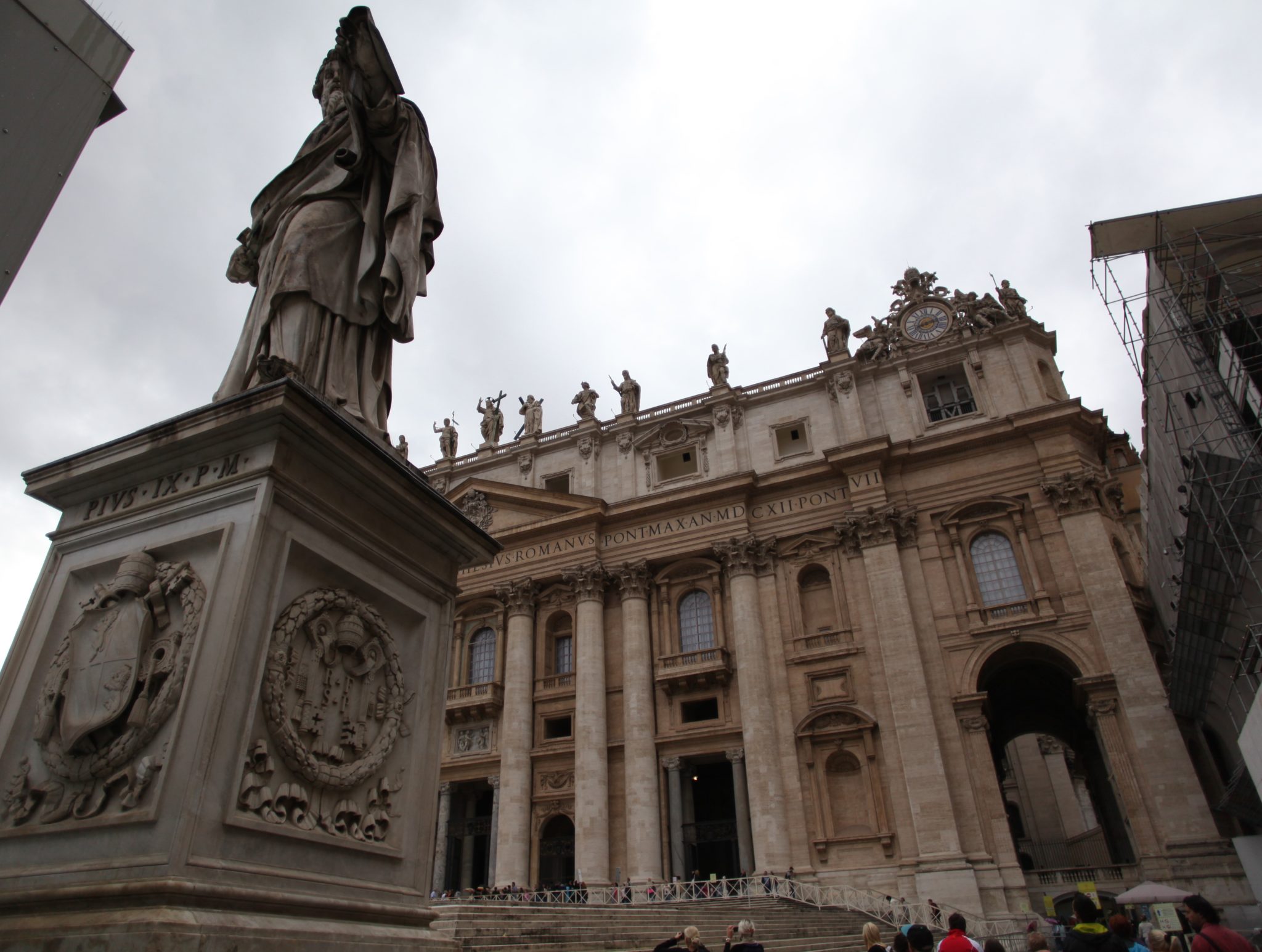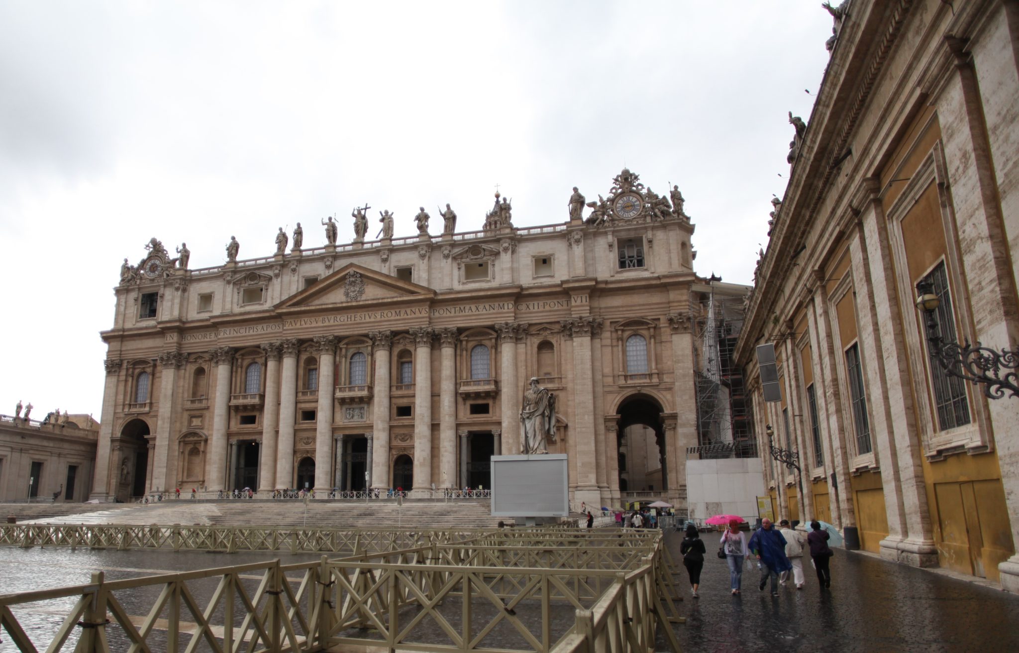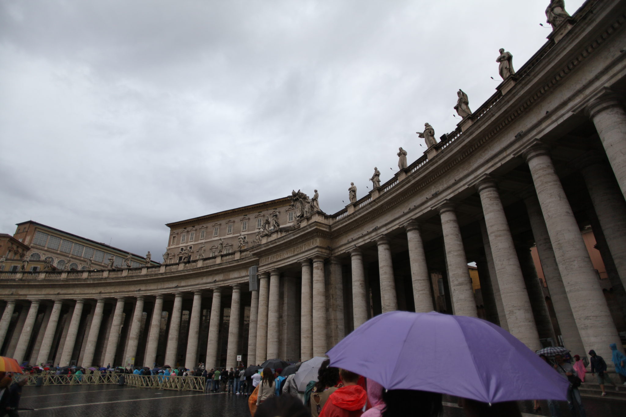 Our next stop was Saint Peter’s Basilica. In front of the basilica was Saint Peter’s Square. This was a massive courtyard flanked by large Romanesque structures. I’ve only seen this square in movies (disaster movies come to mind right now when all is lost and people gather in the square to pray) but standing in the square and seeing how grand it really is, is something to behold. Thankfully for us it had been raining on and off that day and the “tourist density” wasn’t as high as it normally would be. This meant a shorter line to get into the basilica and less people crowding the square. (Even so, there were still a great deal of tourists!)