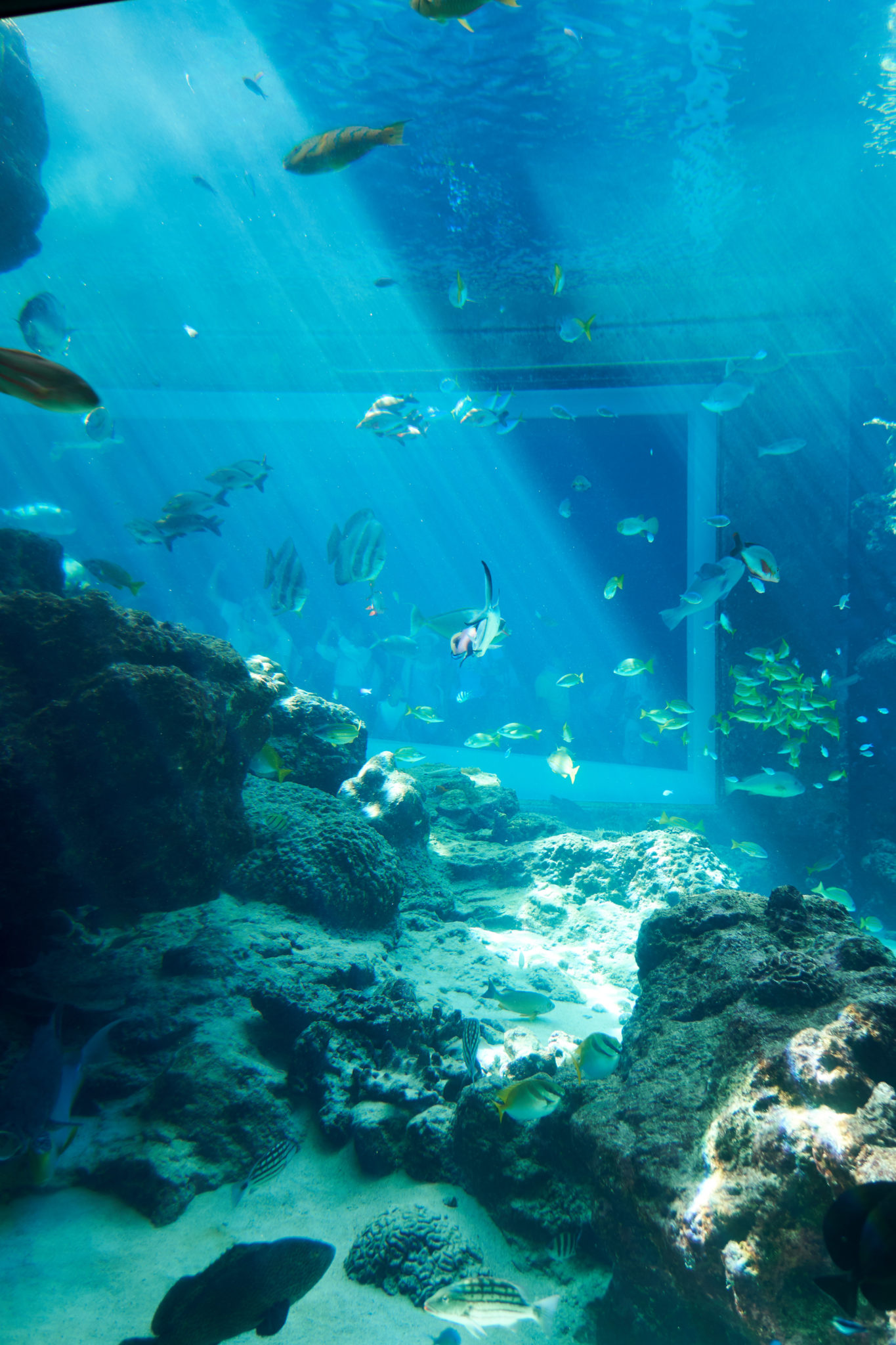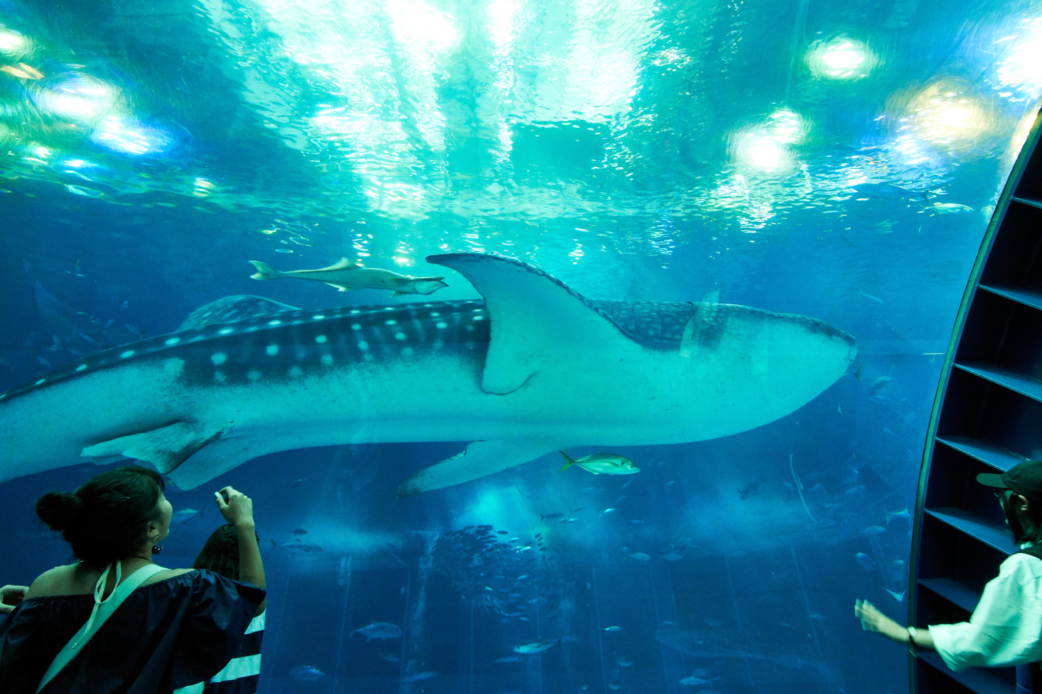 About halfway through the aquarium the hallway opened up to a large room. From there we were able to see the big tank the aquarium was known for. Inside were two huge whale sharks along with a large variety of other fish and large manta rays too!