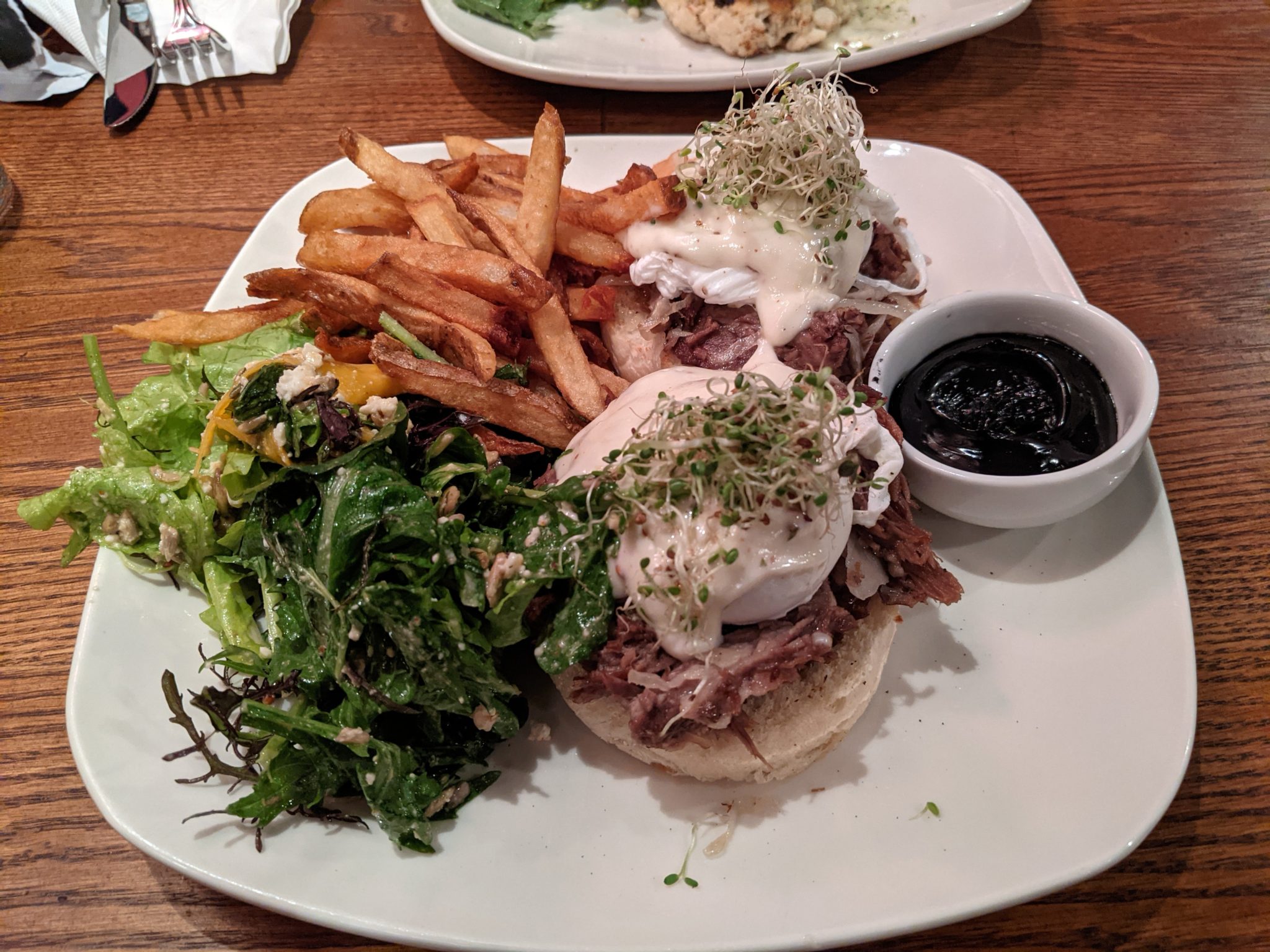 After a few hours of walking we decide to head to Black Sheep. This is a restaurant that is recommended by the hotel and some blogs I’d read. The restaurant itself is pretty busy, but thankfully we are able to get seats pretty quickly! We order some brunch items and a few appetizers to share. Everything is very tasty and we devour most of the food! One notable item was this squid ink mayo that they serve with the fries. It doesn’t taste too different than regular mayo. However it is a bit of an experience to dip your fry into this black sauce and eat it!