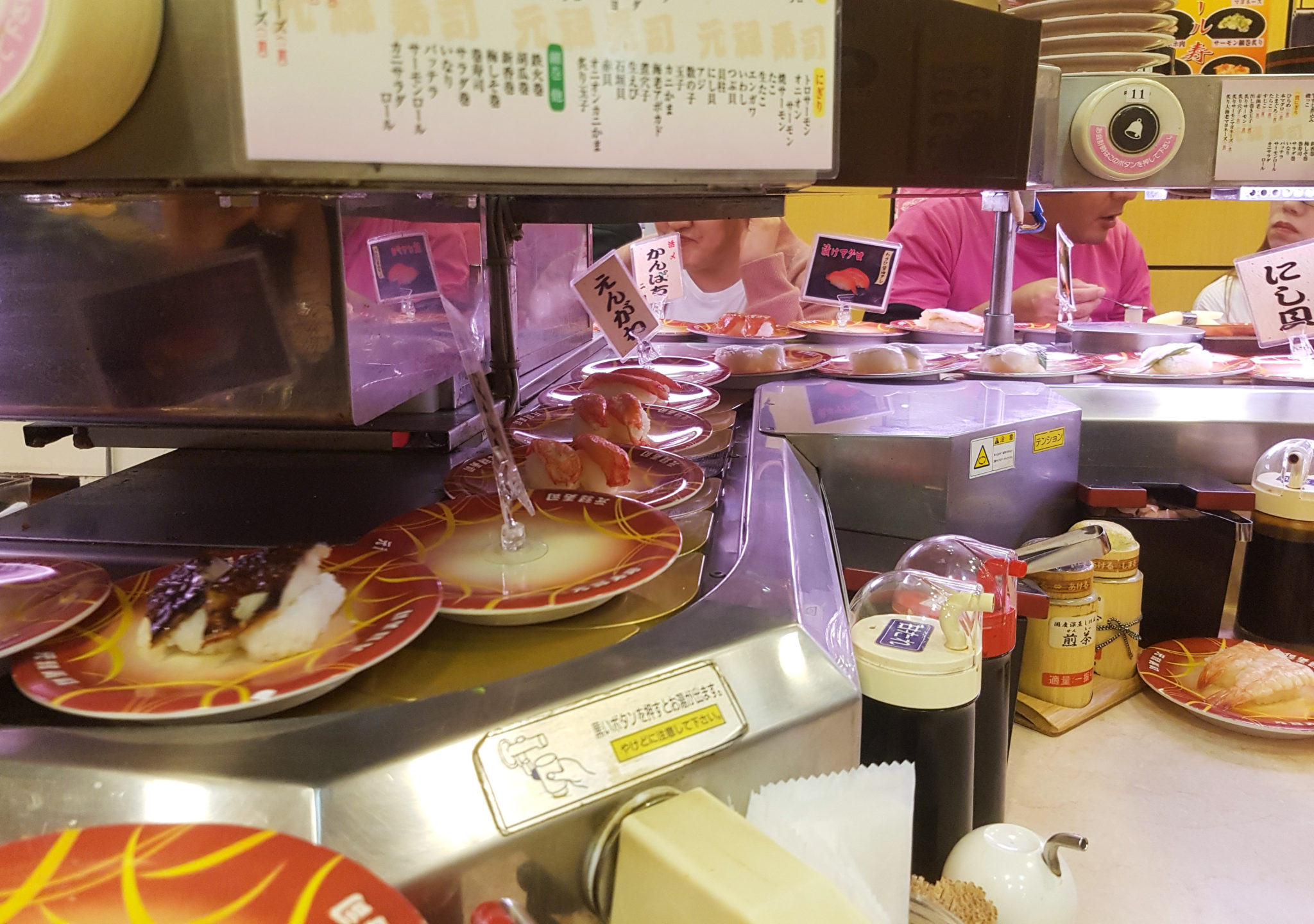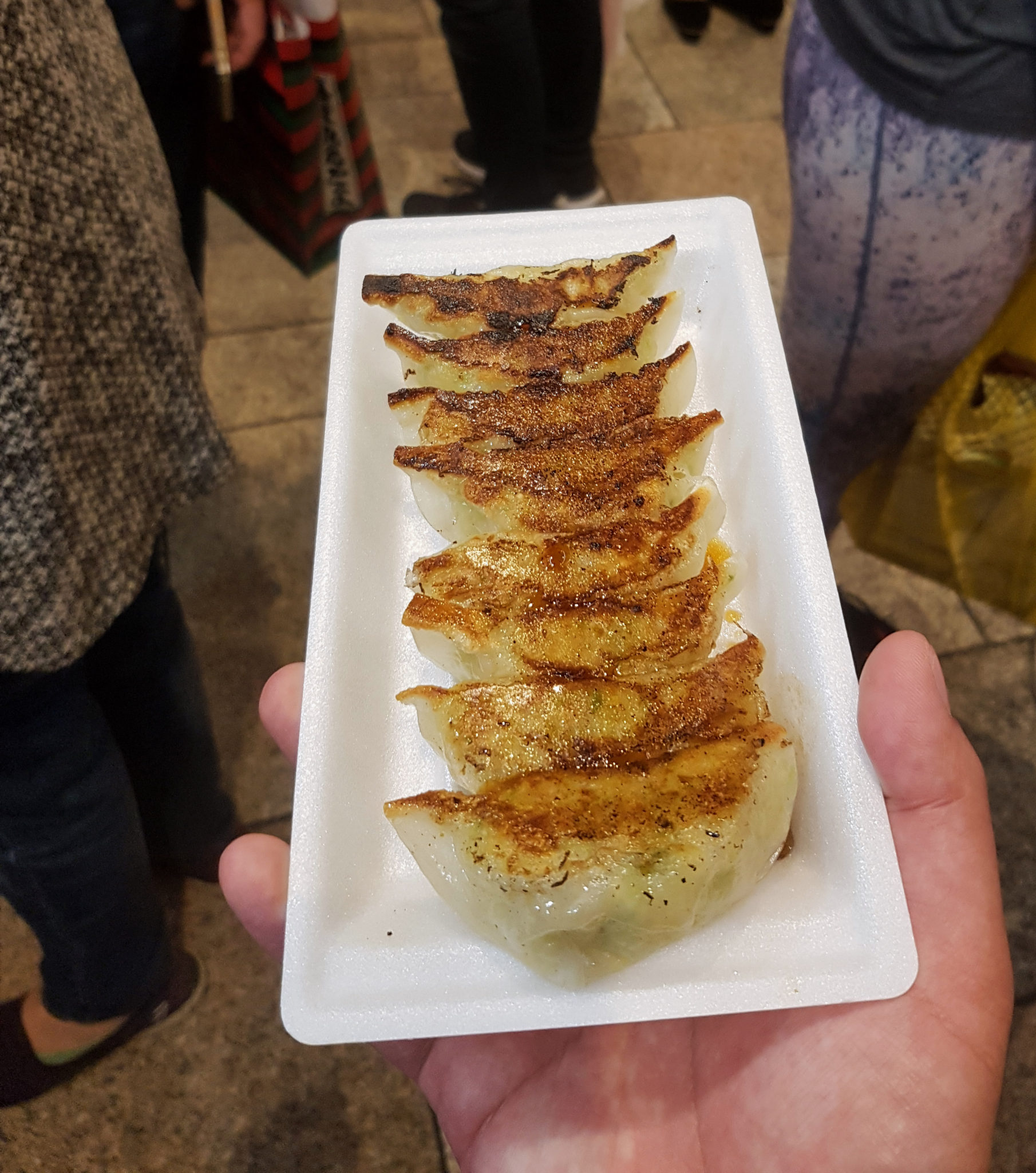 We were losing light and decided it was probably time to head back to Osaka. It’d be my last dinner in Japan. We really enjoyed the conveyor belt sushi at Genroku Sushi, so we headed back there and really gorged ourselves again! I’m glad we walked so much this day because it made eating feel a little less guilty! We needed to walk off the food we just ate so we again decided to walk around Dotonburi. One thing that I hadn’t gotten throughout my trip in Japan was gyozas! It just so happened that as we were walking we walked by a small gyoza stand. I wasn’t hungry at all, but ended up getting it just to say I did. I wasn’t super impressed as it didn’t seem too different to what we have in Canada, but I’m glad I checked it off the list!